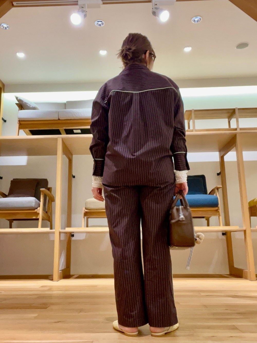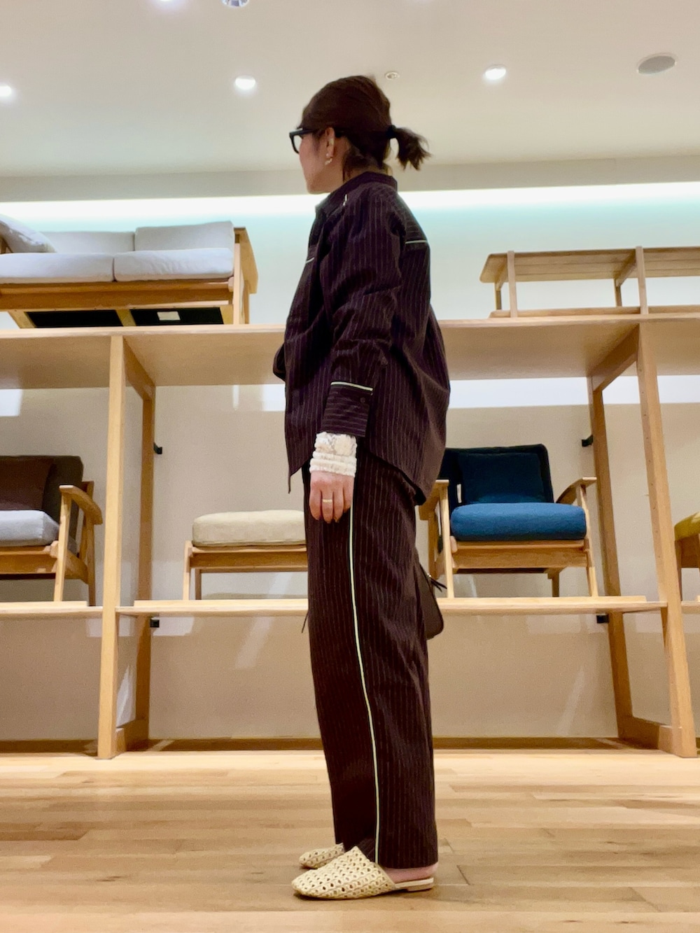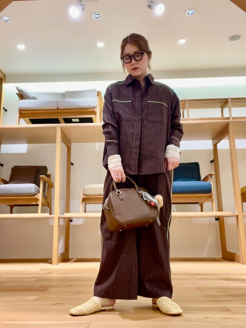パジャマ風なストライプシャツ×パンツは、動きを出して着るのがオススメです‼︎