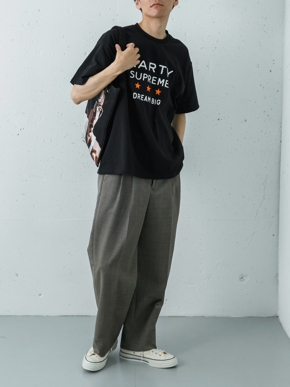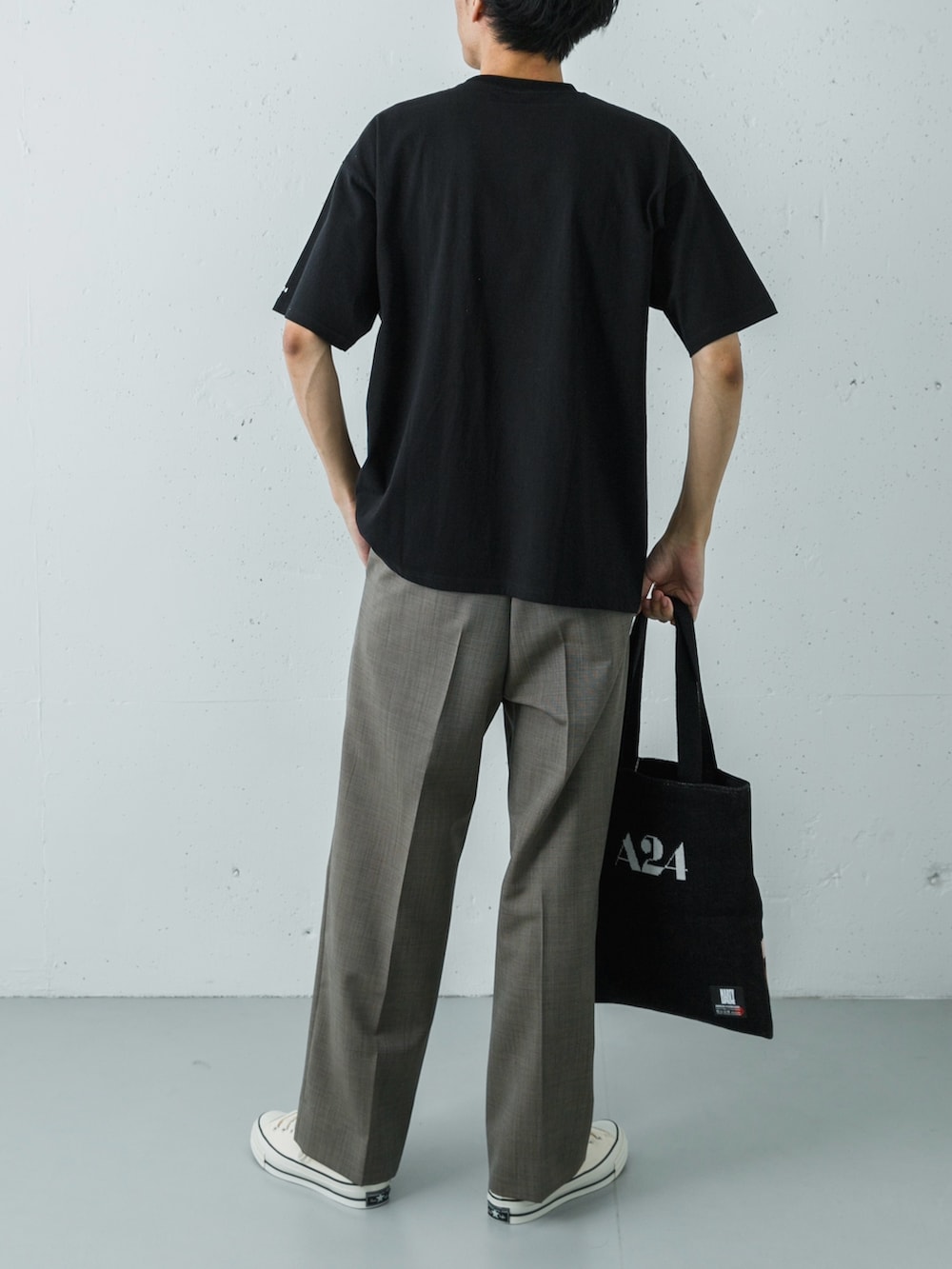 主役となるブラックのTシャツは、フロントの3スターロゴが程よいアクセント。そこに劇中のクラシカルなムードを彷彿とさせる、50年代風のチェック柄トラウザーを合わせることで、プリントTシャツのカジュアルさを大人の品格へと引き上げています。