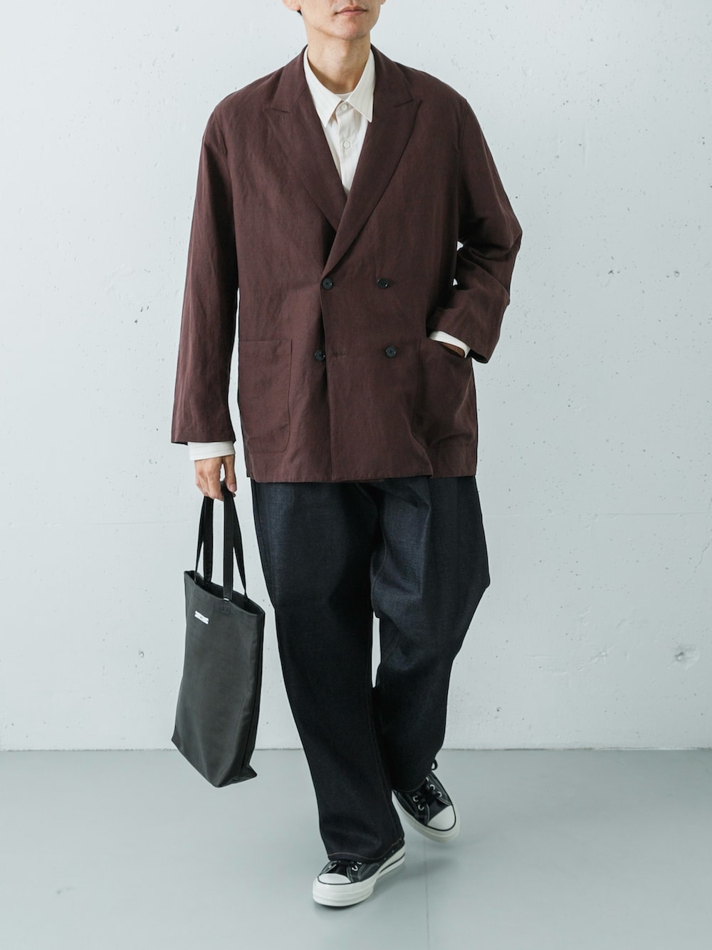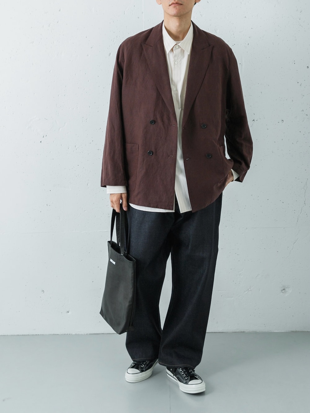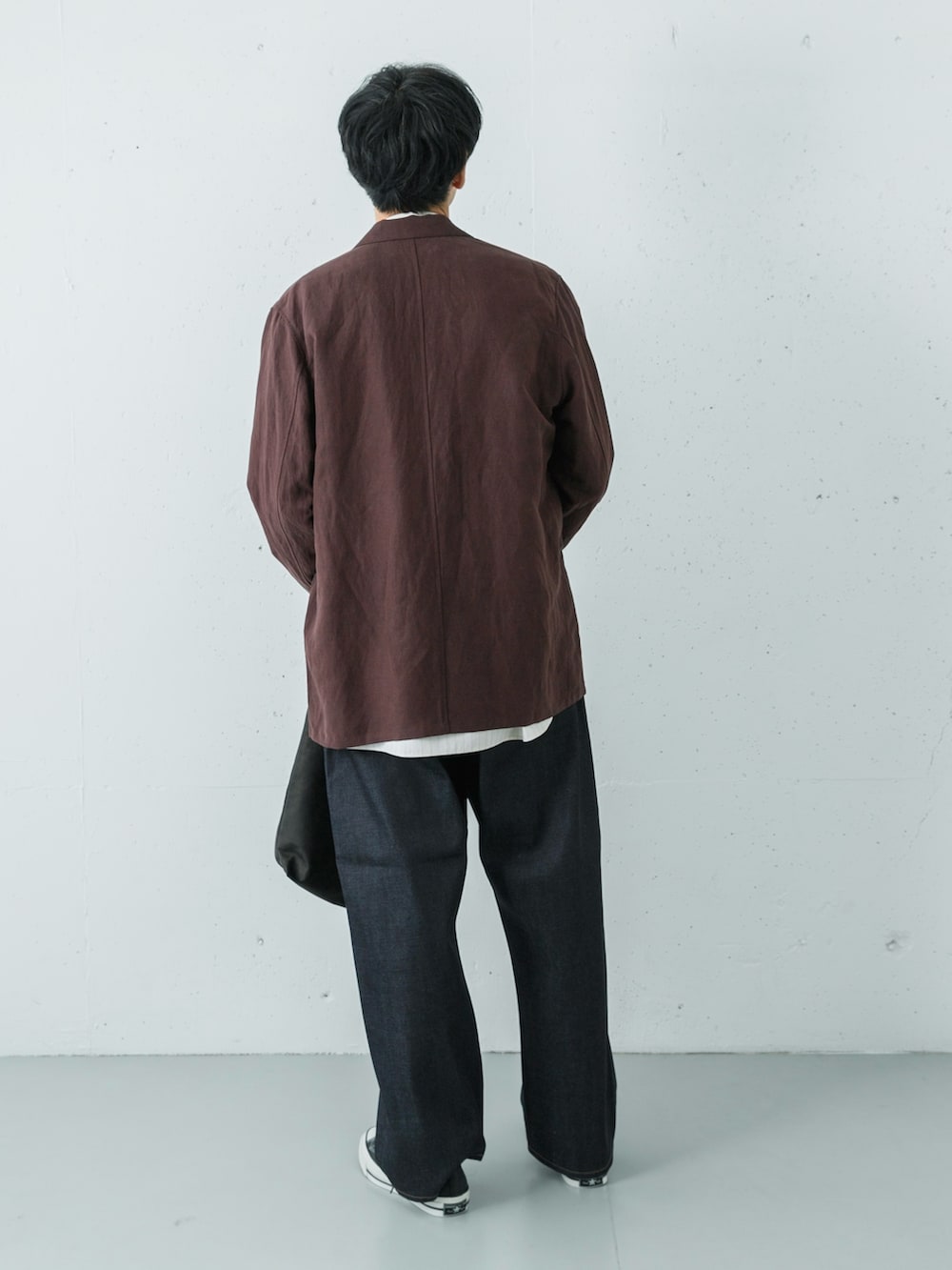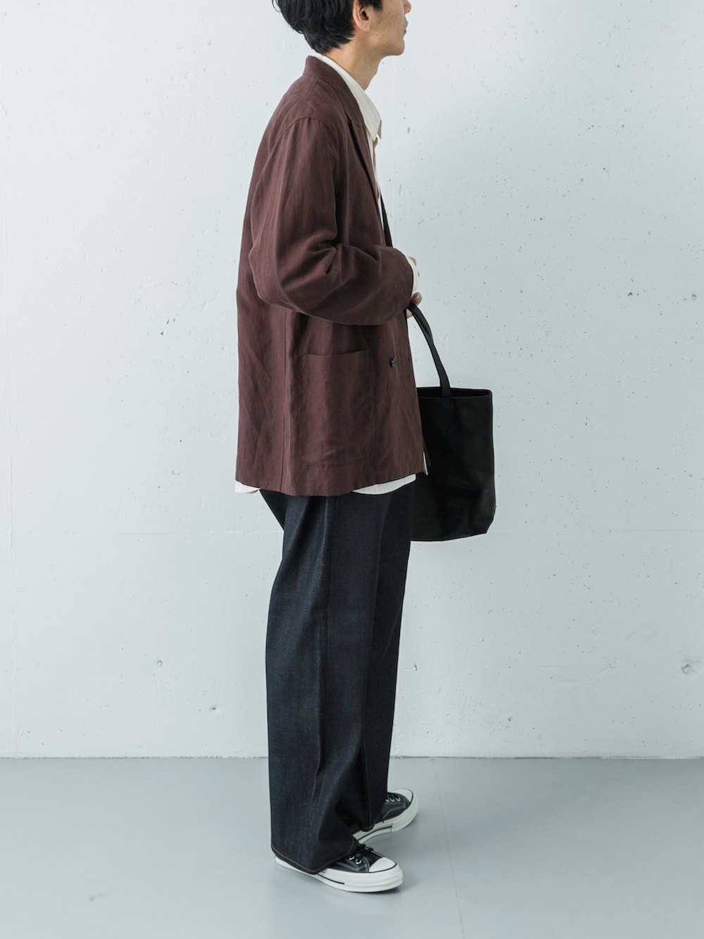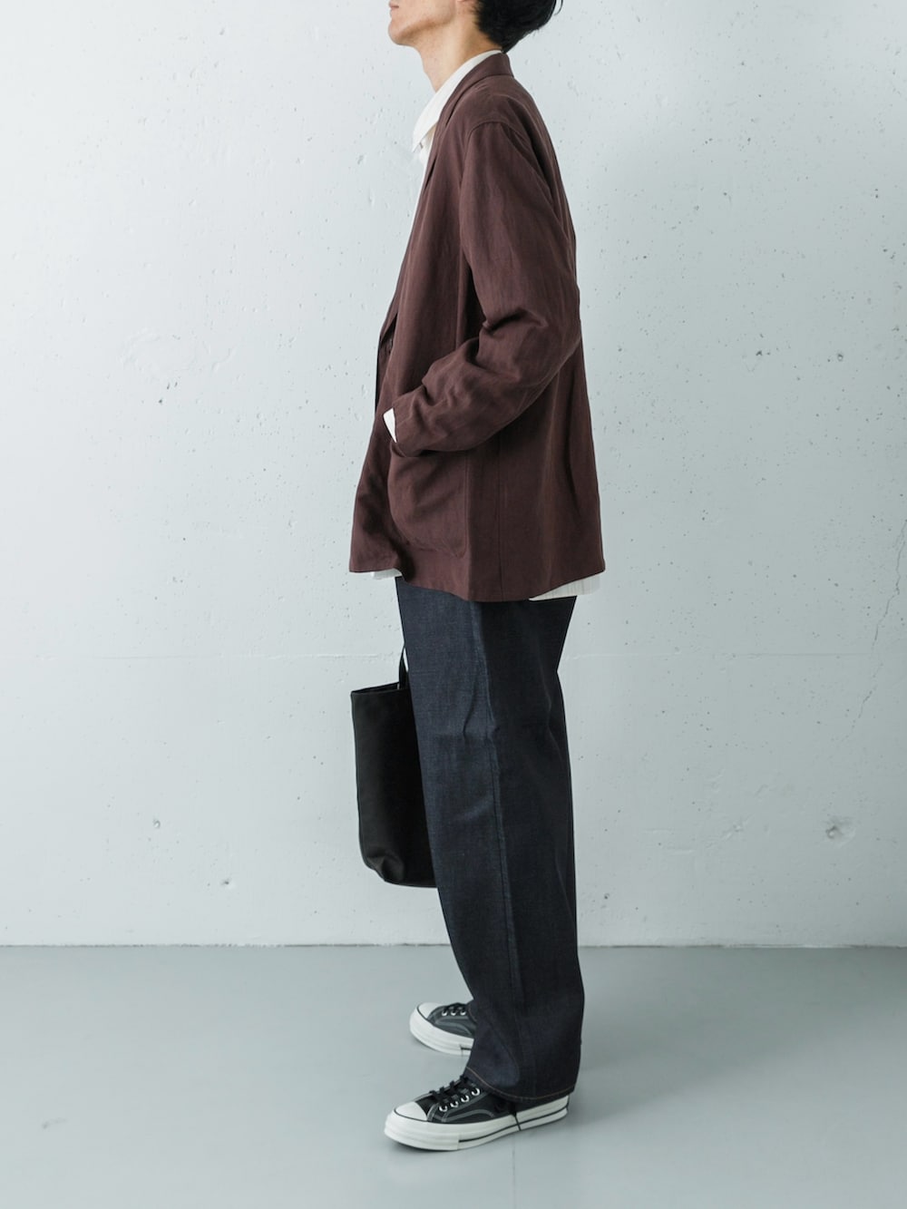 シルクとリネンが織りなす「new basic」のジャケットは、ダブル仕立てながらも素材の軽やかさで重さを感じさせない絶妙なバランス。そこにSHIOTA製の最高級スーピマデニムを合わせることで、ドレスライクな上半身に奥行きのあるカジュアルさをプラスしています。バギーシルエットの「JAY」が、現代的なボリューム感を作り出し、スタイルをアップデート。