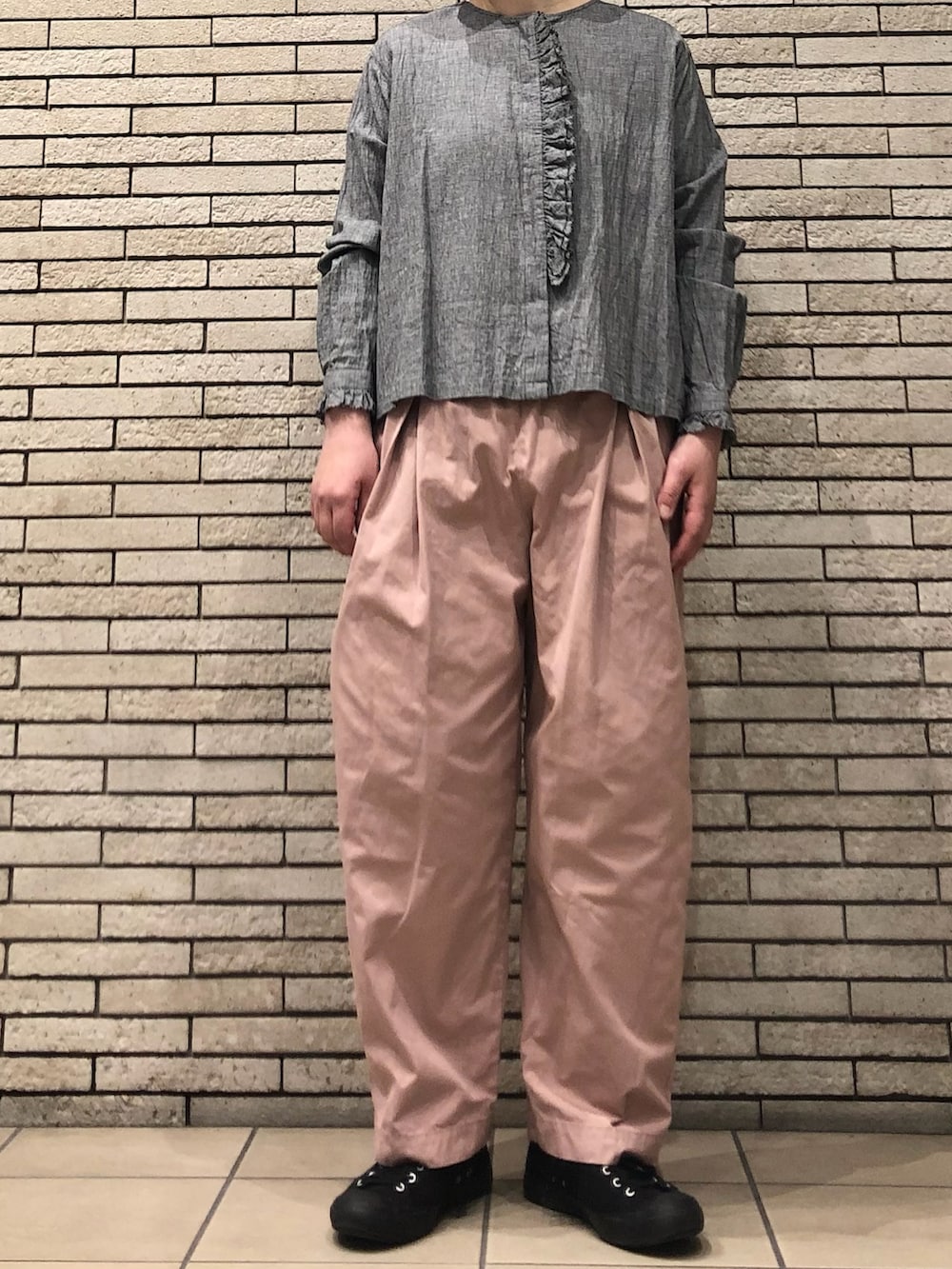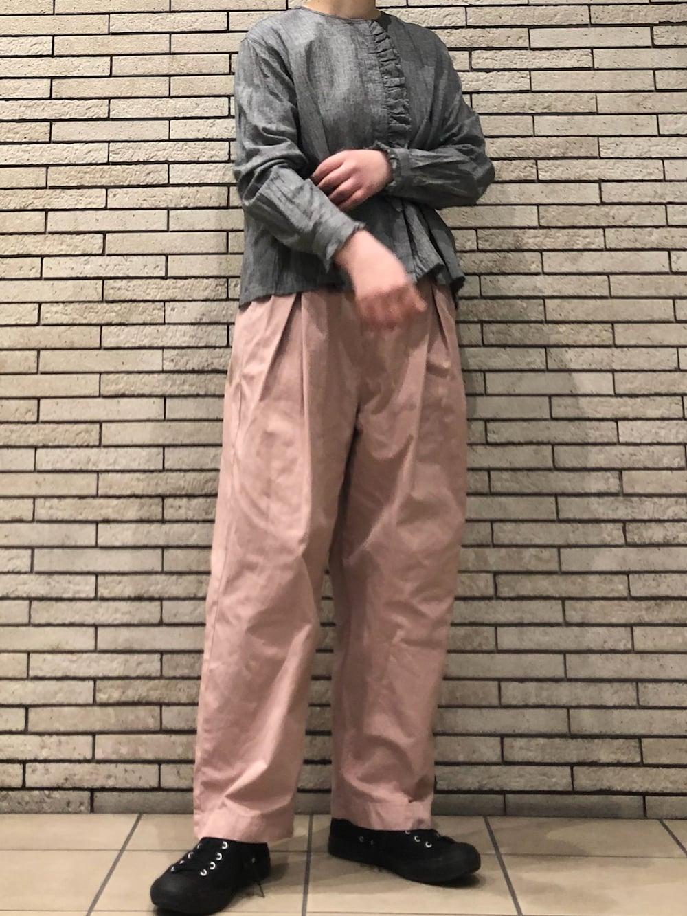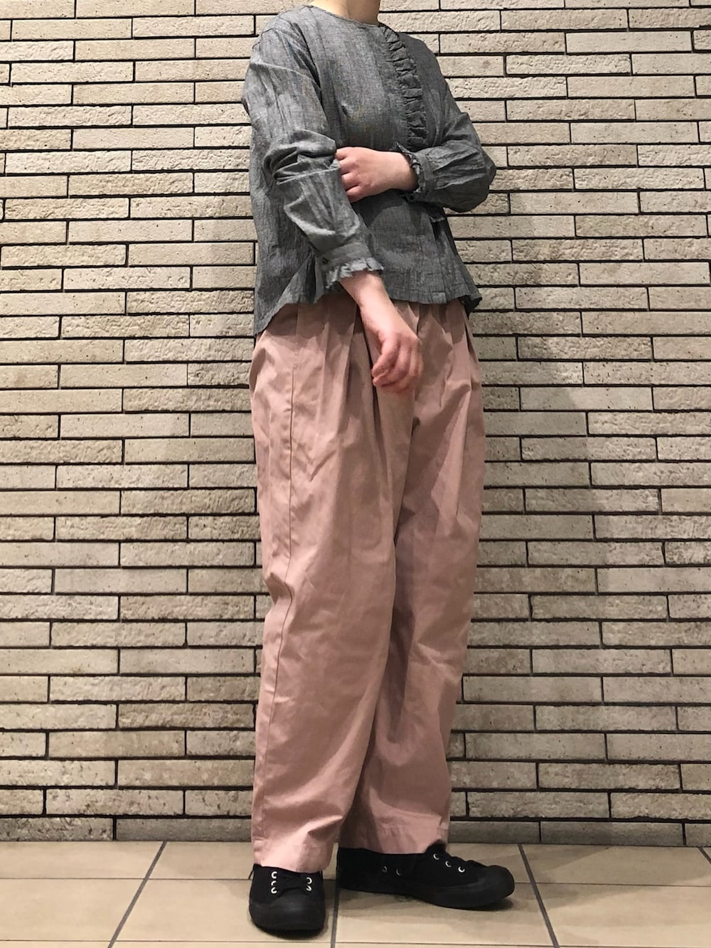 今回は春らしいピンクのパンツと合わせた大人カジュアルです。パンツはウエストがゴム仕様で楽に着用いただけます。
