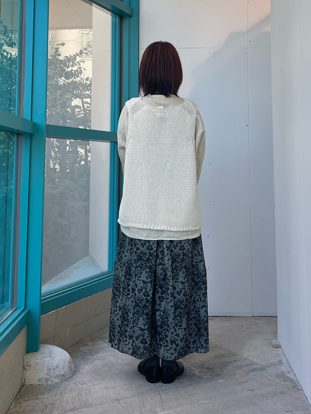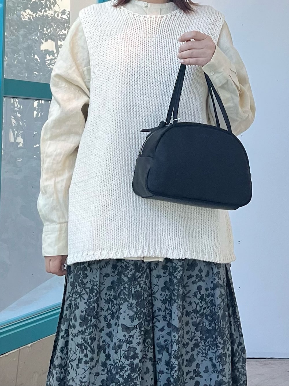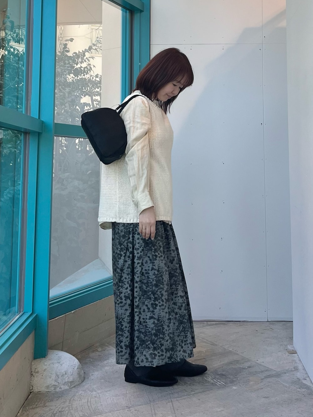 ボトムはリバティプリントスカート。柄の華やかさはそのままに、トップスを変えるだけで雰囲気がぐっと新鮮に。