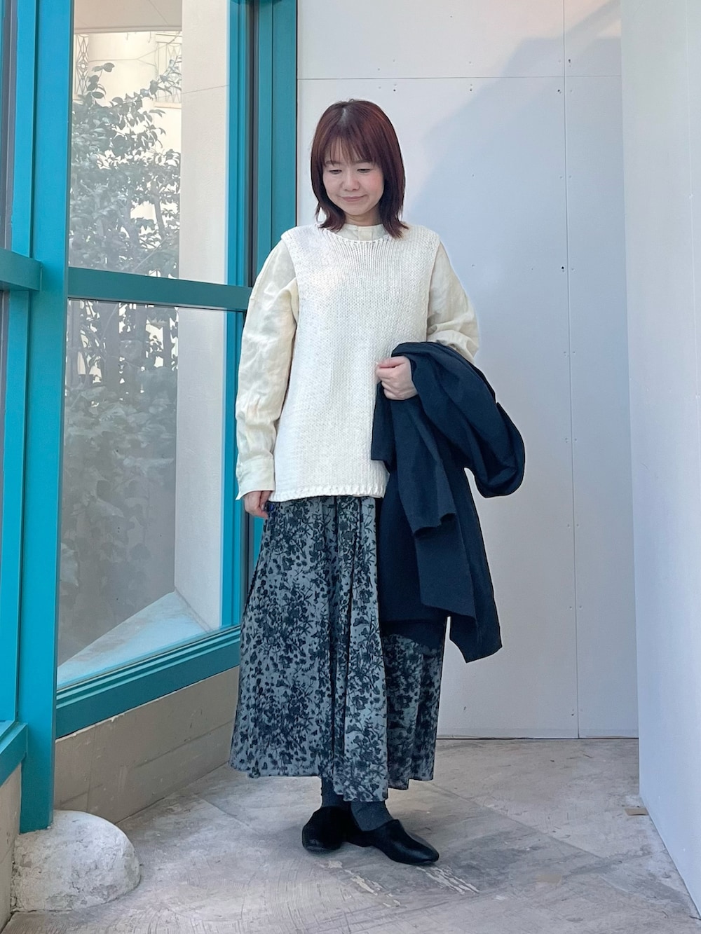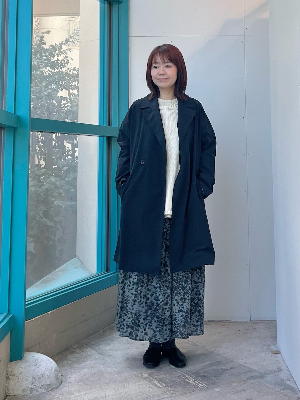 今回はコートをネイビーにして全体を引き締めました。