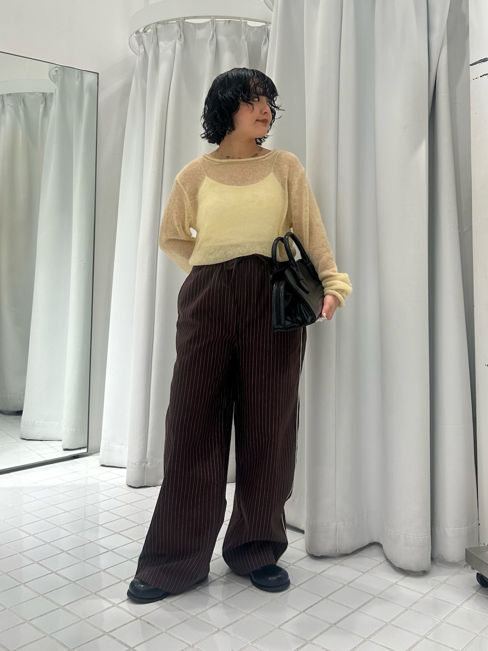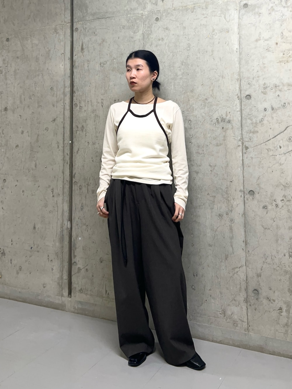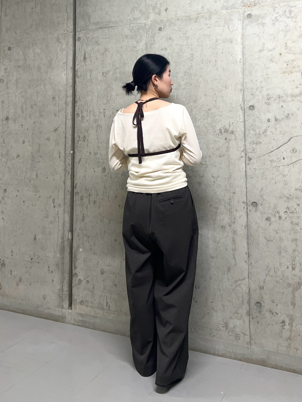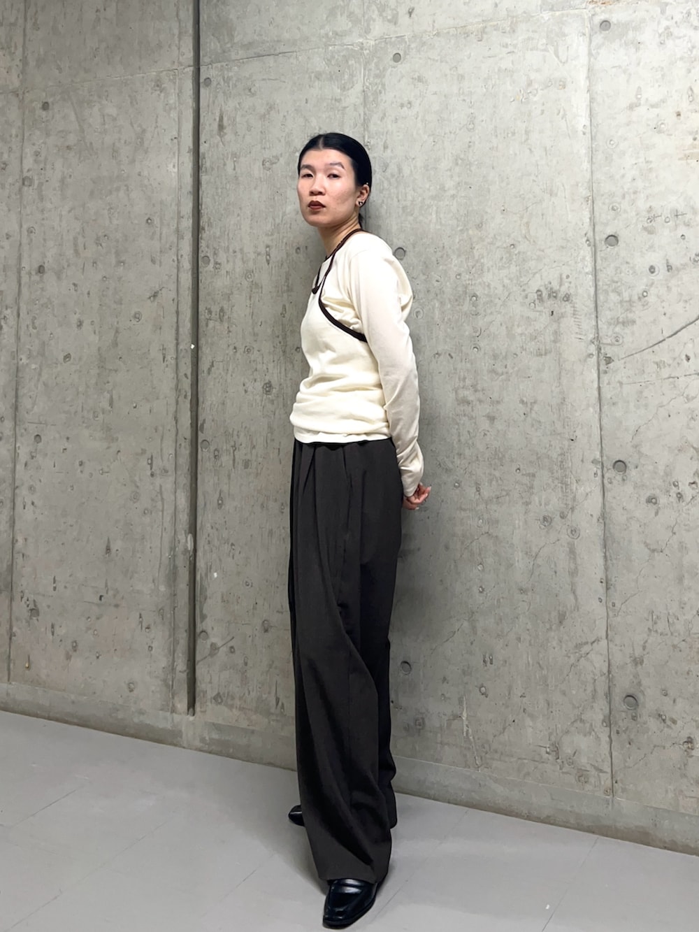パンツはニュアンスのカラーがポイントのスラックスと合わせて、アイボリー×ブラウンのコーデにしました◎