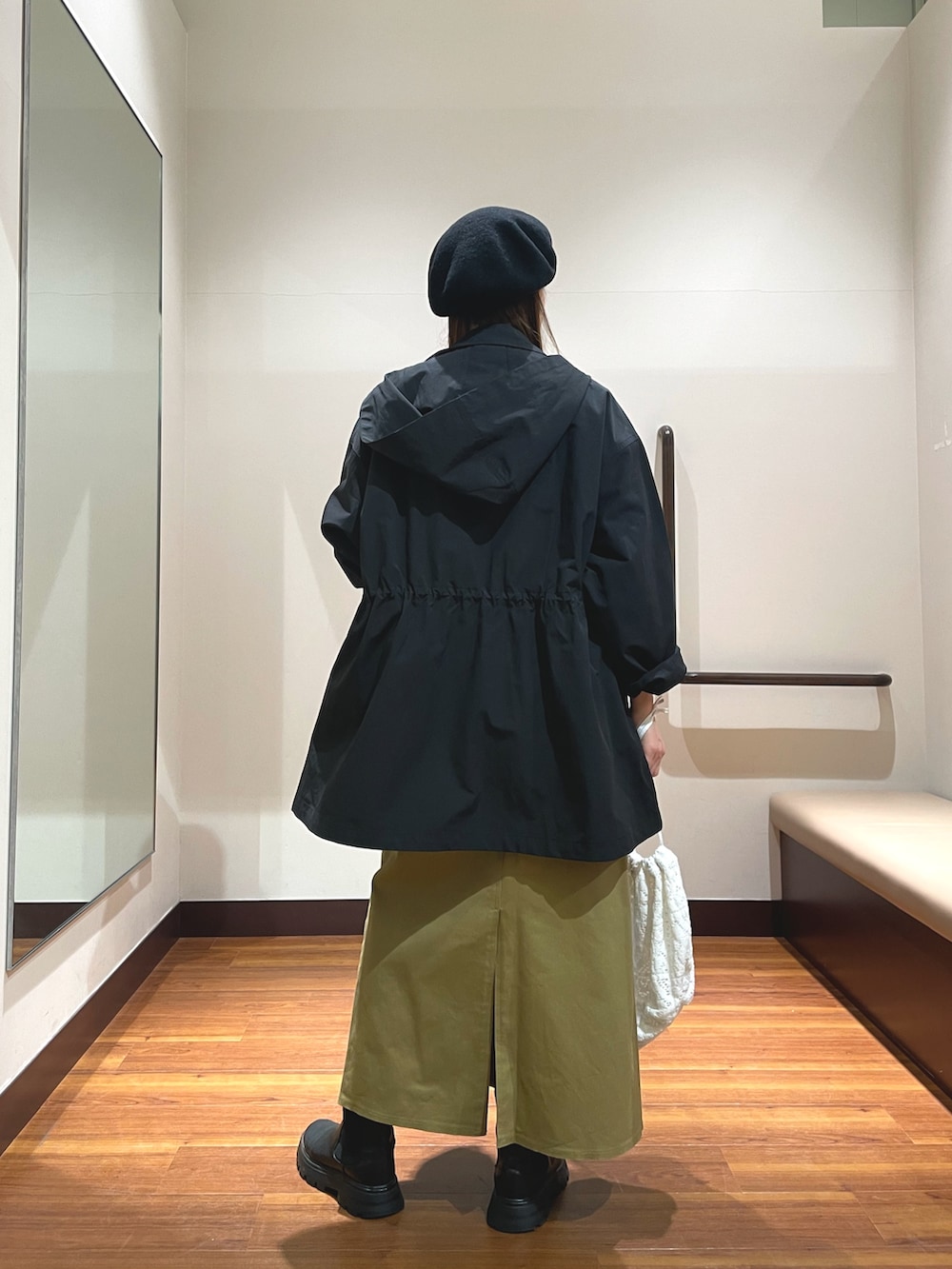 ウエストのドローストリングを絞ってラインを変えたり変化を楽しめるのもポイント✨袖をまくってインナーを見せるのも可愛いです😊