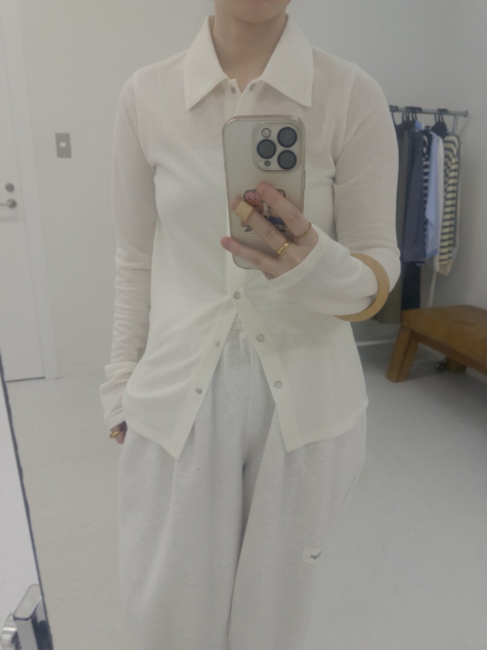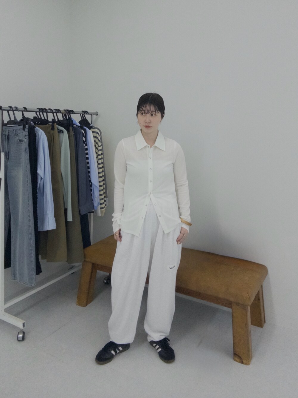 襟付きのカットソーとスウェットパンツの