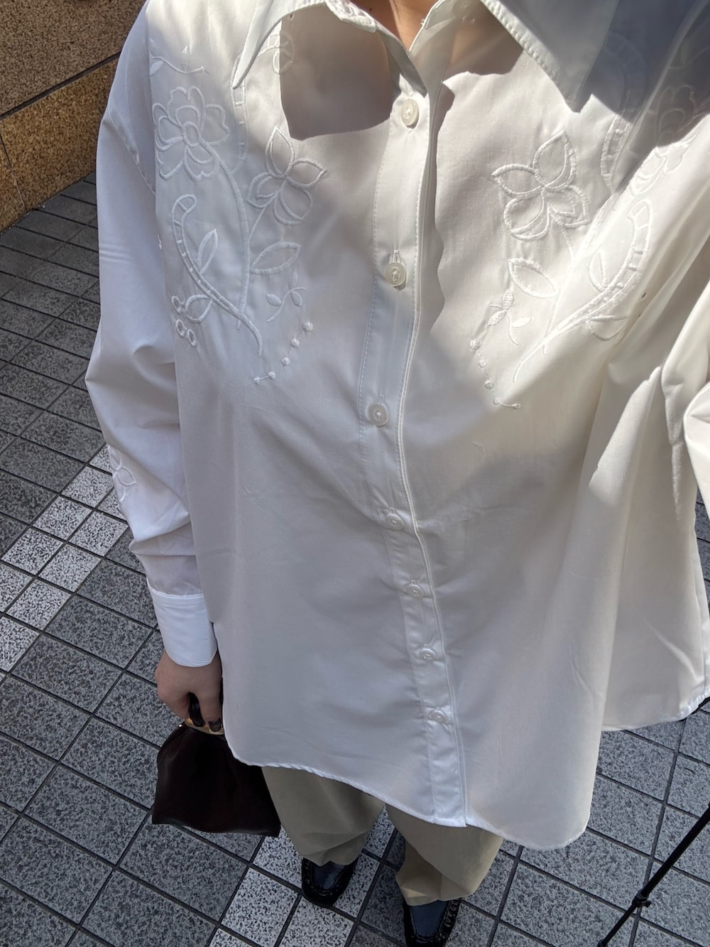 シャツは刺繍が入っていて爽やかな印象に。