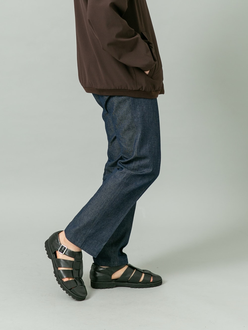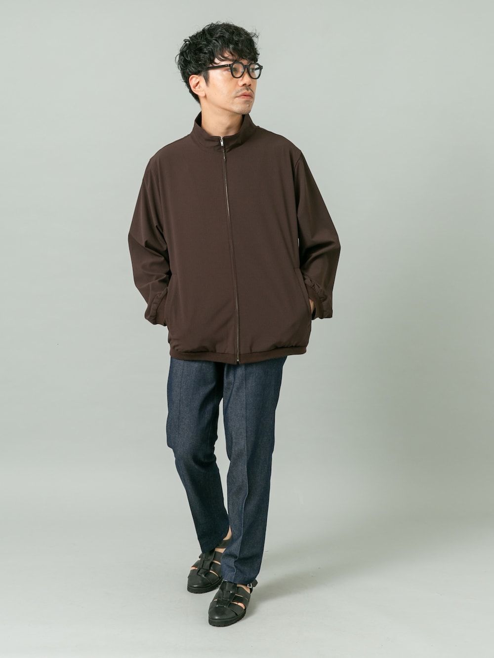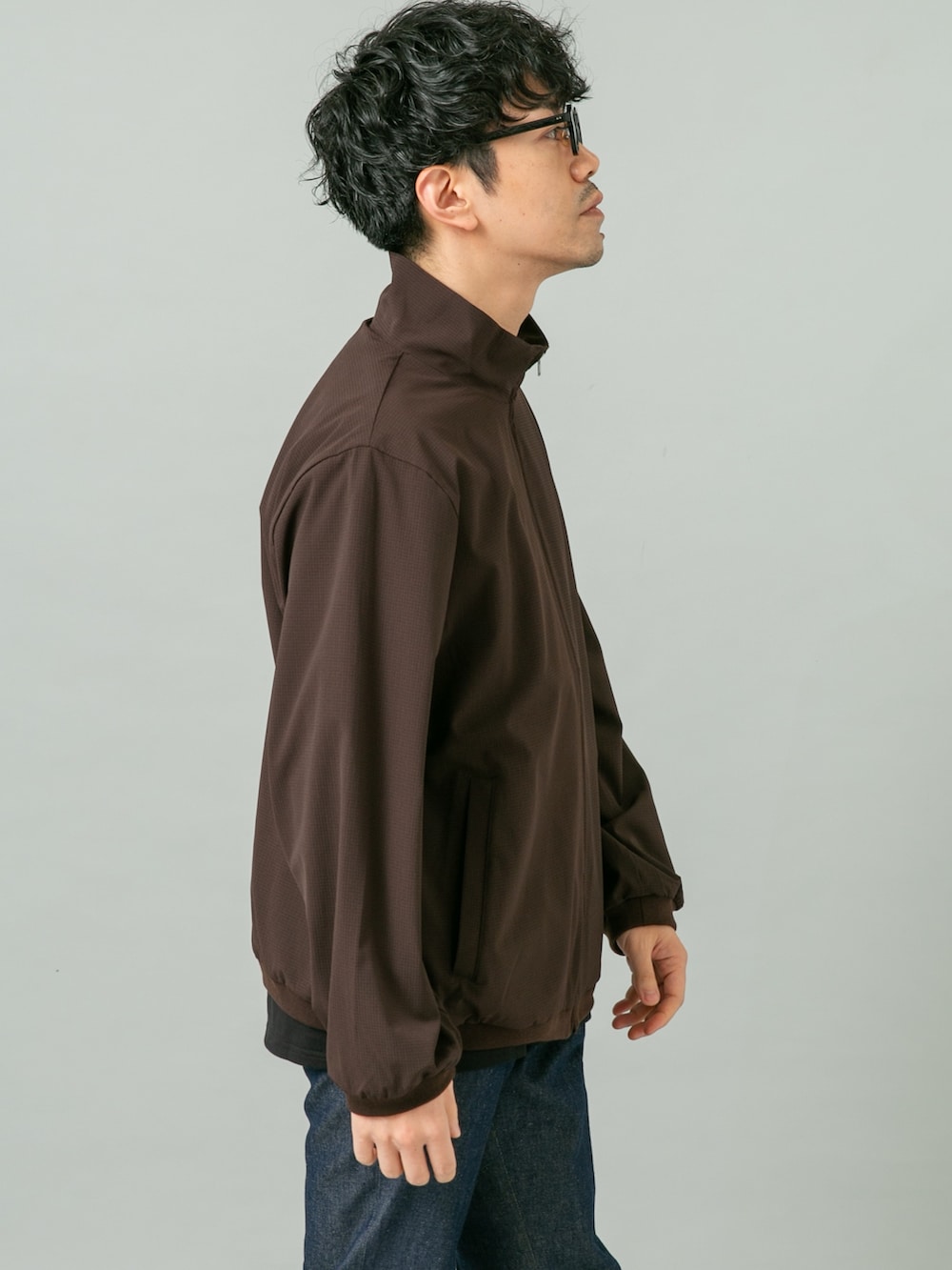 軽快に着こなせるストレッチアウターにデニムスラックスを合わせたコーディネート。