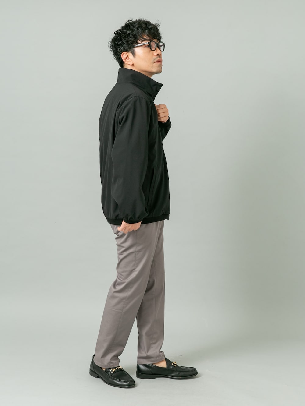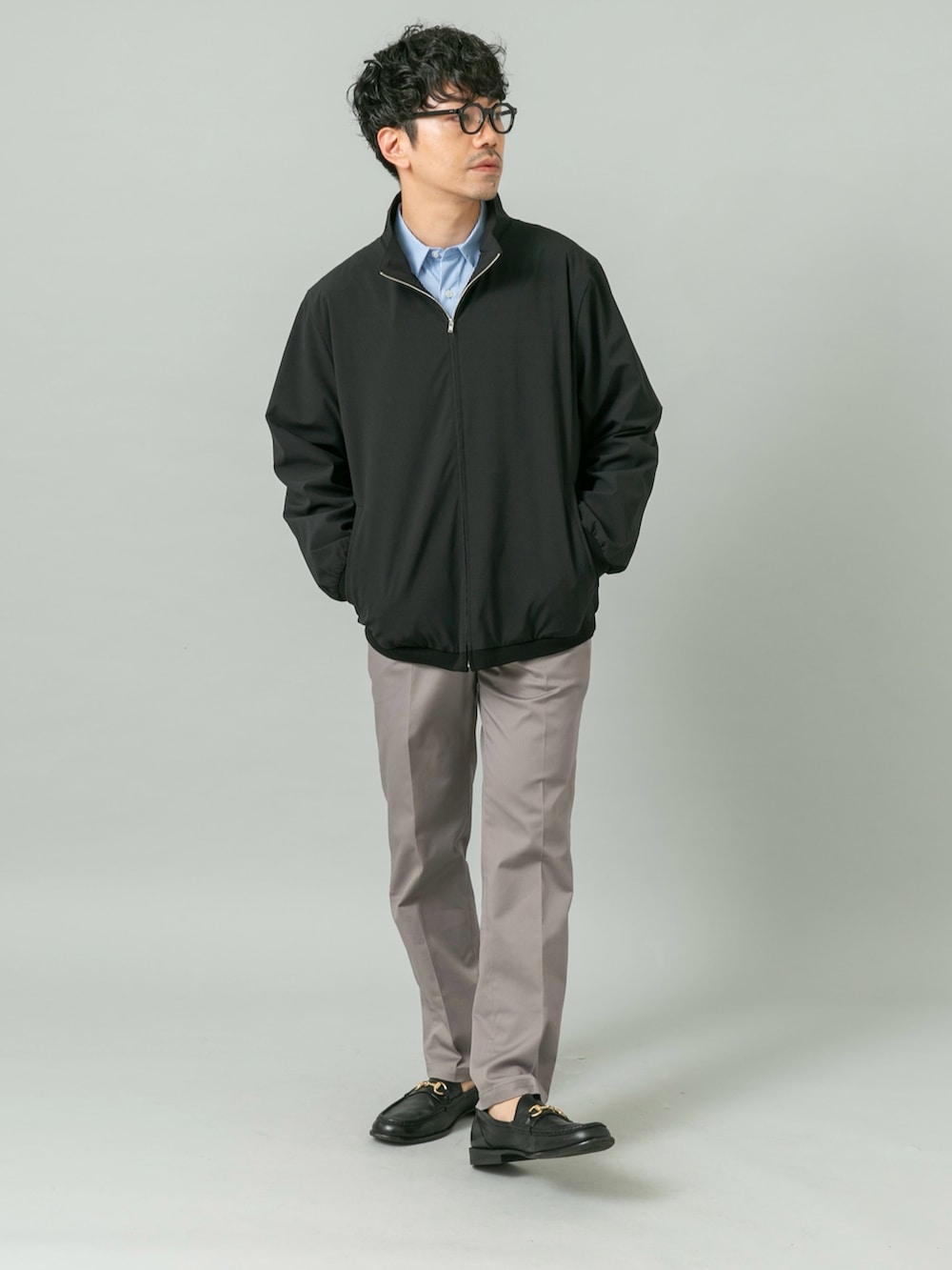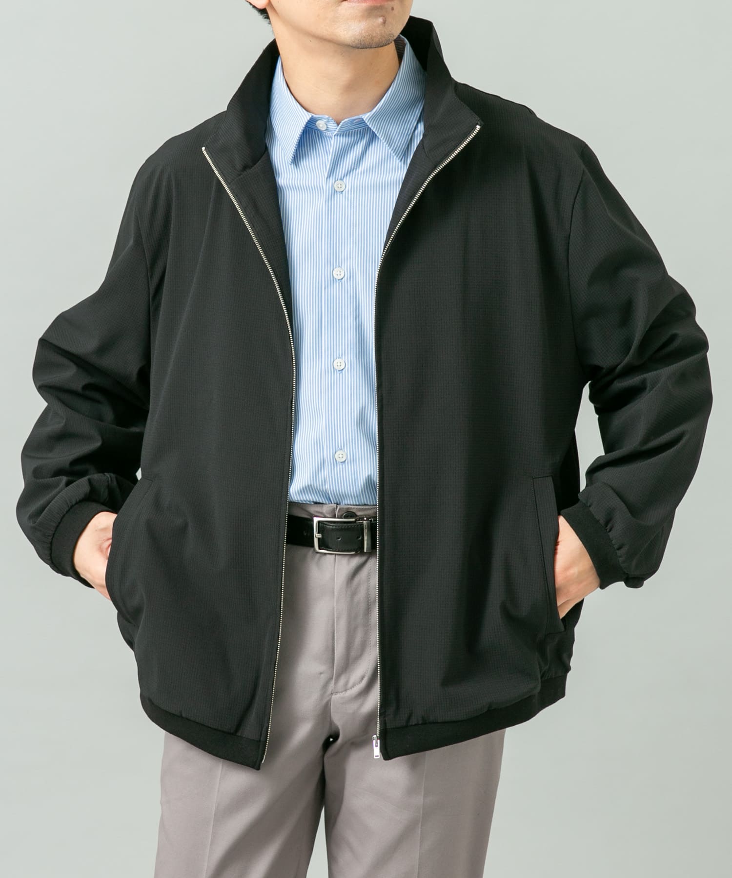 タックインしたきれいめスタイルに機能性抜群の快適ブルゾンを合わしたビジカジスタイル。