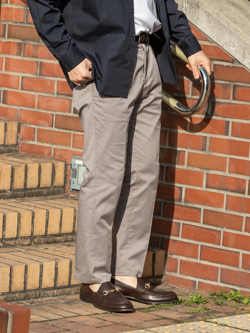 パンツはMサイズでやや細めですがストレッチがあるので見た目以上に楽です。大人気スラックスの生地違いで