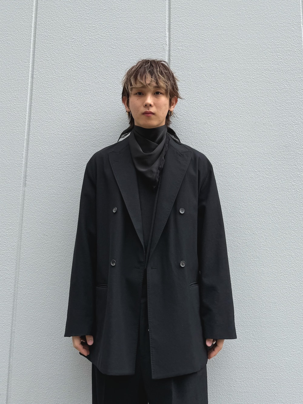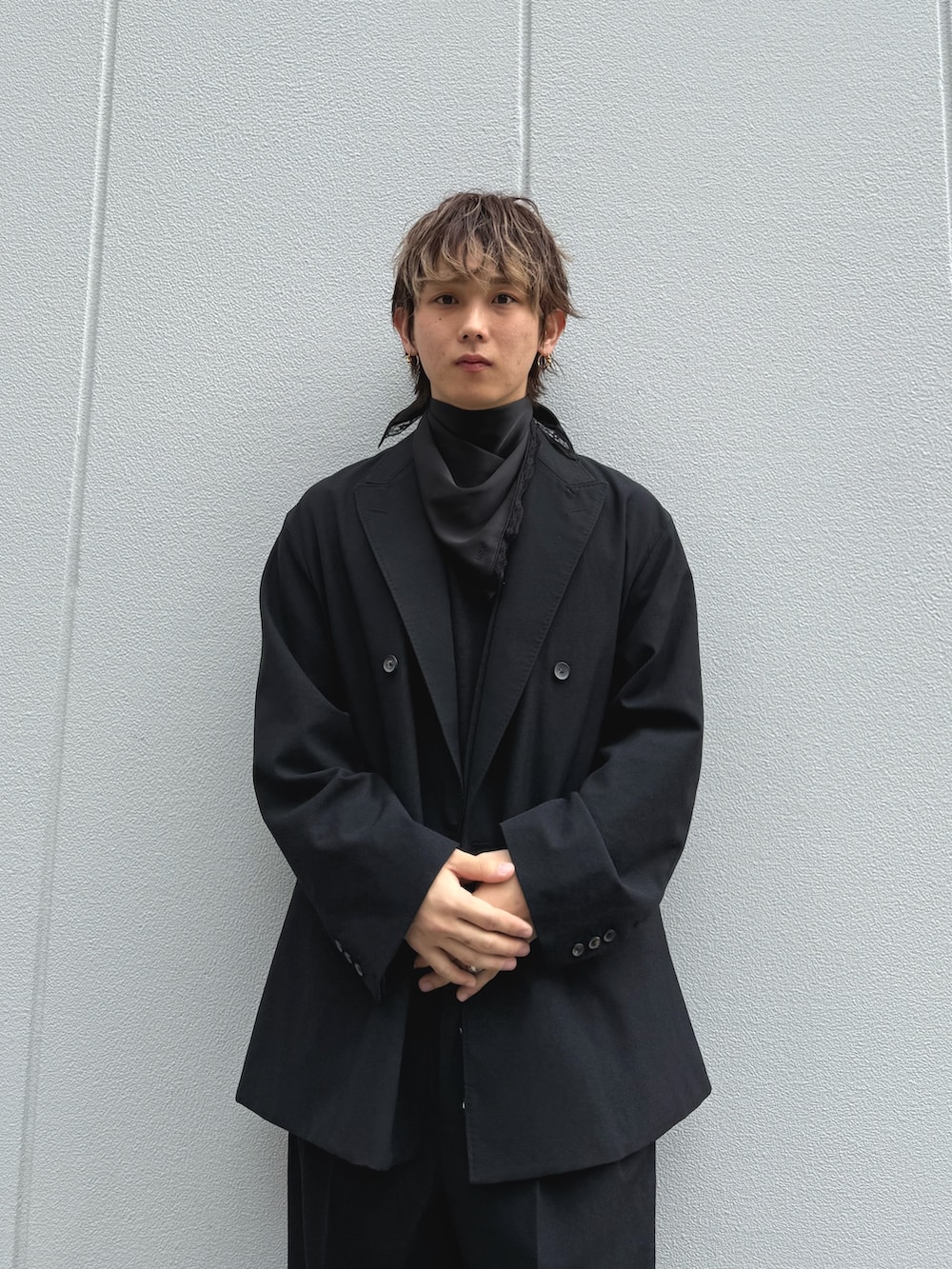 首元にフリルのブラックスカーフを巻いて弱モードなスタイルを意識しました。