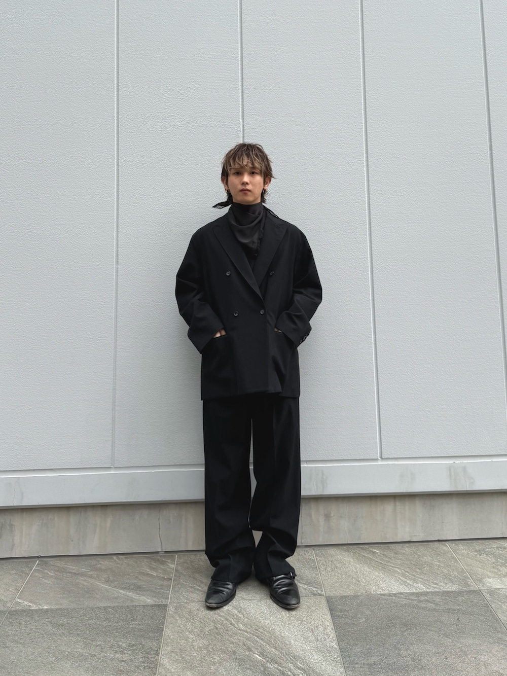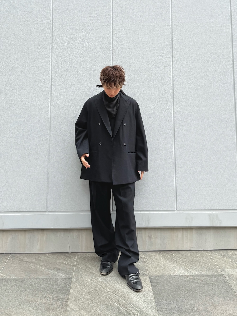 怖くなりがちなオールブラックですが、セットアップで綺麗なクラシックな印象を。