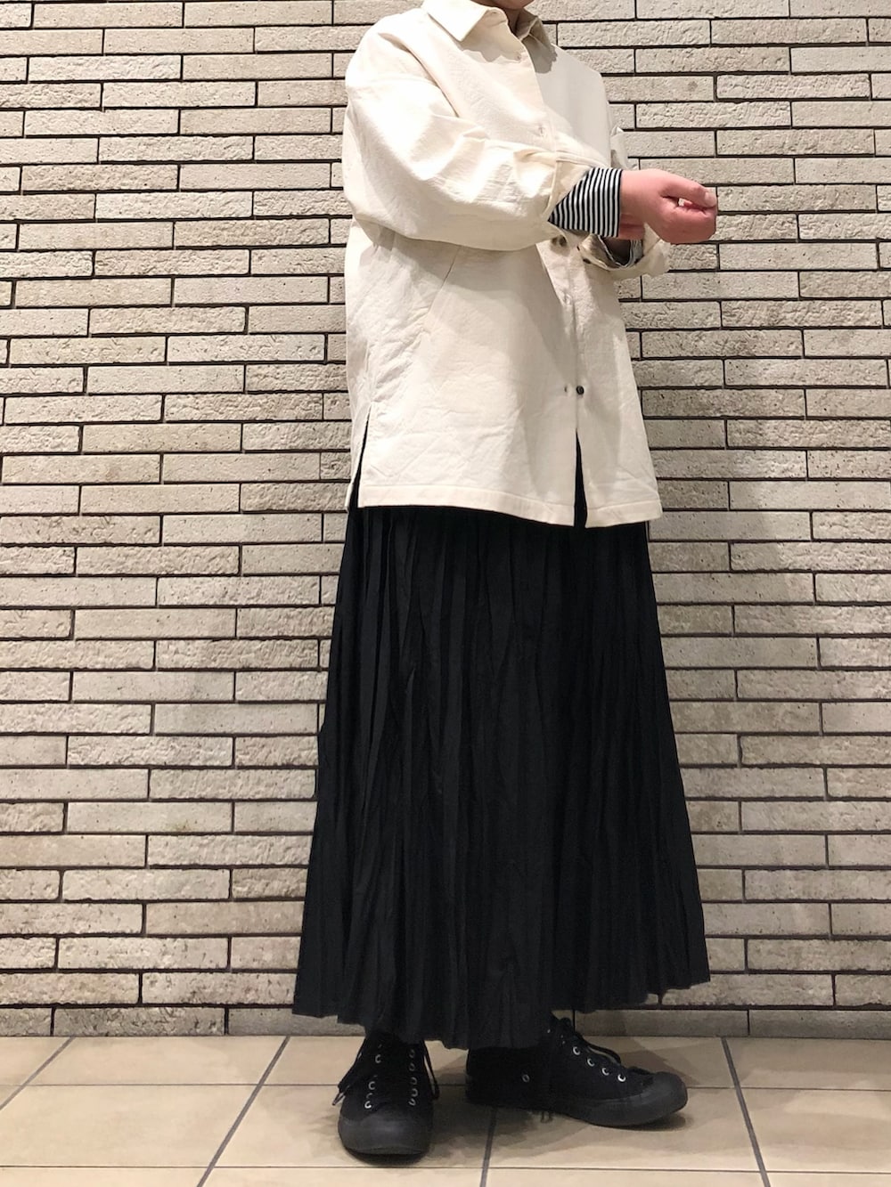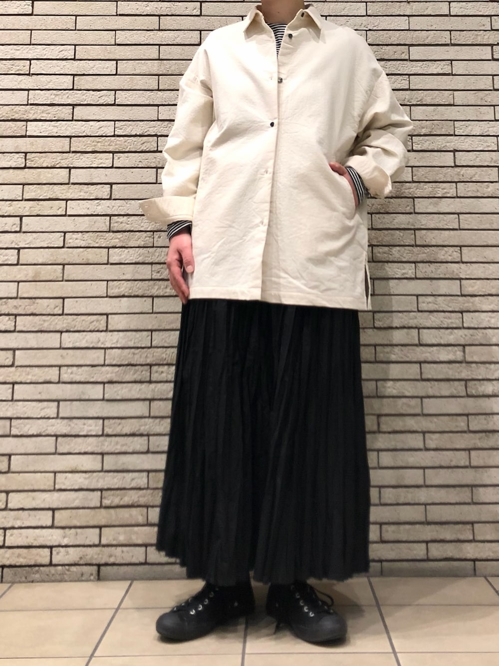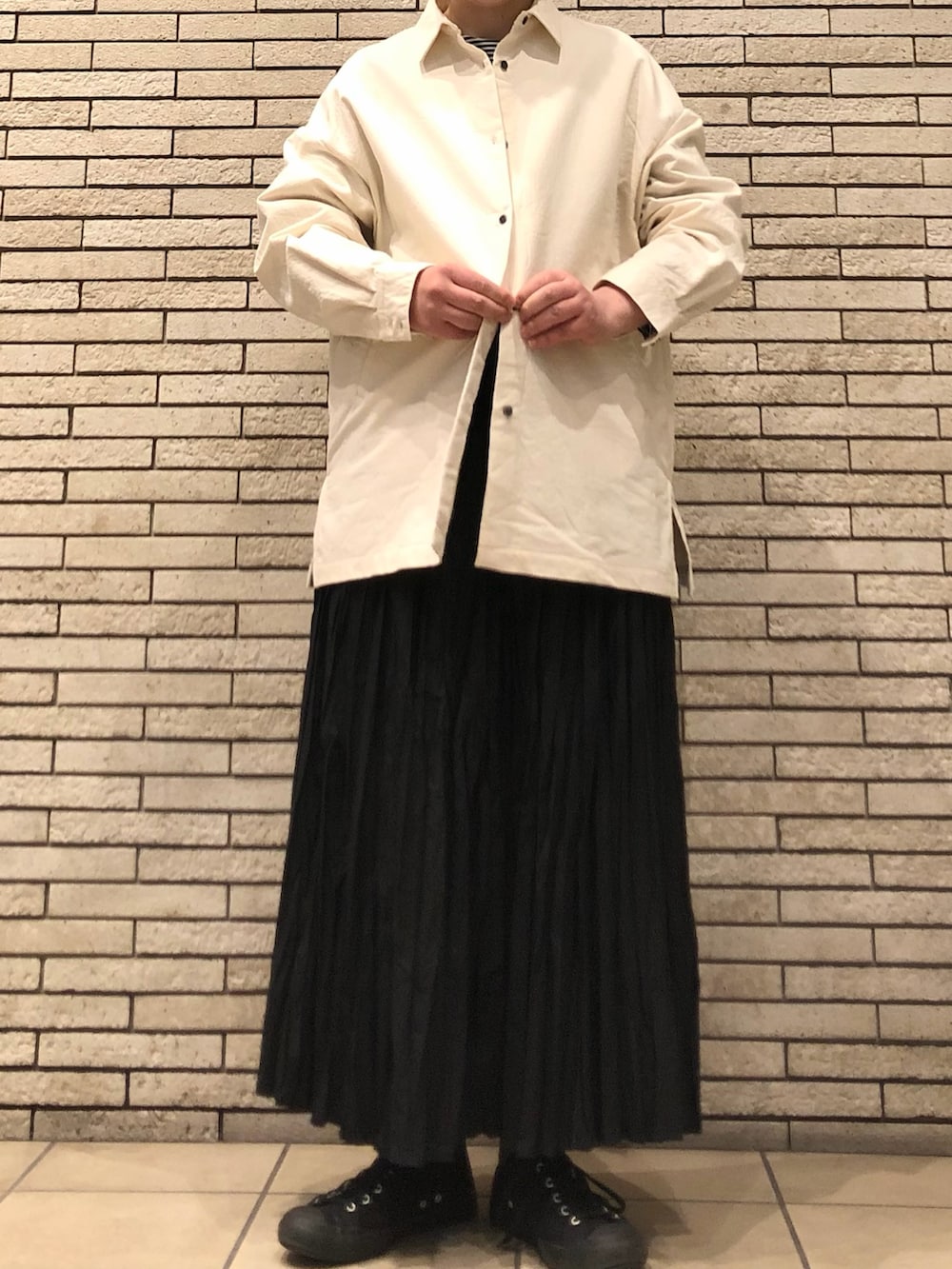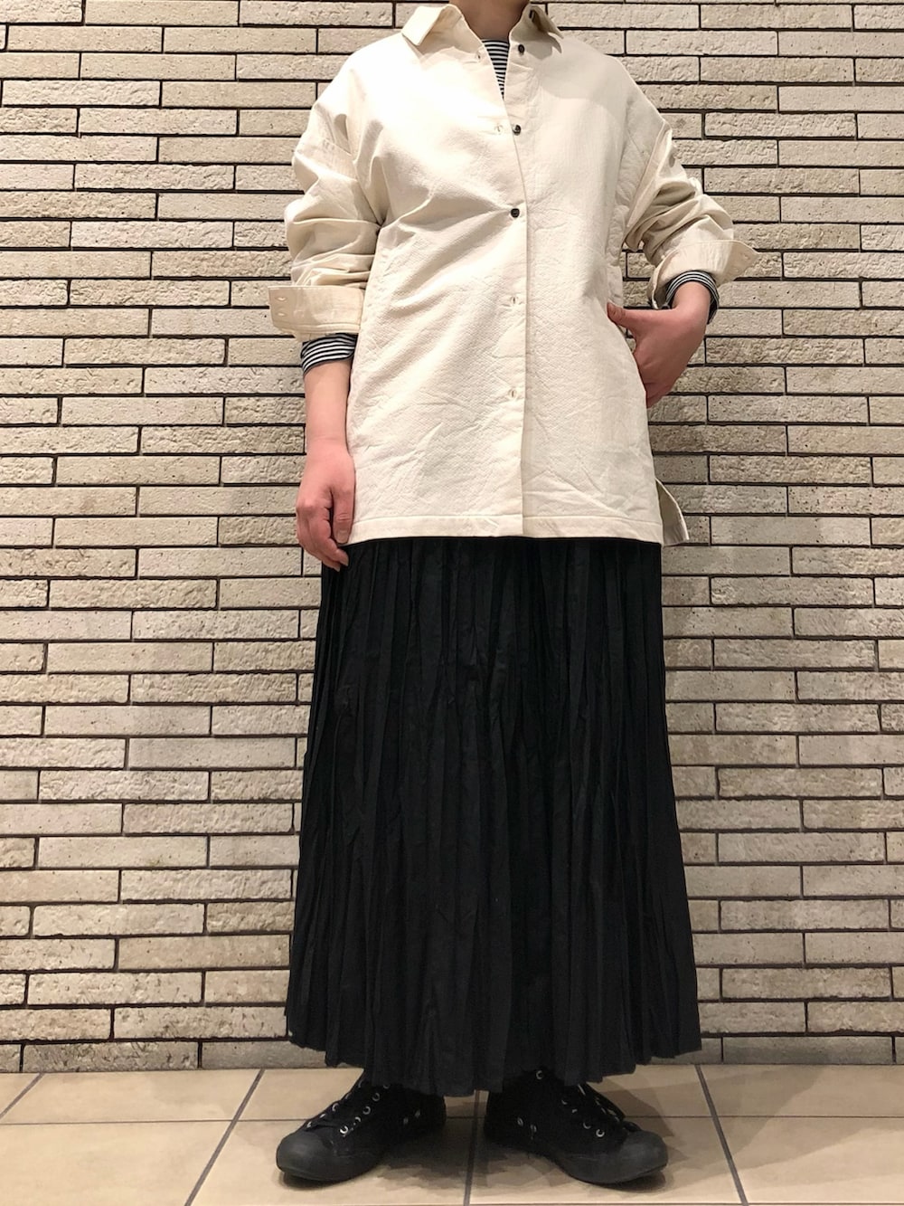 さっと羽織るのに便利で、ボタンを留めてトップス風に着用いただくのも◎メンズライクなオーバーサイズにきれい目なスカートを合わせた大人カジュアルです。