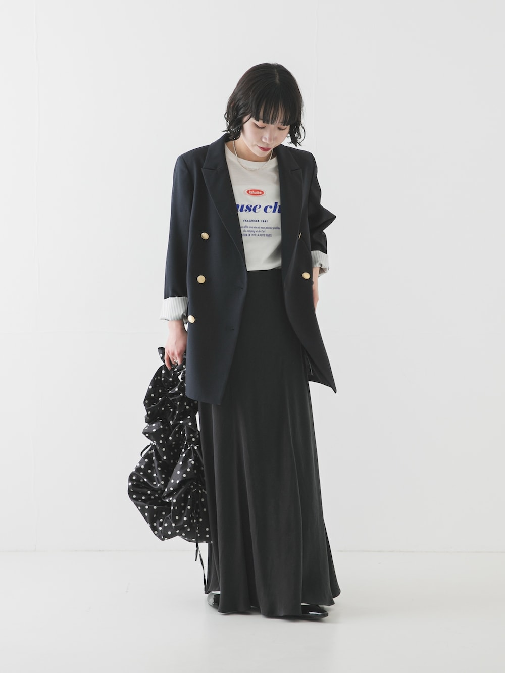 着丈が少し長めなので、低身長さんは袖を少し折るか、ウエスト位置をしっかり見せるとメリハリがついてよりすっきりとした印象に⭐️