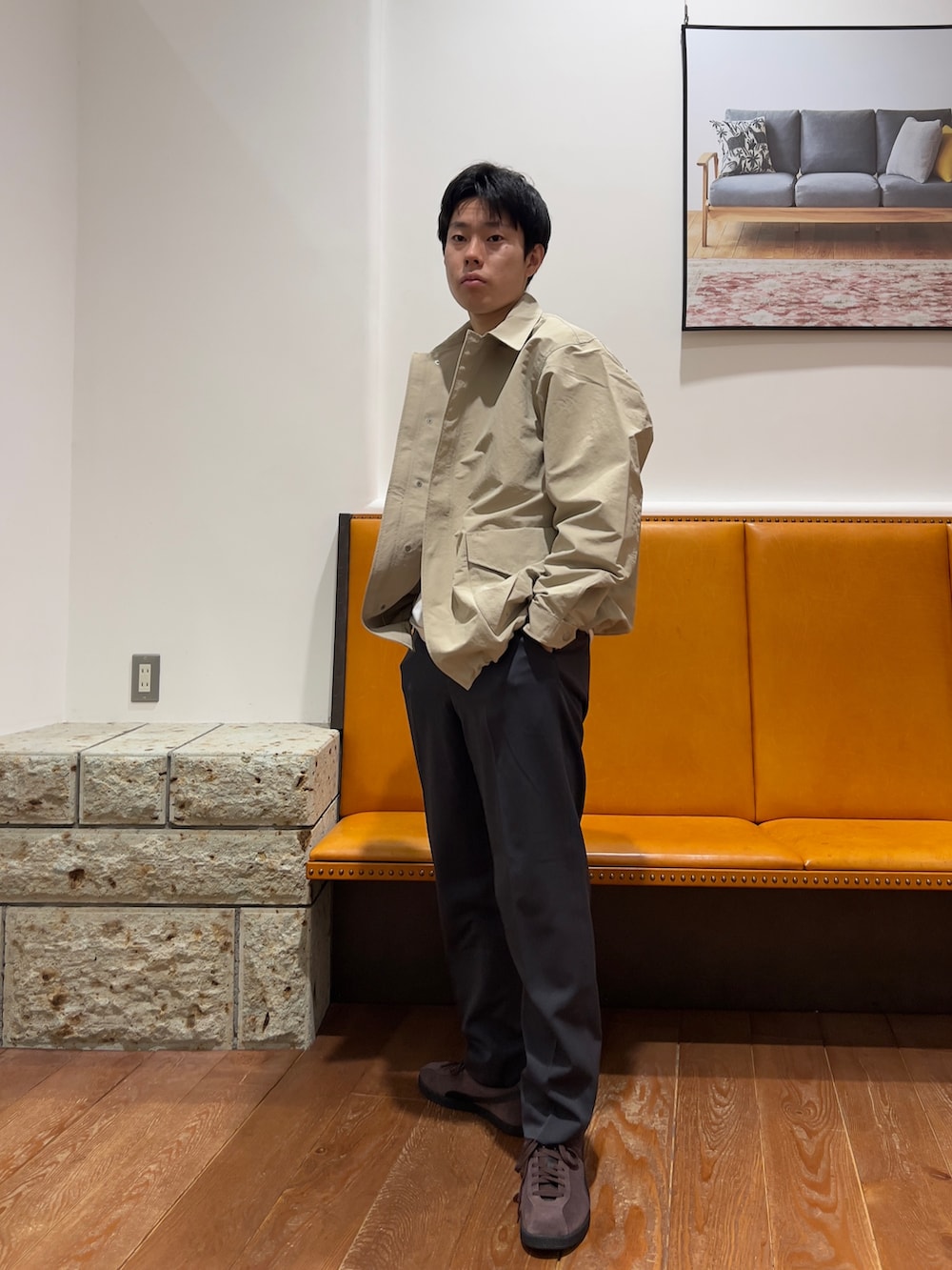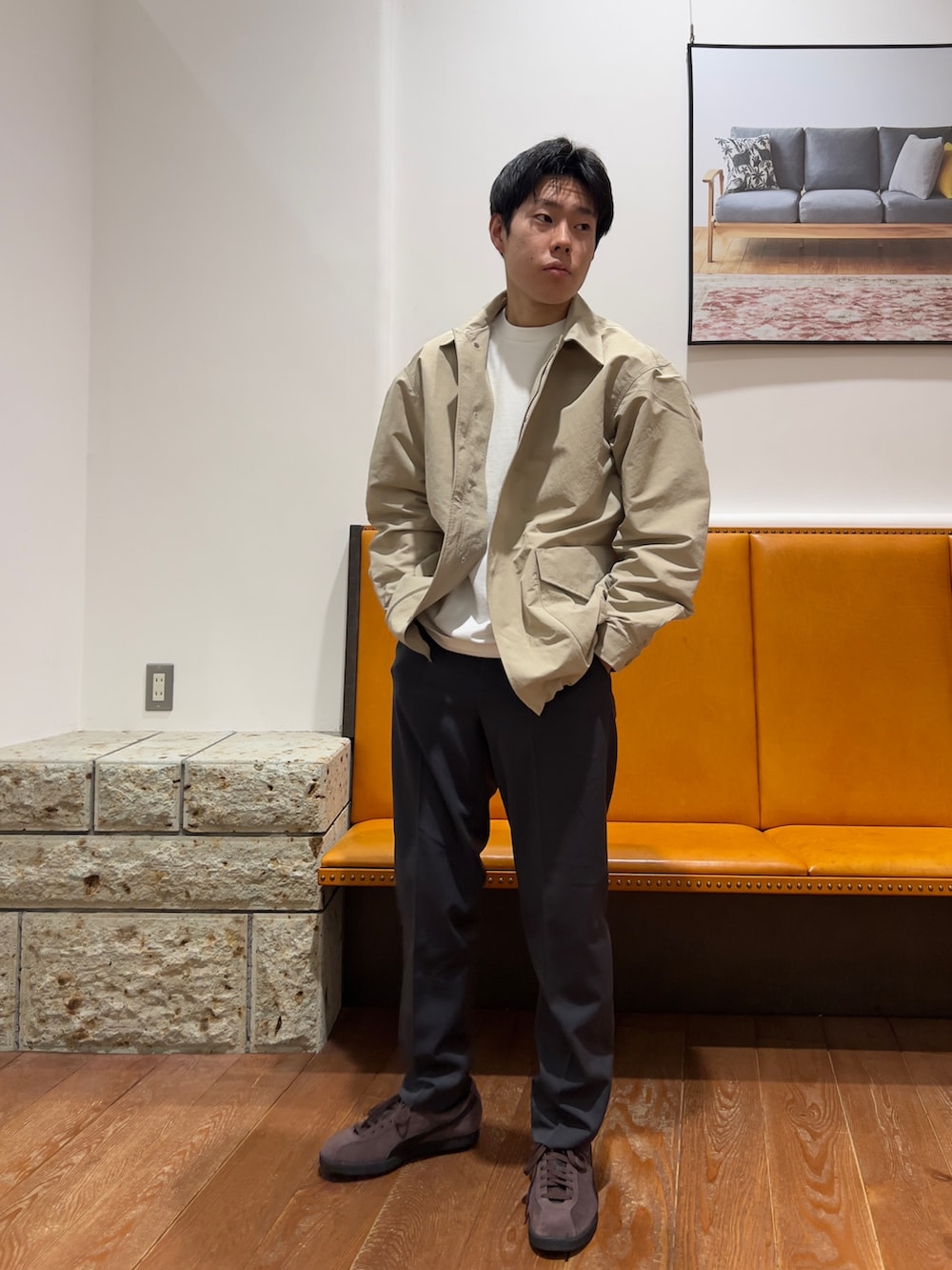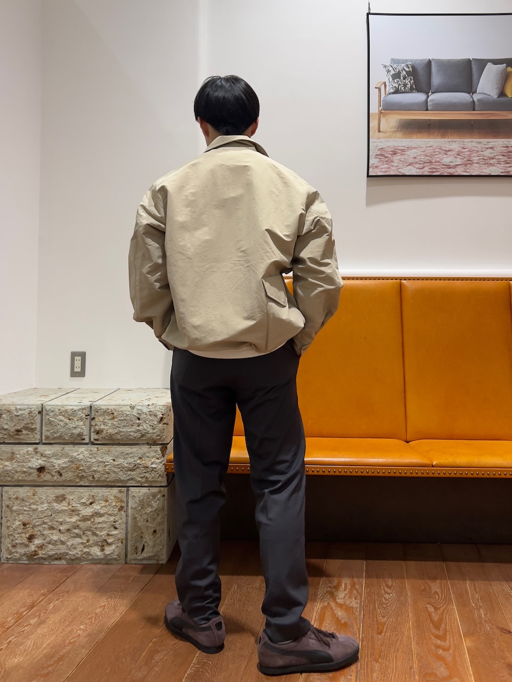 身幅着丈ともに大きめのデザインになっておりインナーにスウェットやニットを持ってきても着用していただけるサイズ感になっております。