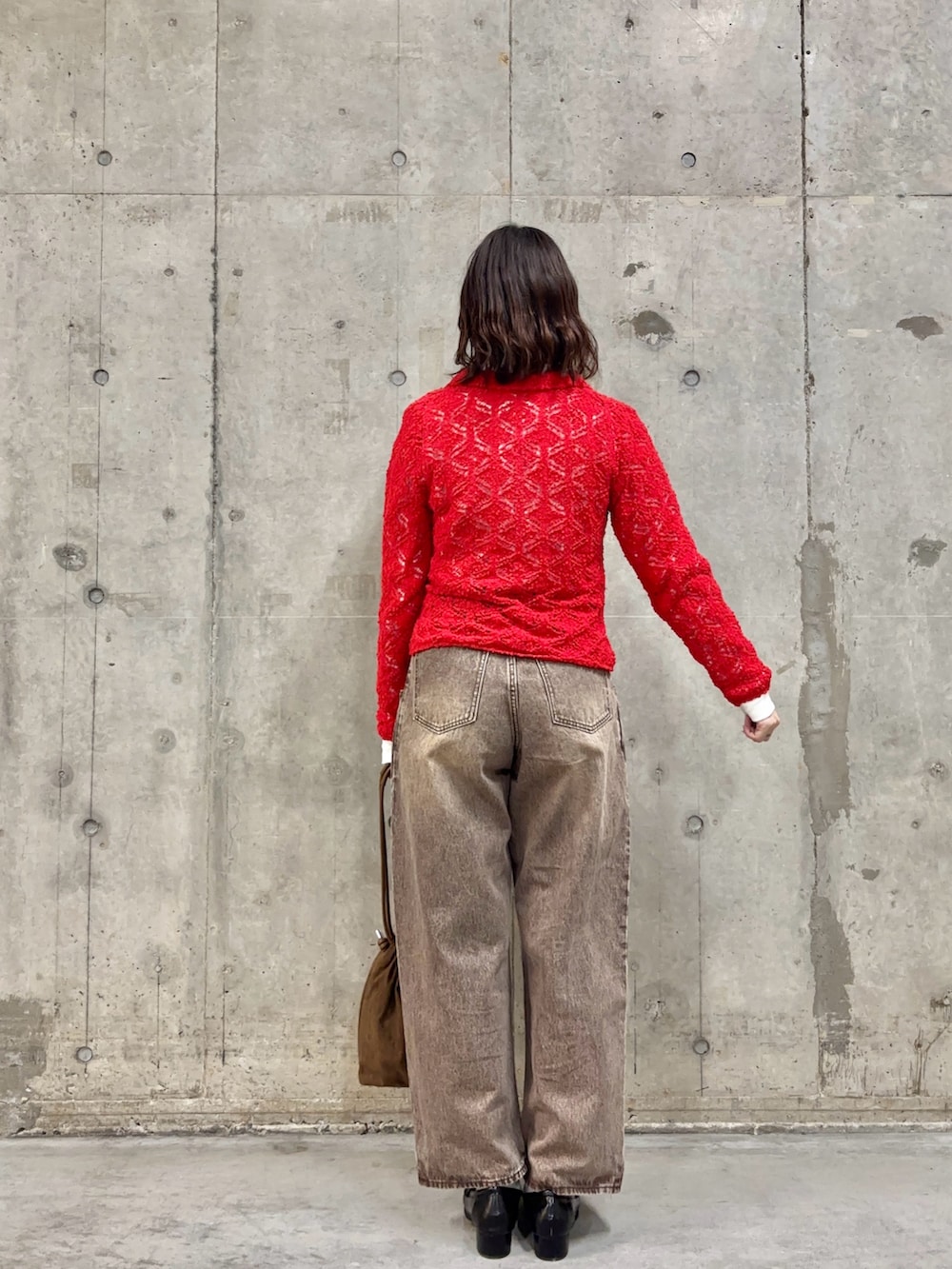 今の時期はまだ肌寒いので、ニットのトップスにグラフィックT、そしてブラウンのデザインデニムを合わせ、赤が重たくならずに映えるように組んでみました🙌🏻