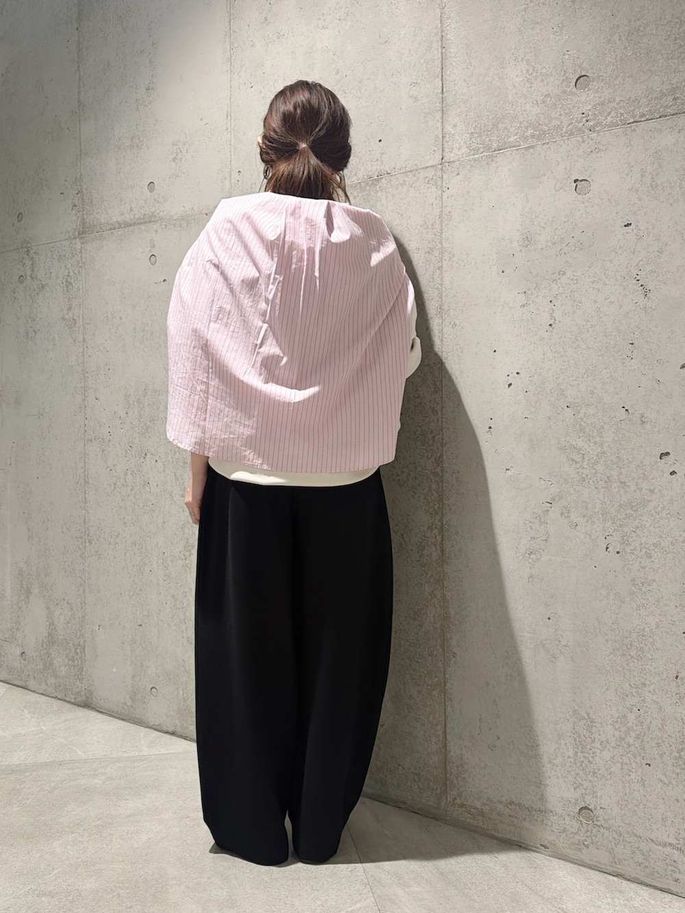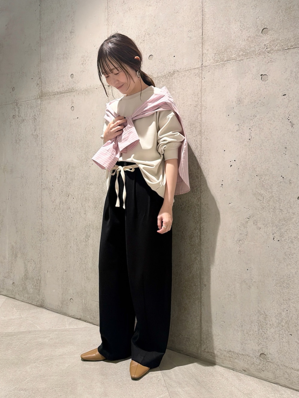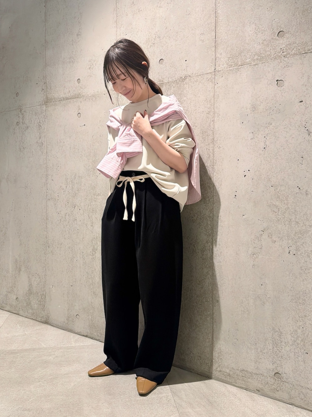 今回は、ウエストの紐がポイントのパンツと合わせた、きれいめカジュアルコーディネートです。