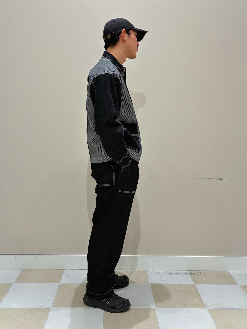 キャップとシューズもブラックで統一することで、コーデ全体にまとまりを持たせつつ、ディテールのデザインが際立つスタイリングです。