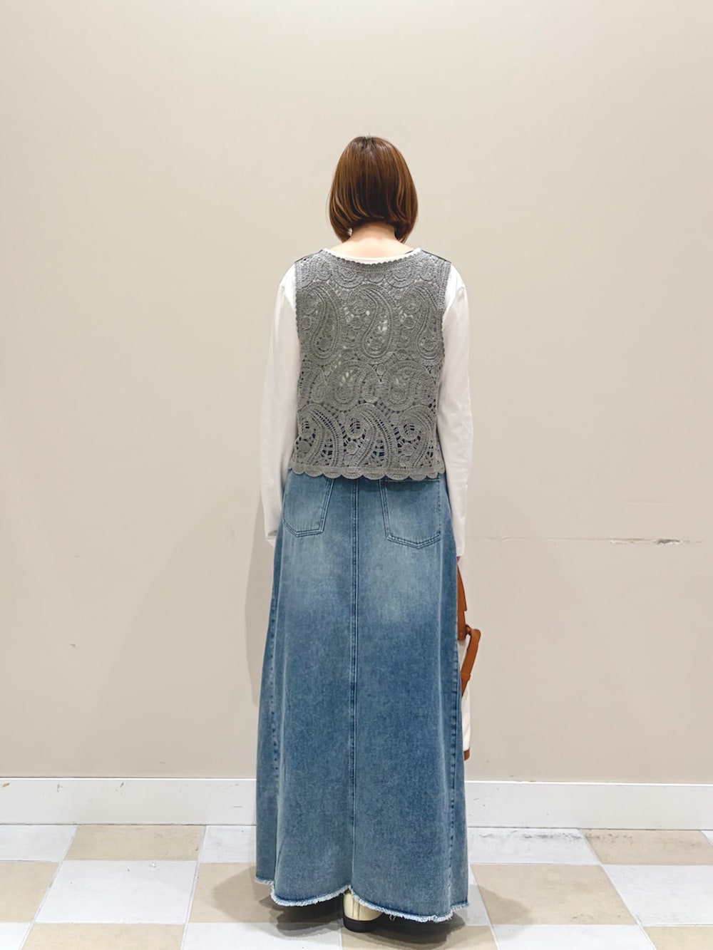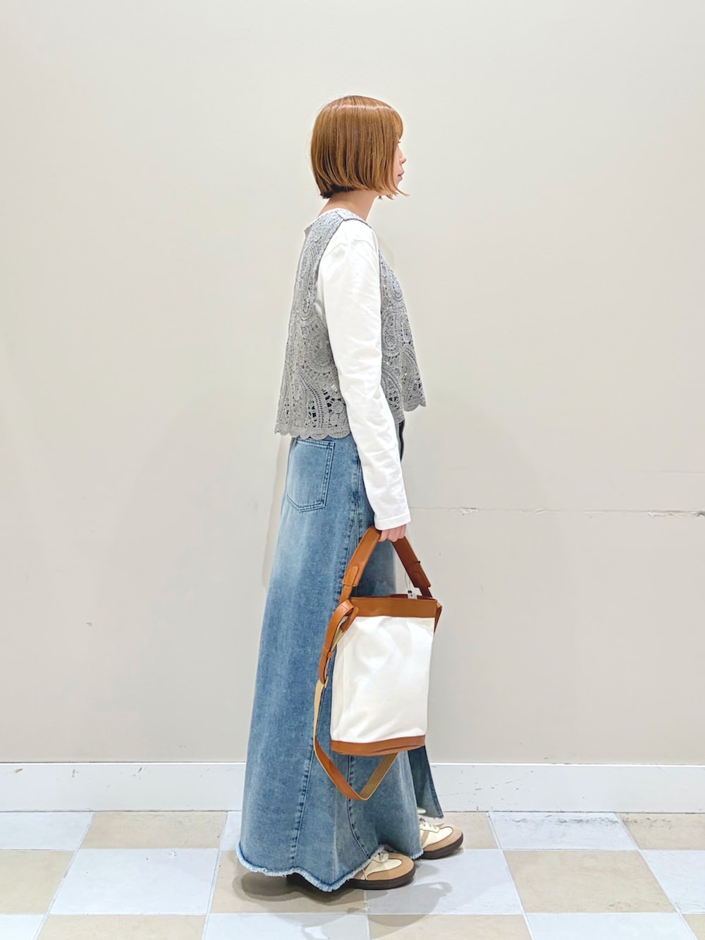 カギアミニットのベストとロンTセットアイテムにデニムロングスカートを合わせたカジュアルなスタイルです!