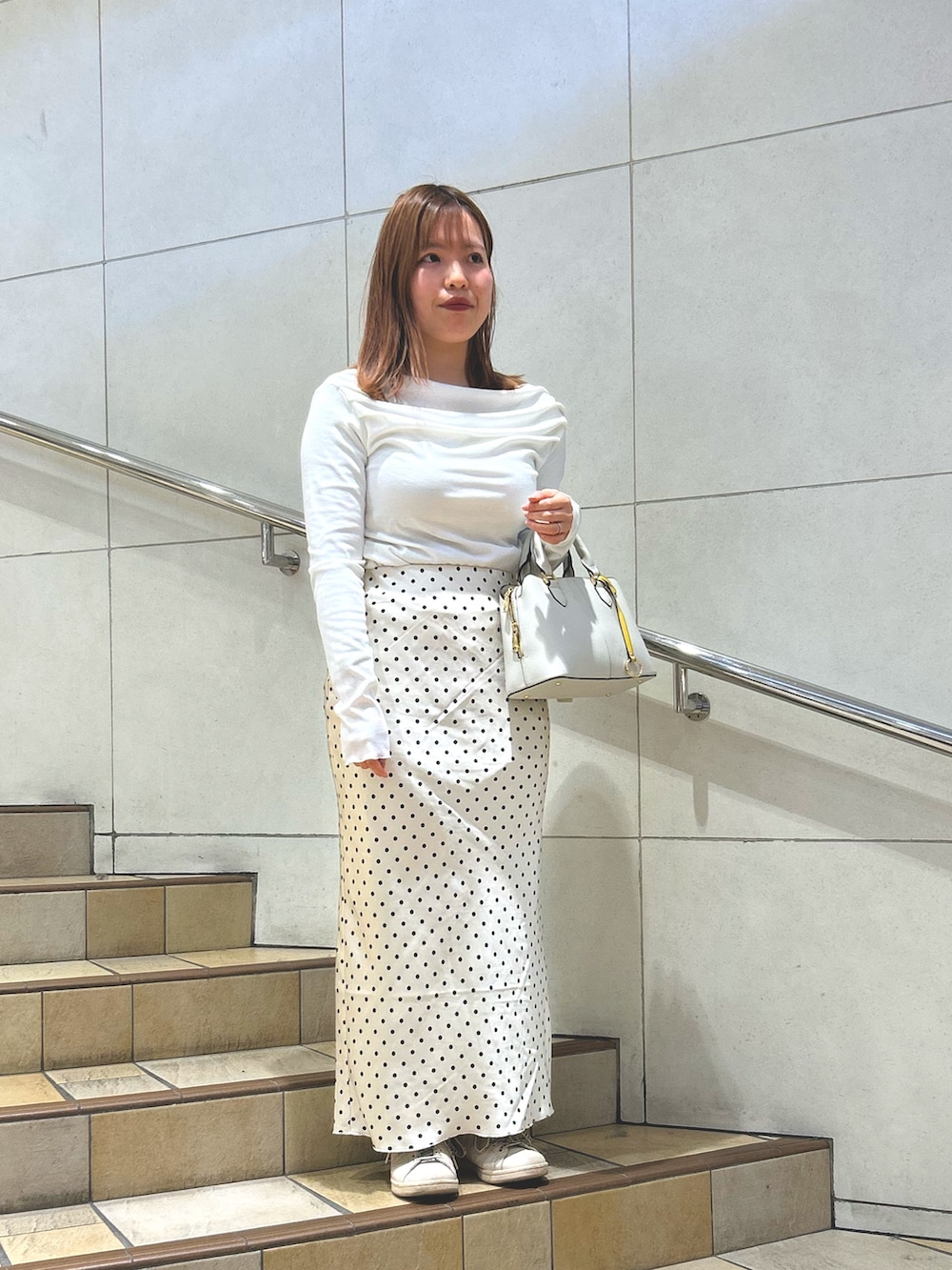 チャコールののトレンチコートに、白トップスとドット柄スカートを合わせた上品コーデです!