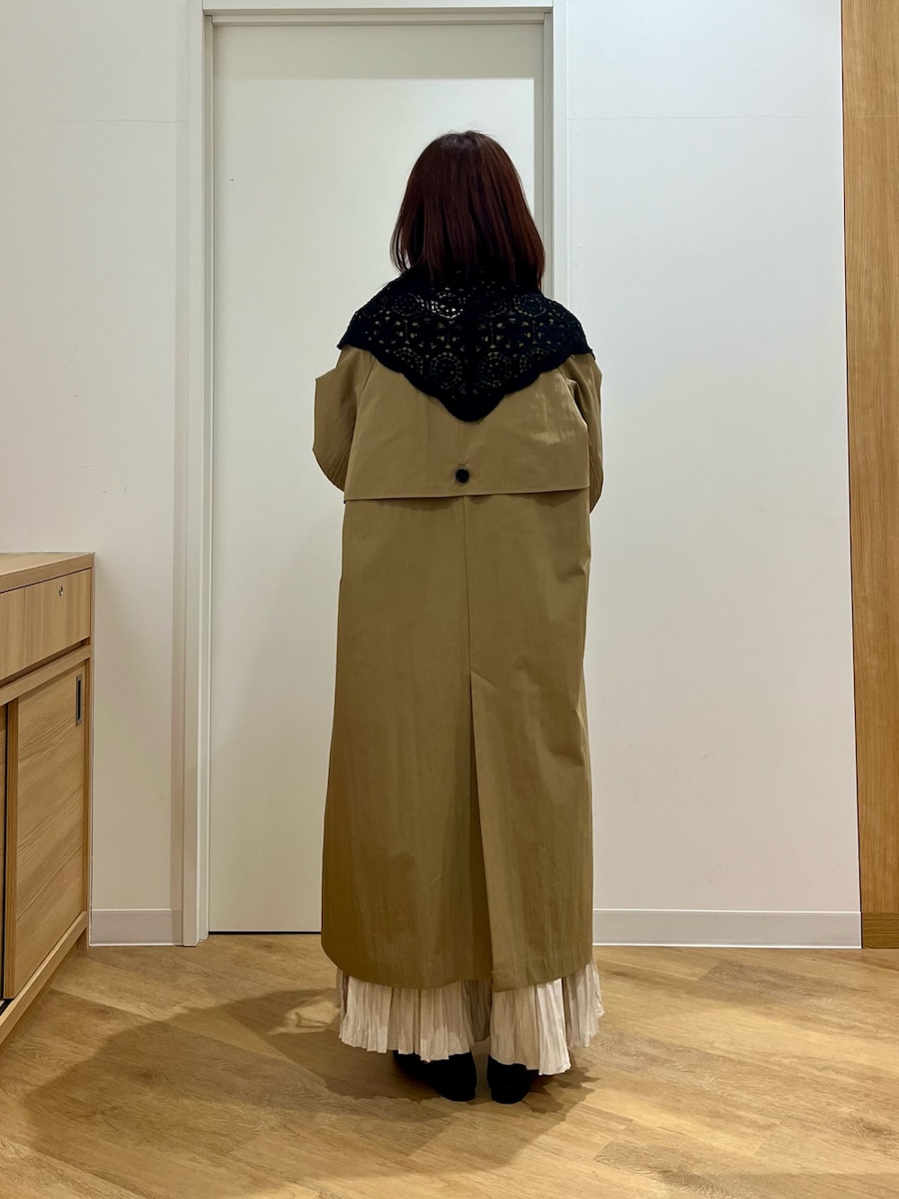 コートの上からレーススカーフをプラスしてアクセントに。