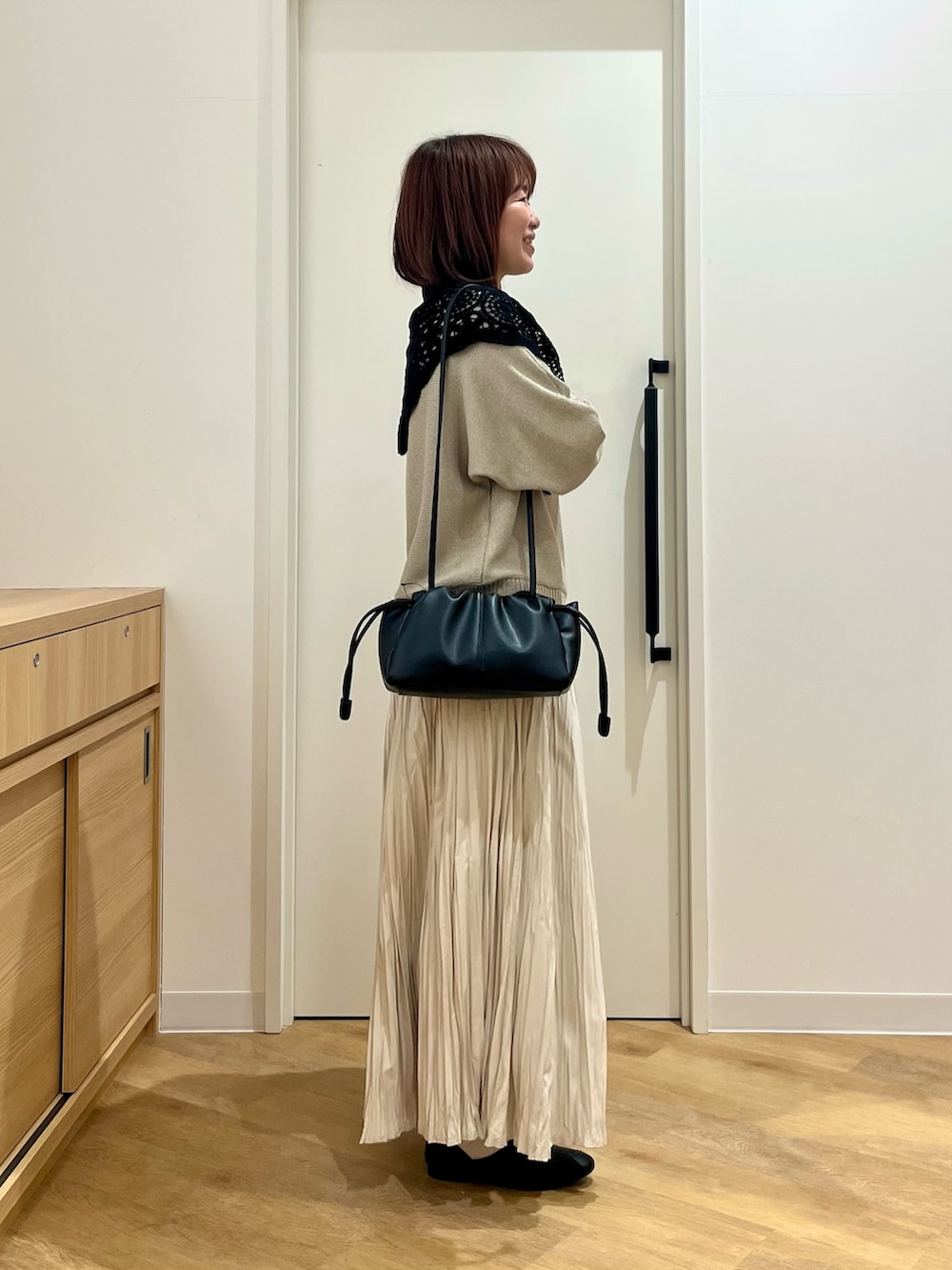 小物はすべて黒で引き締めました。