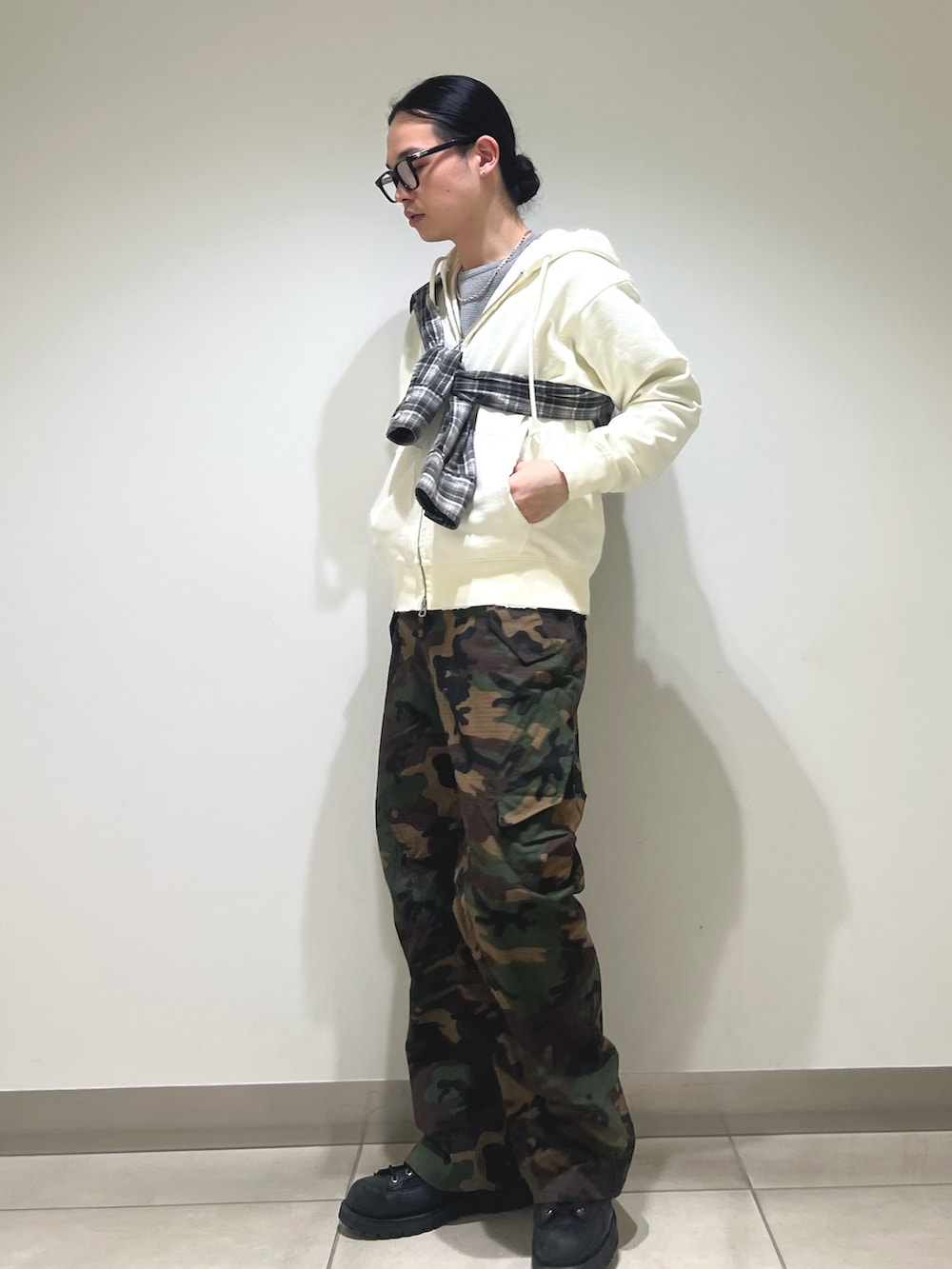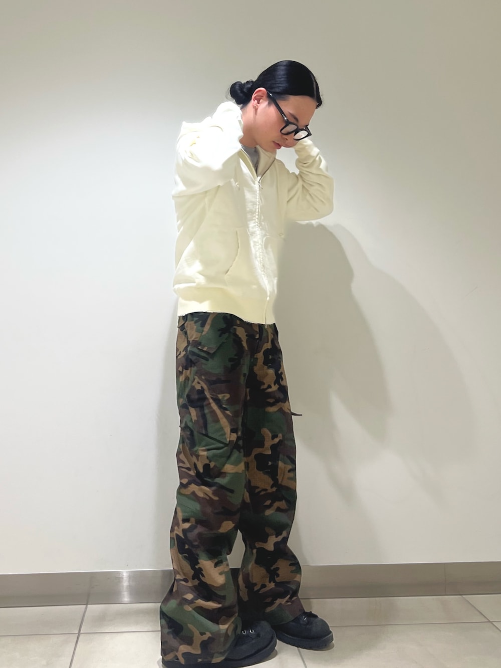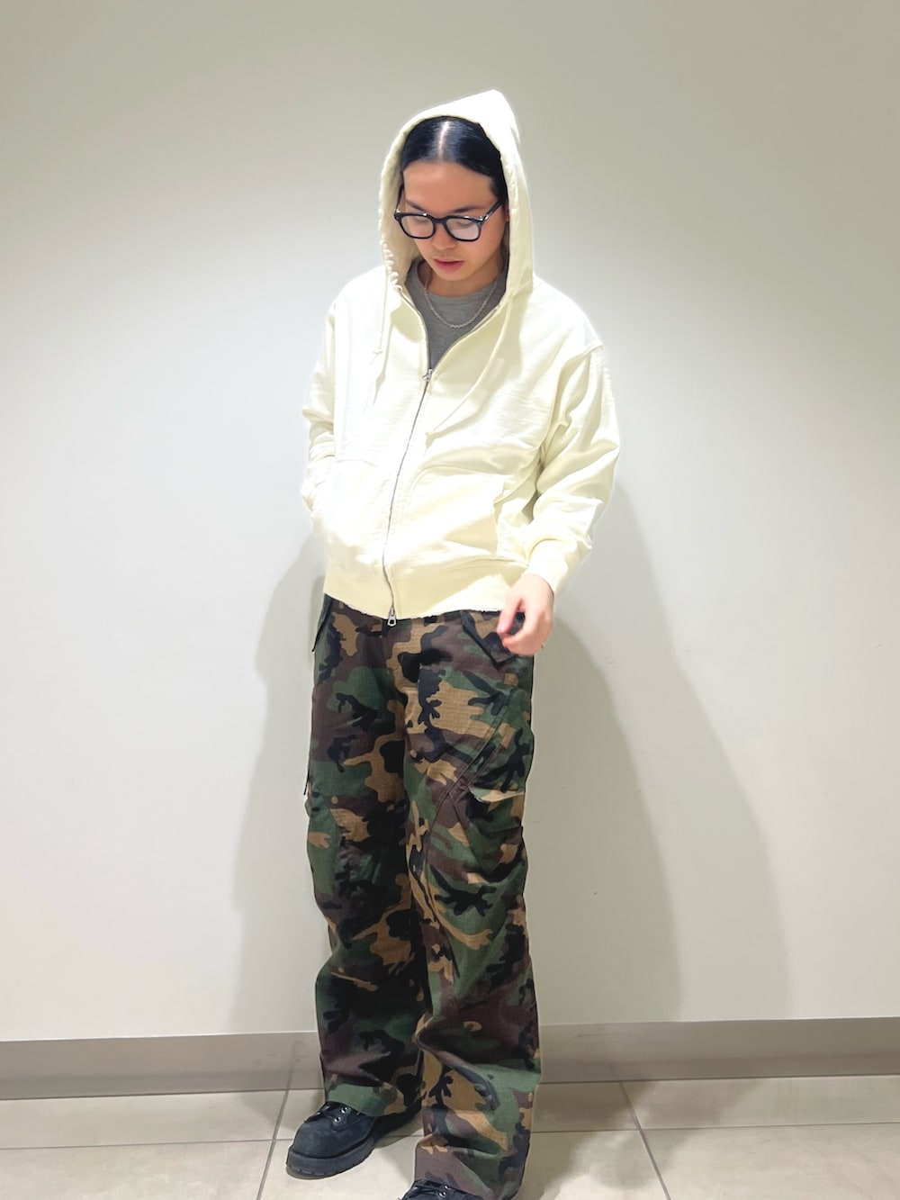 迷彩カーゴにジップパーカー。