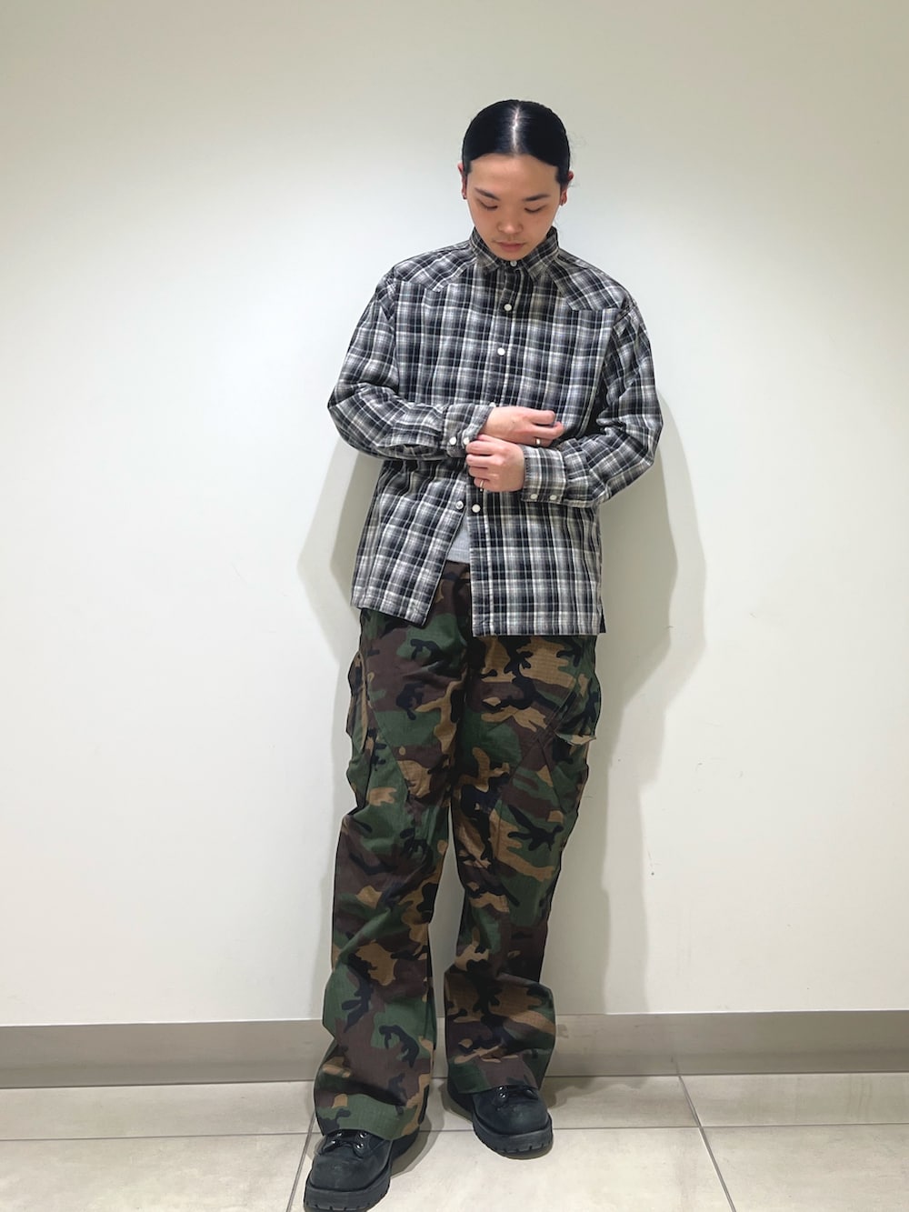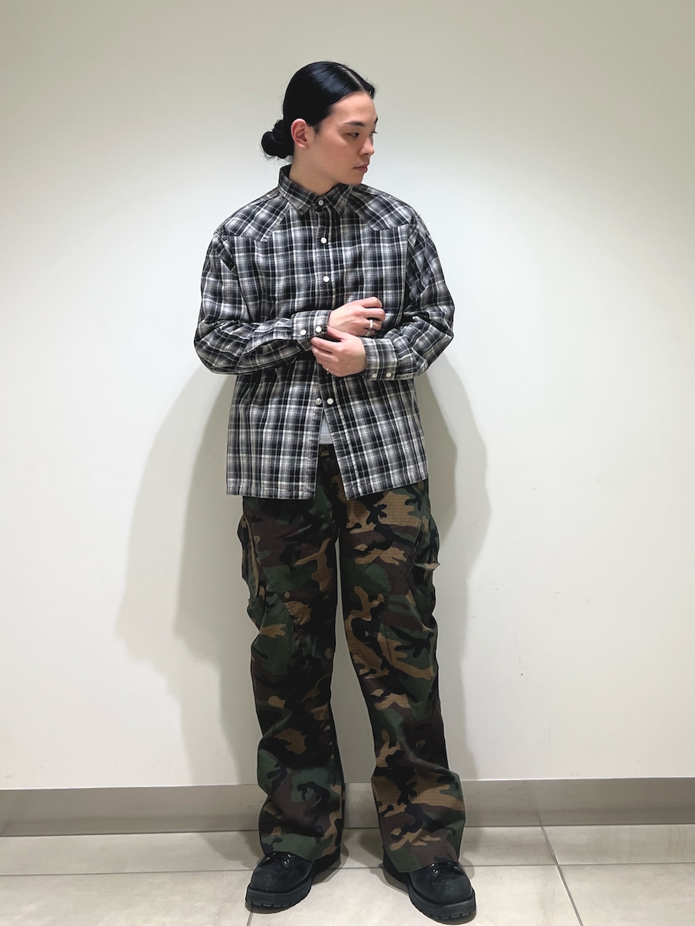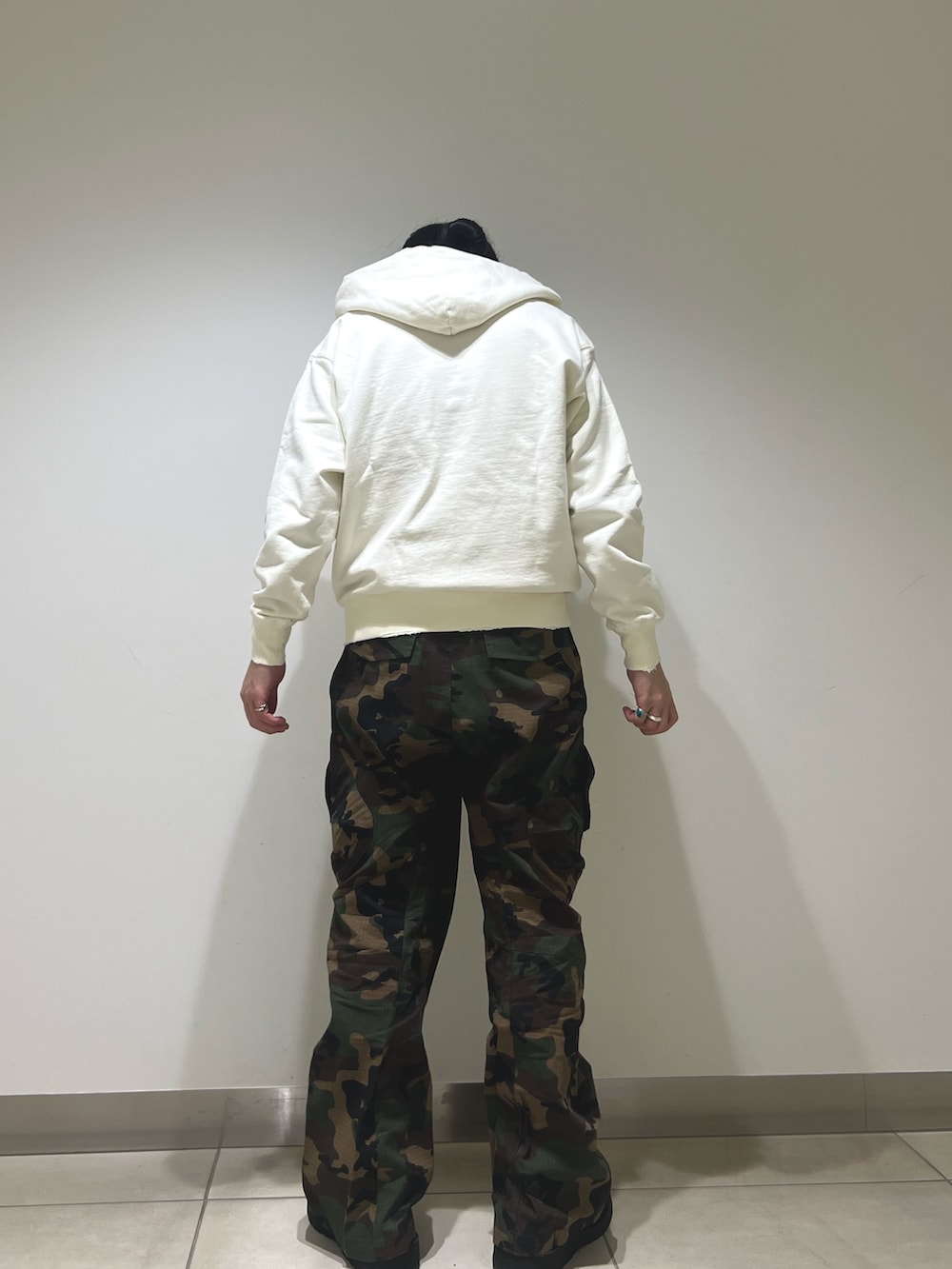 迷彩カーゴにジップパーカー。