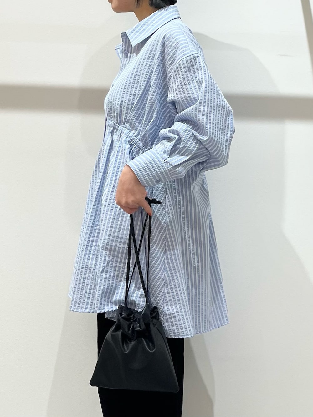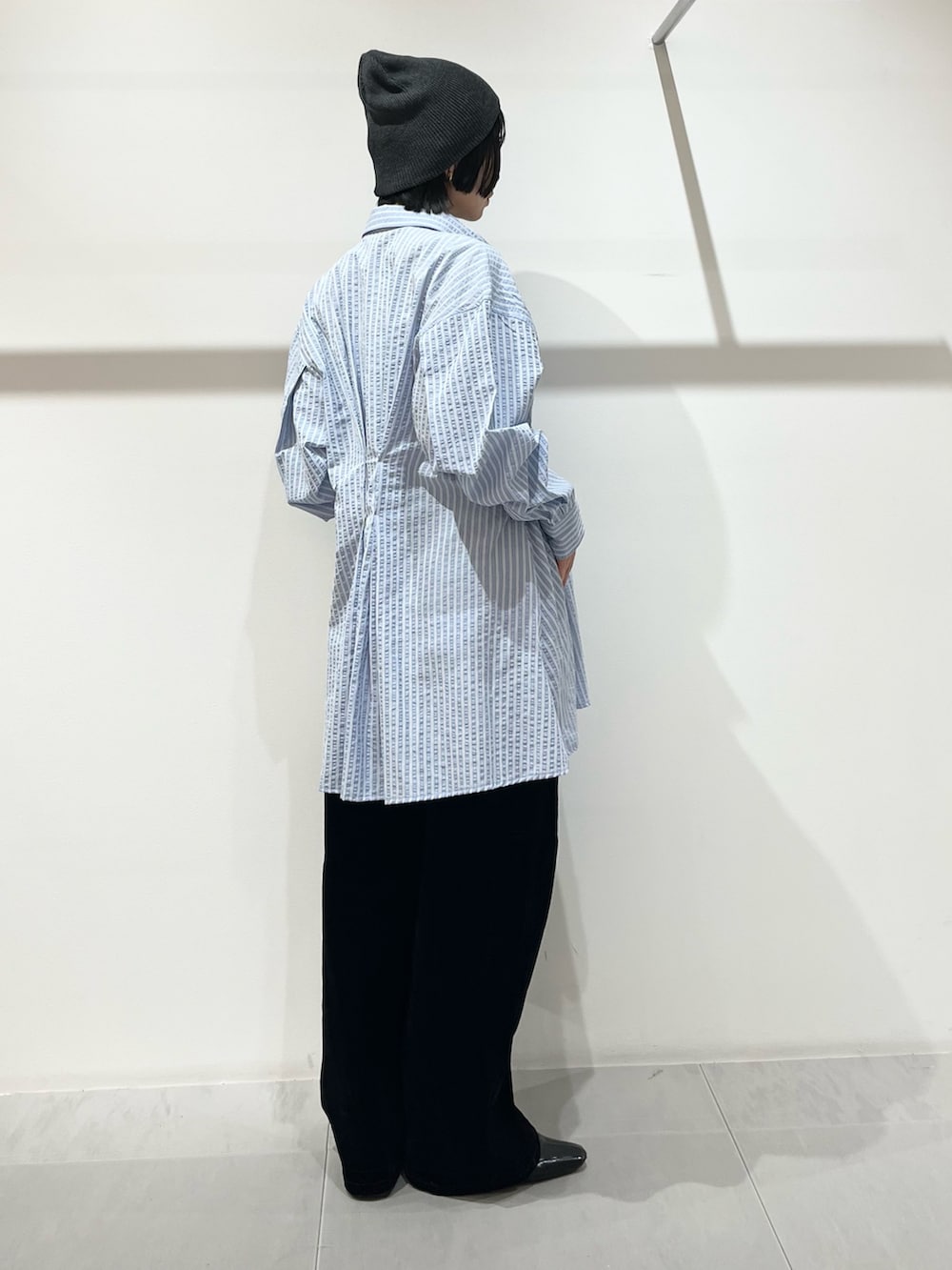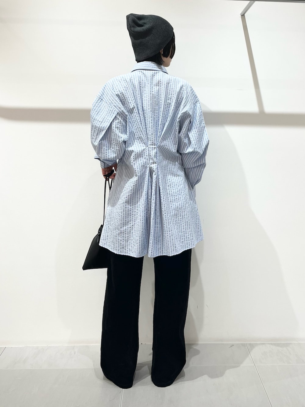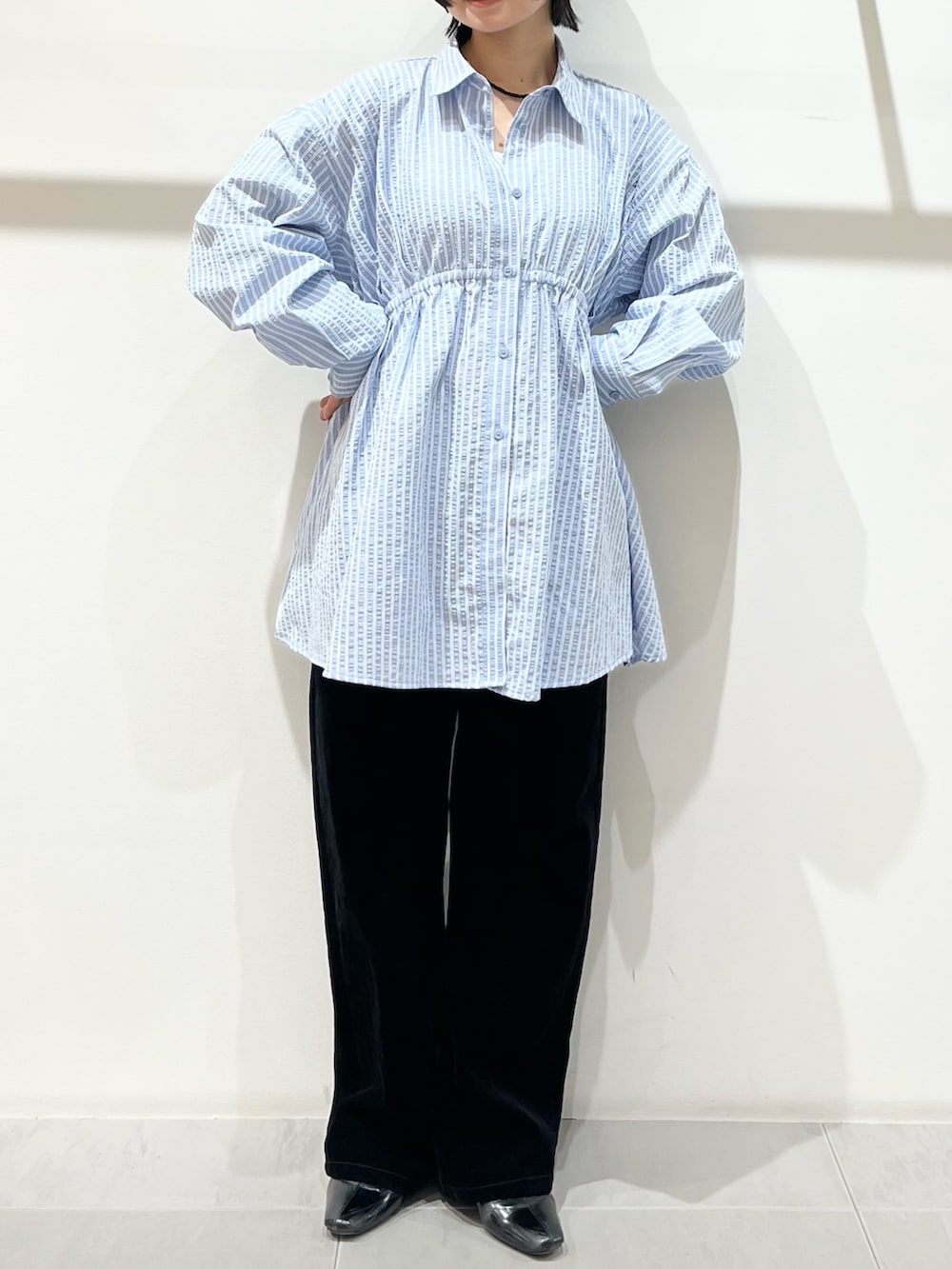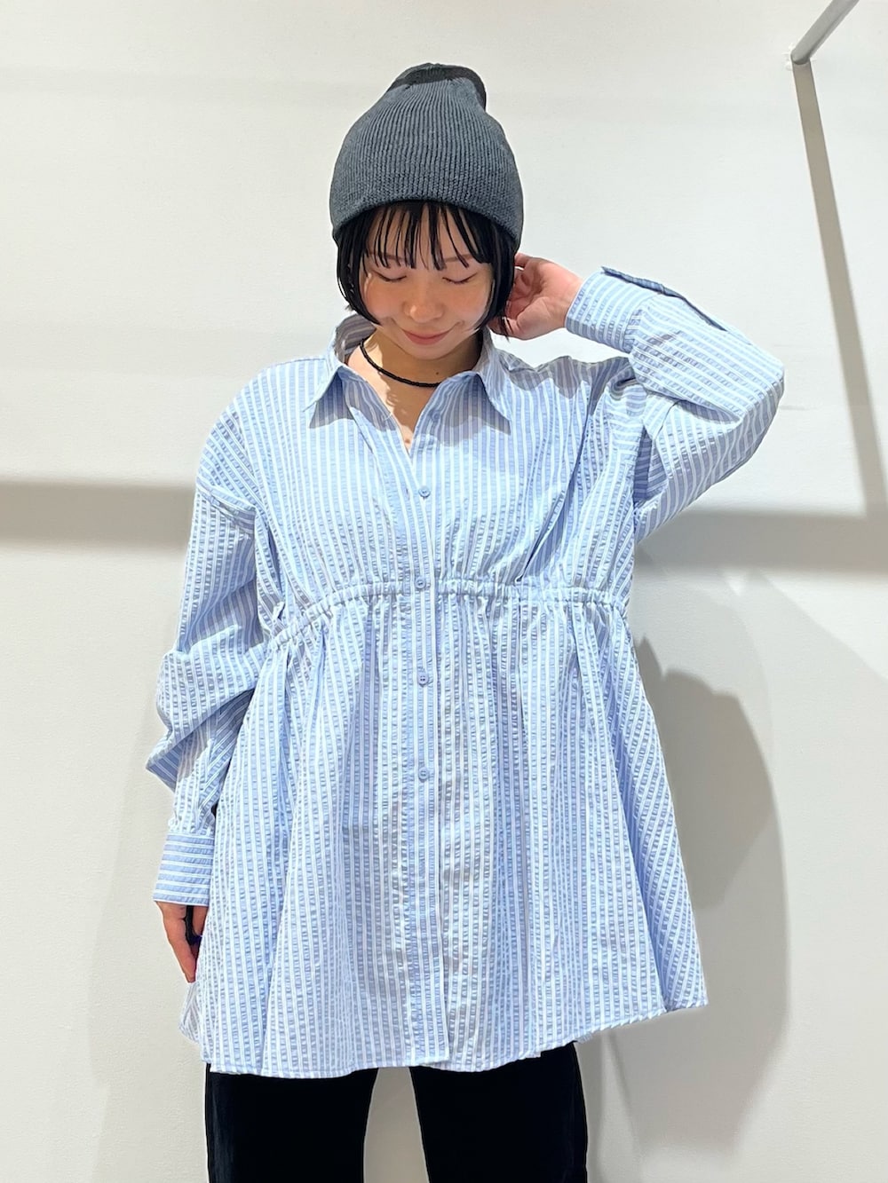 白っぽい青が合わせやすいです!タックが入っているので着るだけでバランスがとれます。