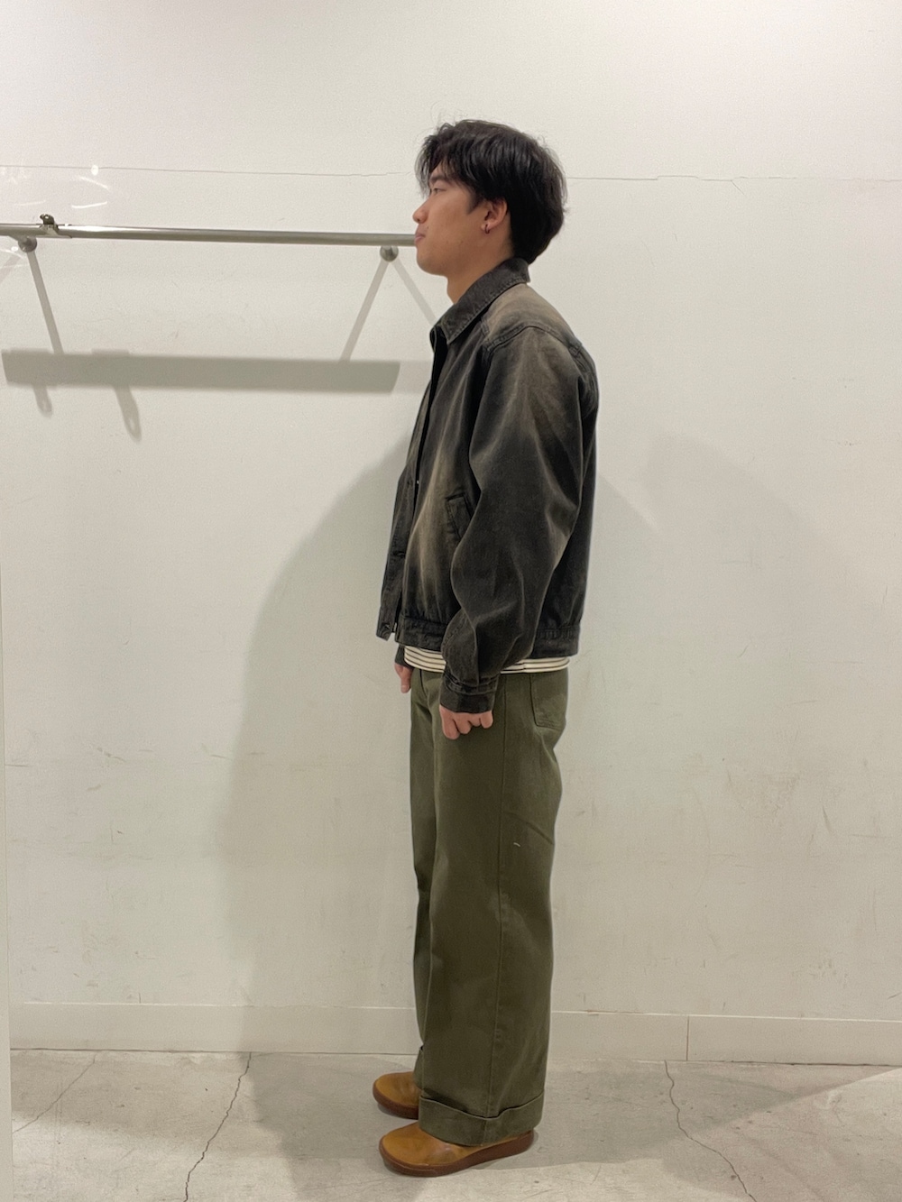 黒デニムジャケットにボーダーのヘンリーネック!カーキのカツラギパンツで落ち着いたカジュアルに!!