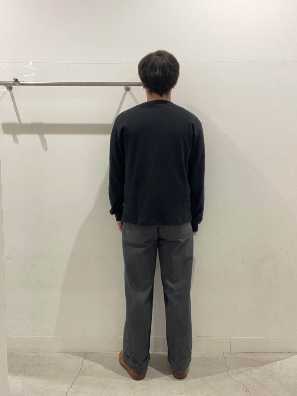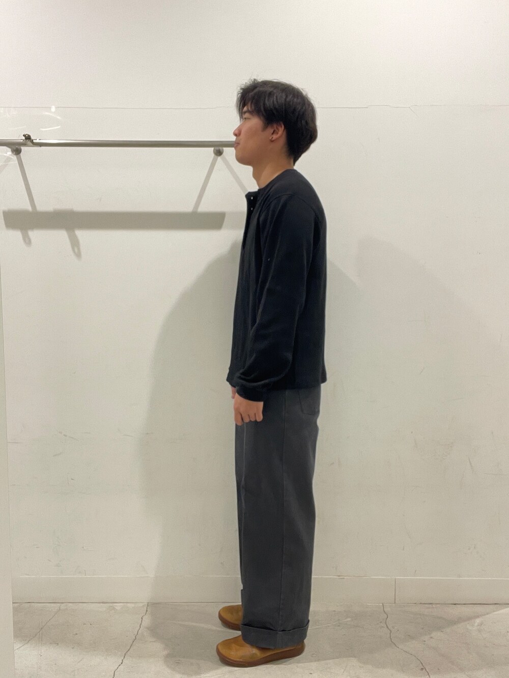 黒のヘンリーネックTにグレーのカツラギパンツ。