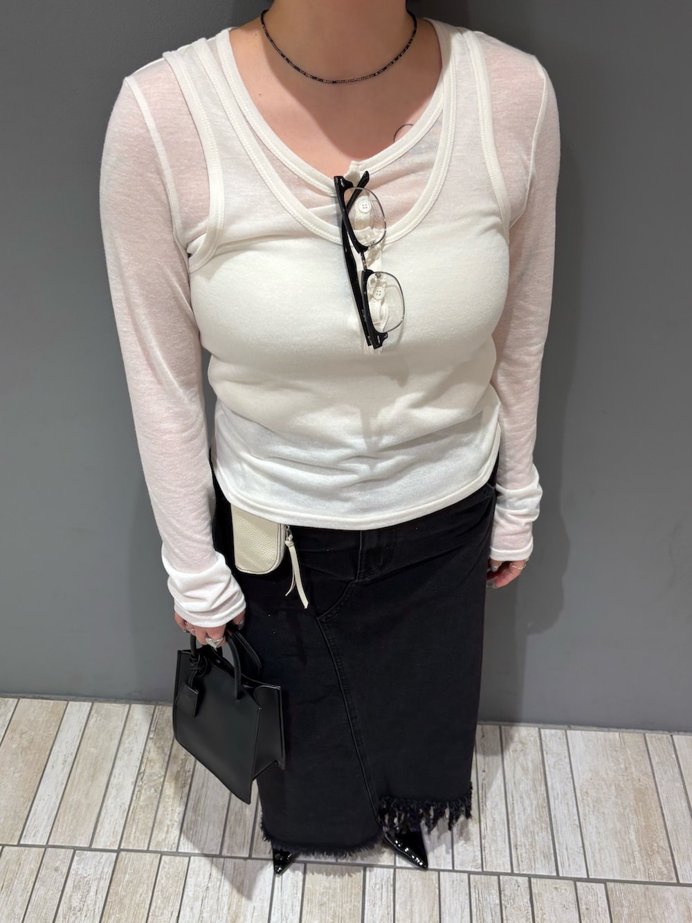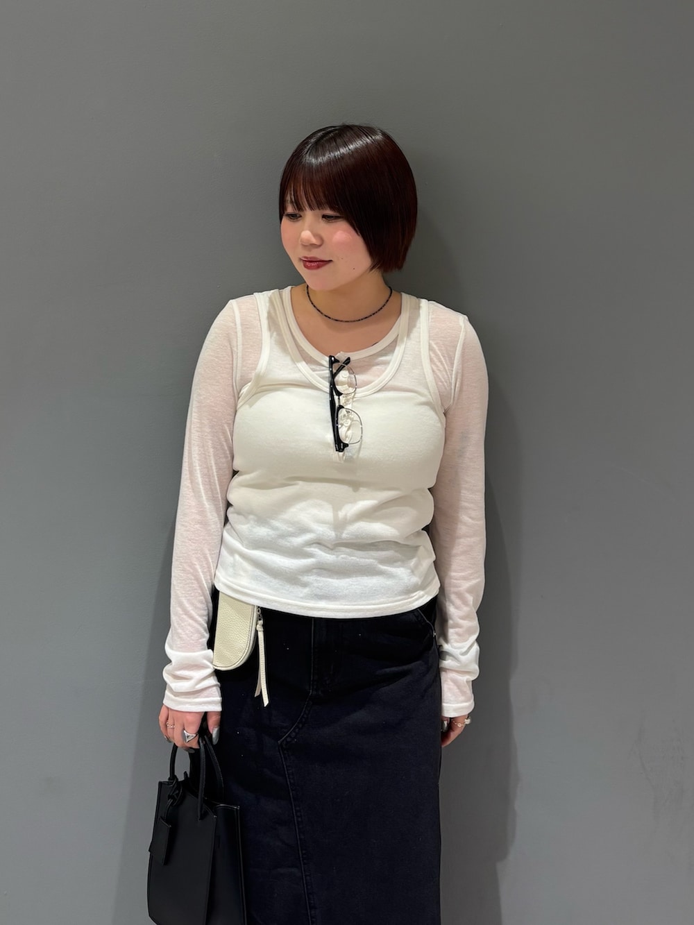 着てみた感じ、ピチピチの1歩手前ぐらいのフィット感だったので骨格ストレートさんでも問題なく着ていただけます🫶🏻着たときの肌触りも良くカットソーとタンクトップが別々で使えるのも着回し力が高くてイチオシです⁼³₌₃