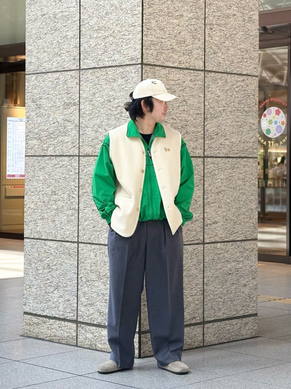 かなりビッグなジャッケットなのでアウター感覚で着れます!シルエットがかなり特徴的なので、ジャッケットの上から着るクセありがおもしろうです。