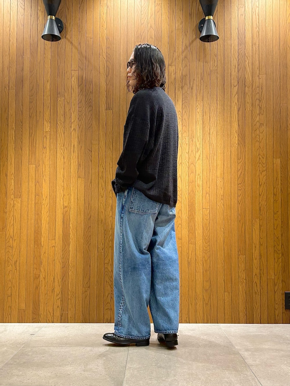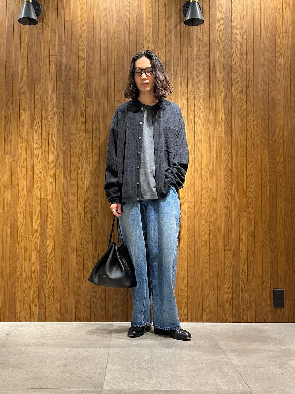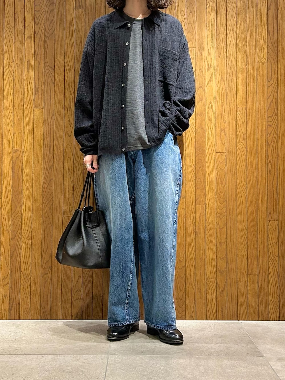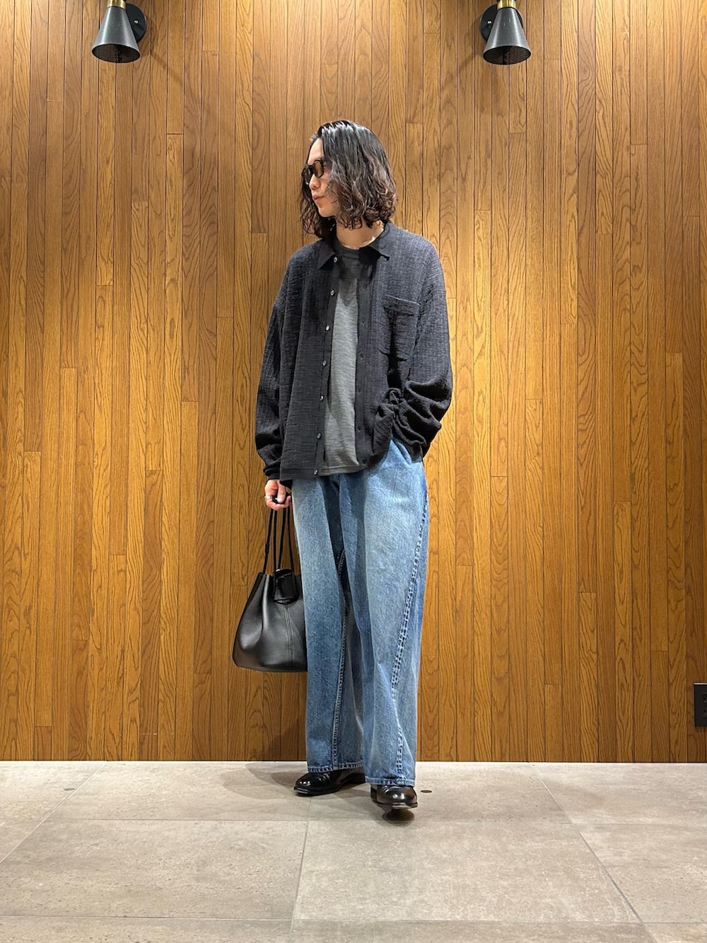 ニットシャツを羽織ってカジュアル過ぎないバランスで組んでいます。