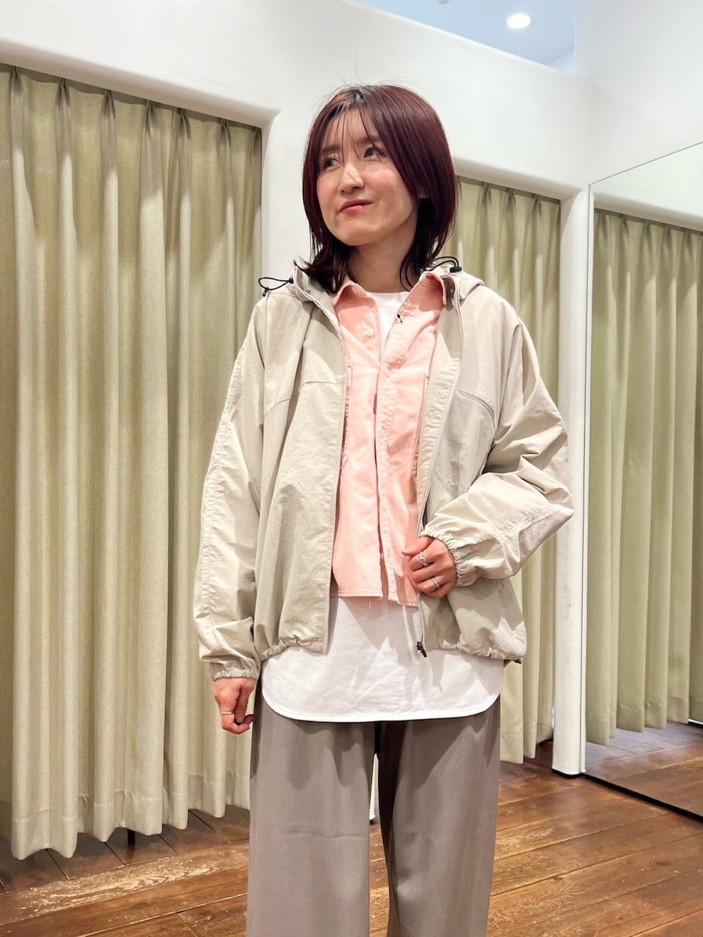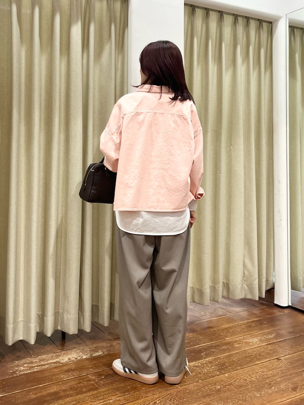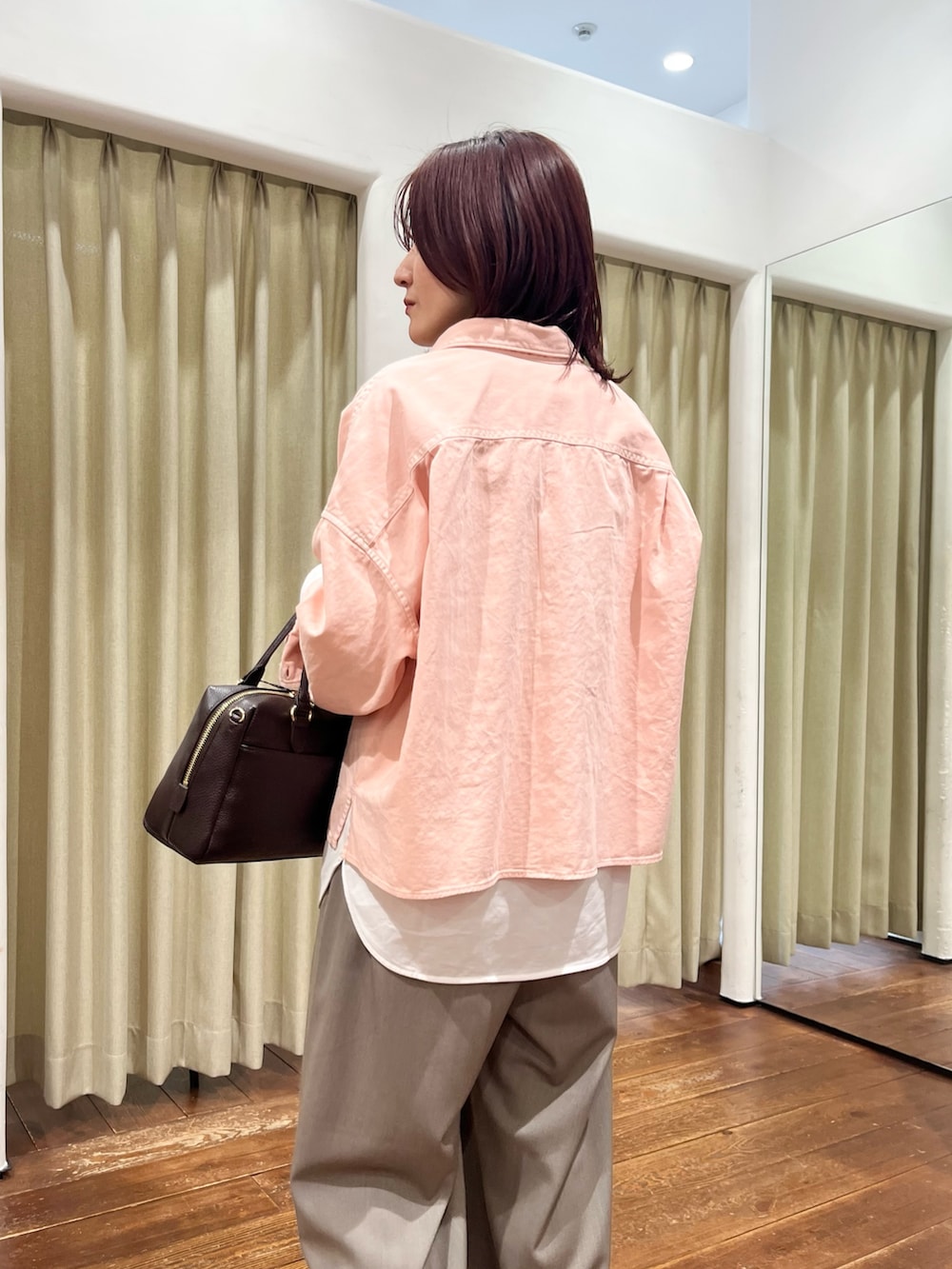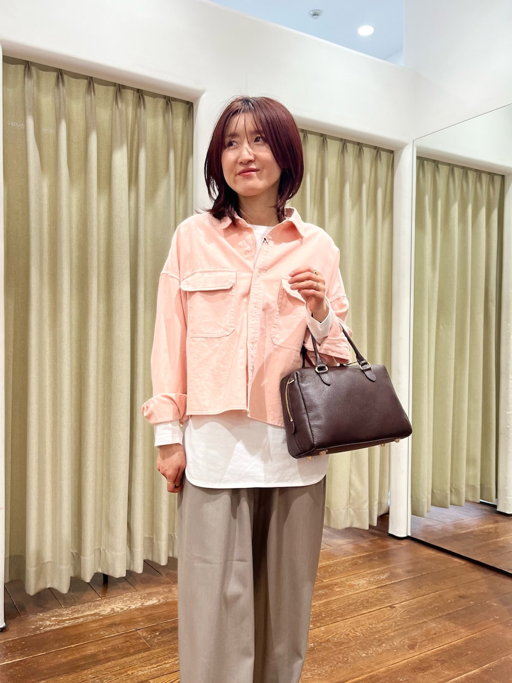 ピンクのシャツはボタンを留めてトップスとして着るのもおすすめです!丈が短めなのでレイヤードでカットソーと合わせるのも◎