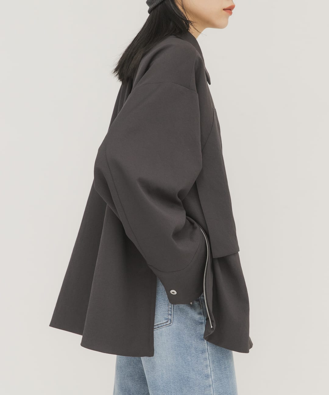 サイドにはファスナーがついていて開いて着るとシルエットが変わるのでお洋服に合わせて楽しめます!!