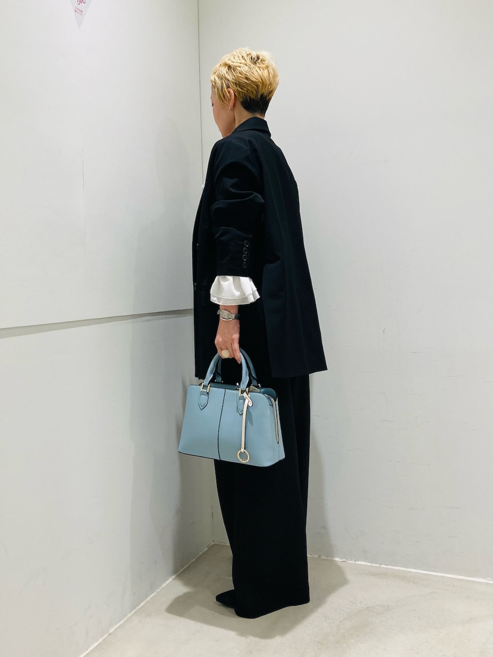 サックスブルーのバッグをポイントに華やかさをプラスしました🌸