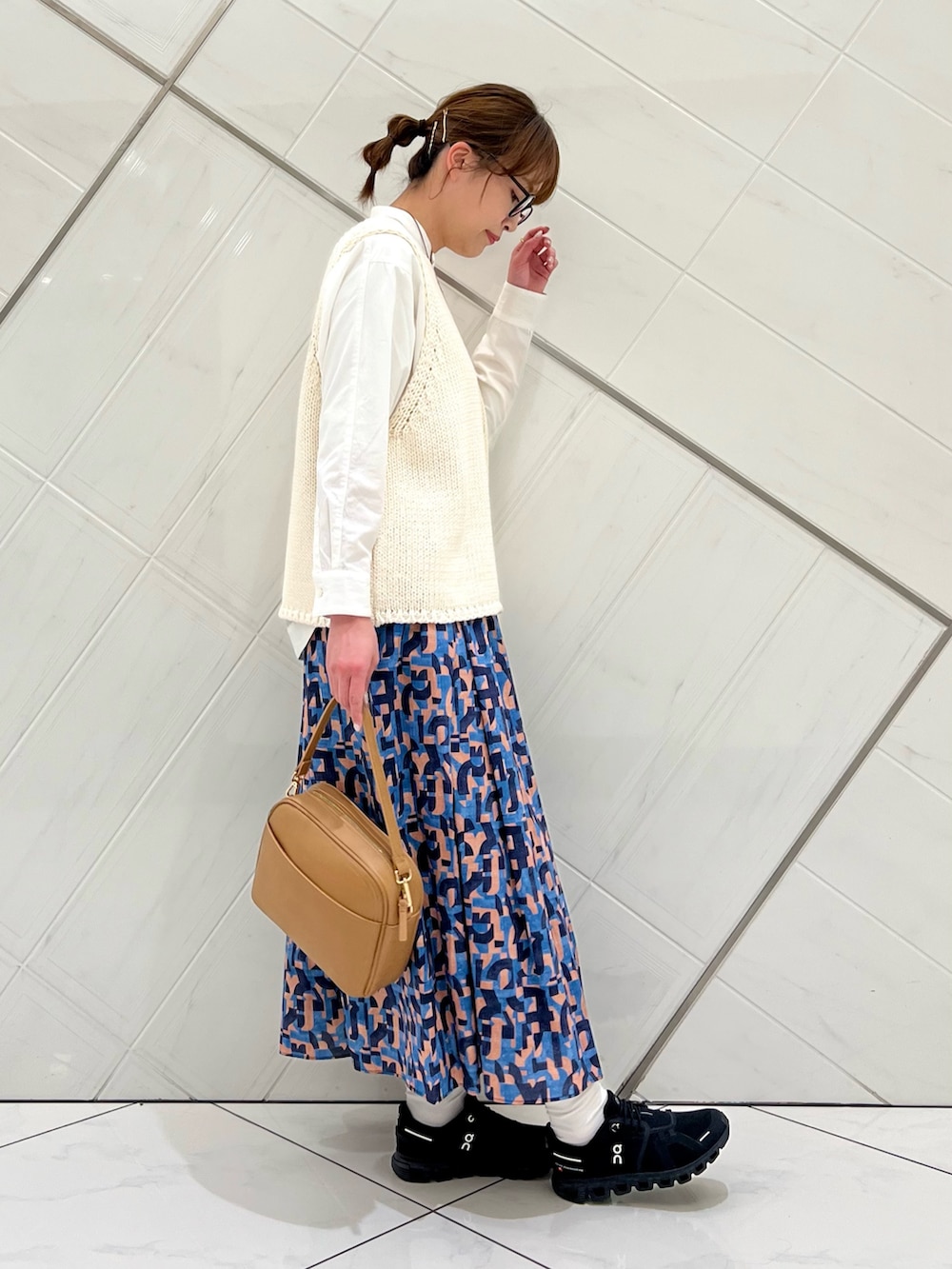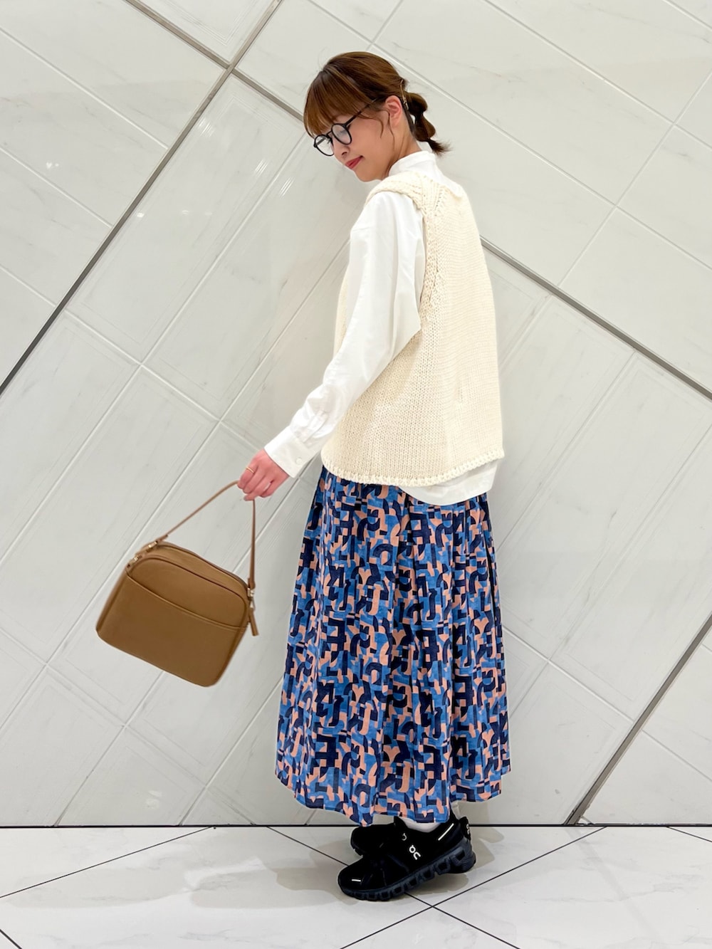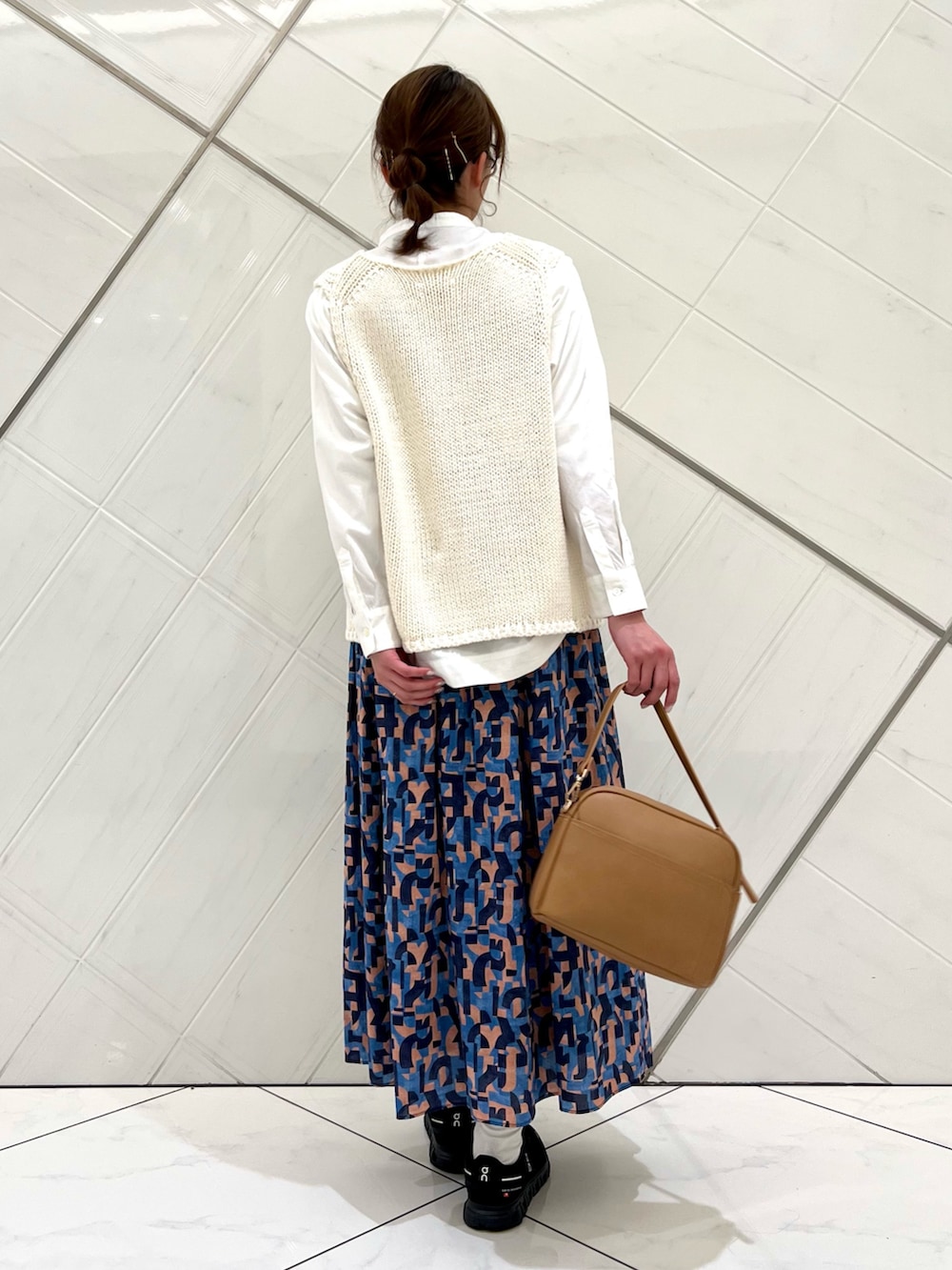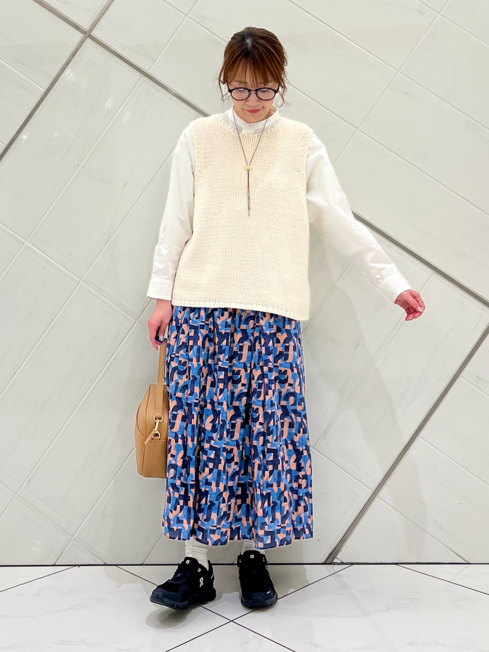 個性的な柄が目を惹くスカートもシンプルな