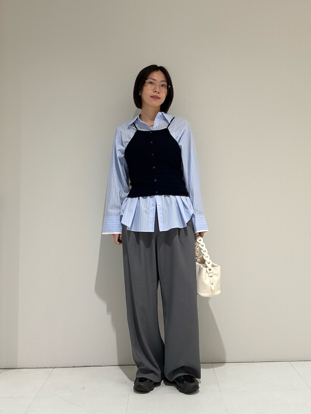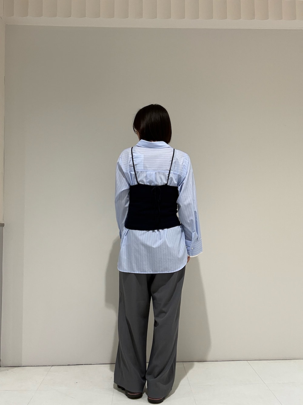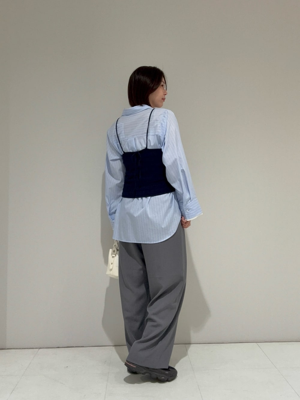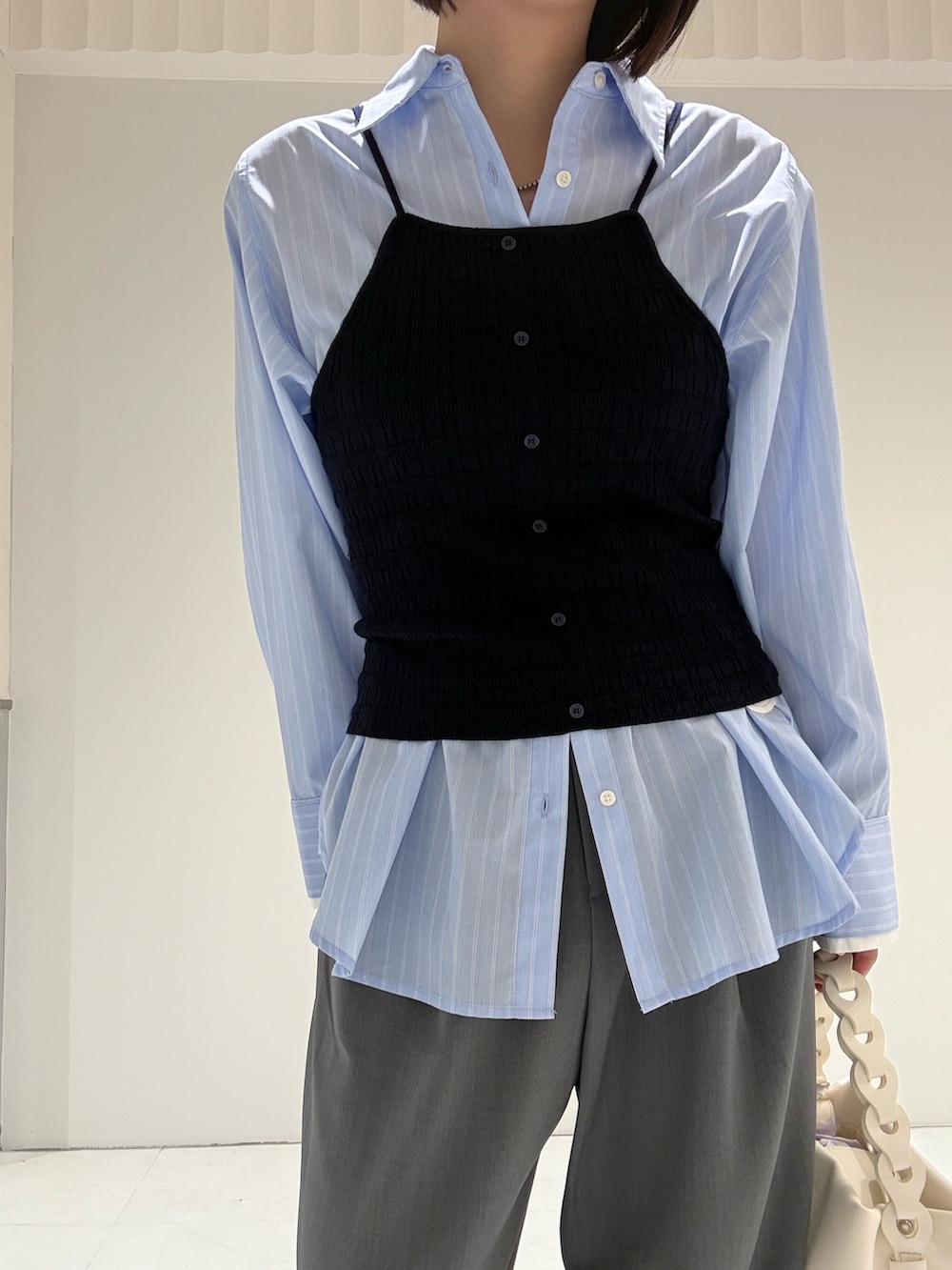 シャツ×スラックスの定番コーデにビスチェ追加でさらに可愛く🫶