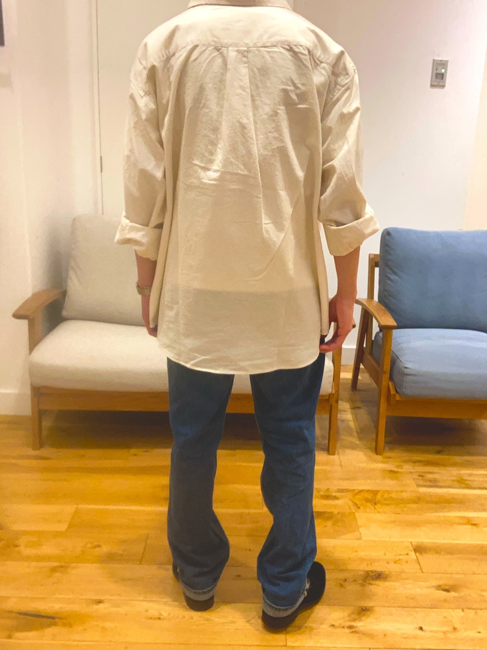 綿100でオフホワイトのこのシャツは春っぽく優しいイメージを出してくれるのでお気に入りです。