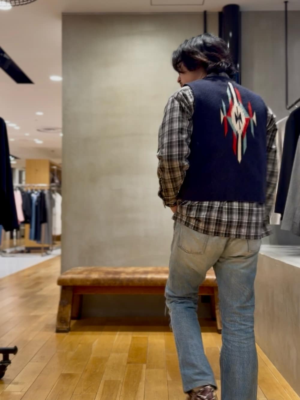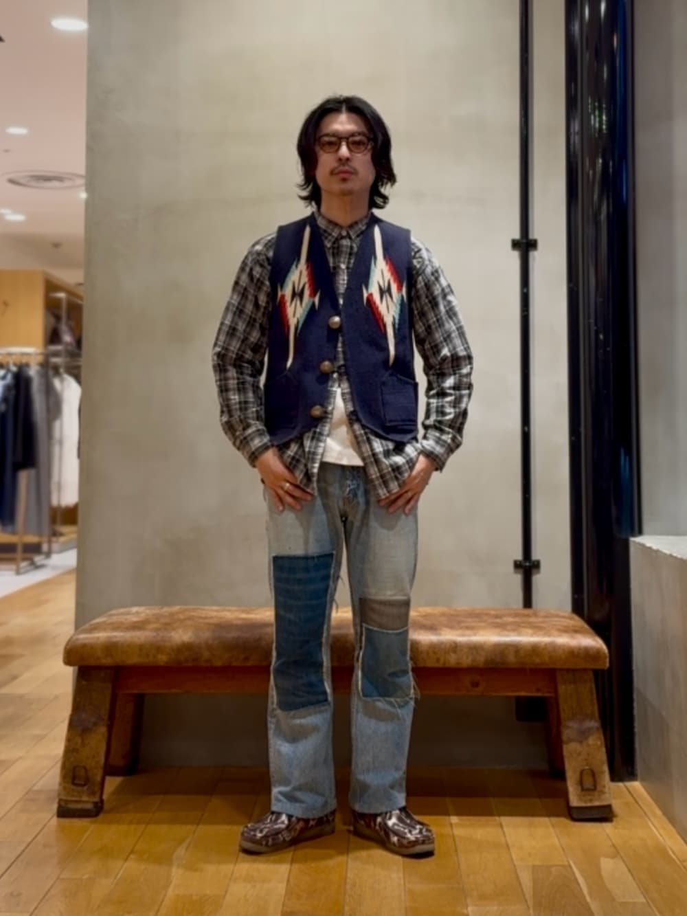デニムにチェックシャツチマヨベストを合わせて着ました。