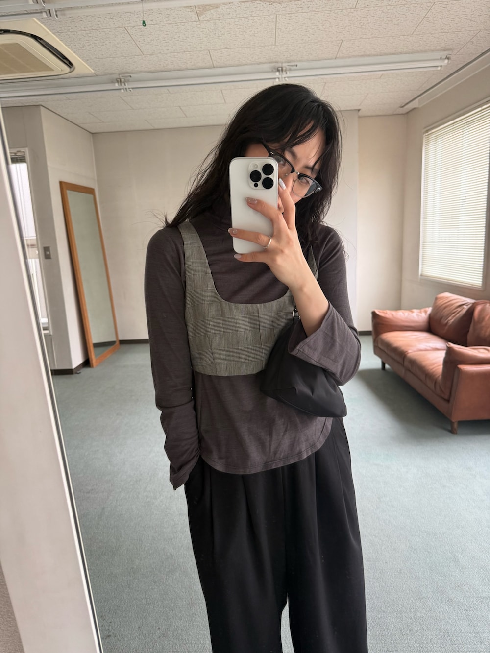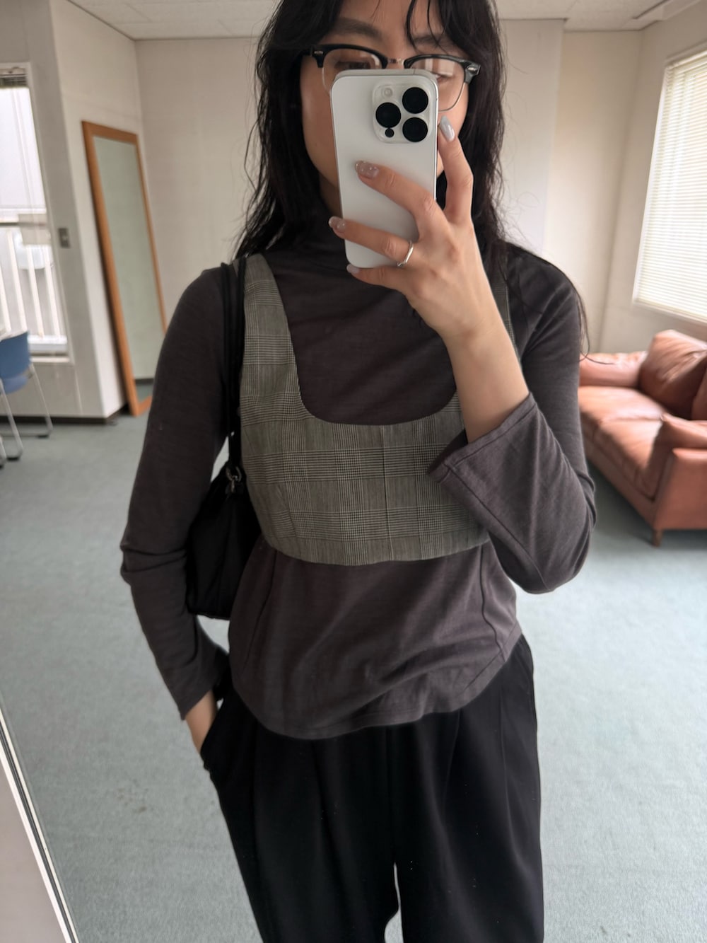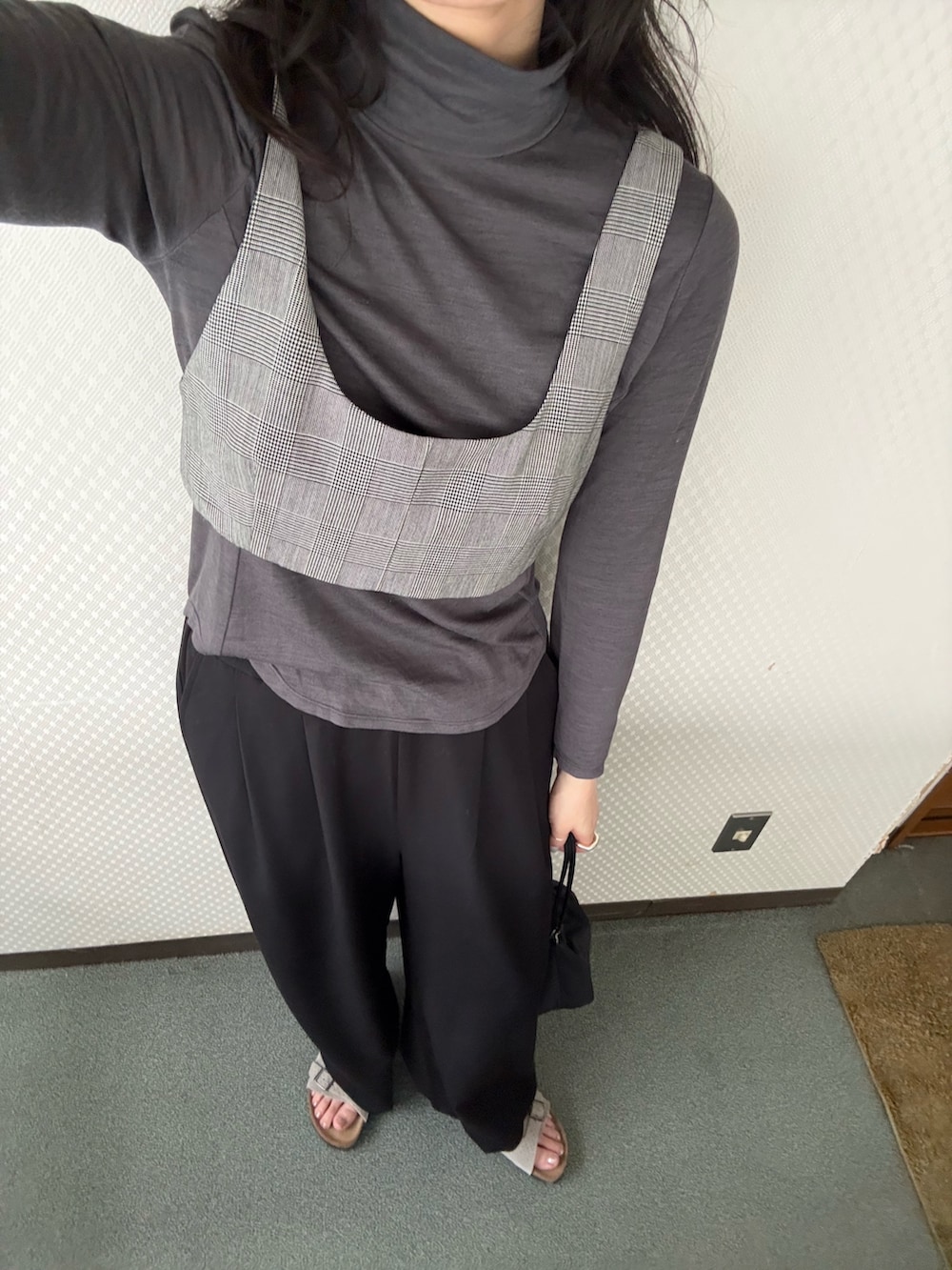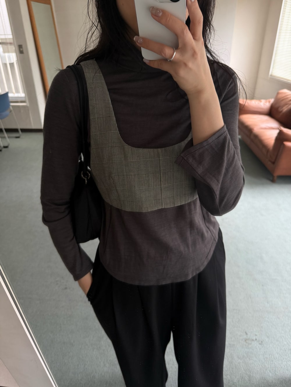 グレンチェック柄のビスチェをポイントに落ち着いたトーンでまとめました。