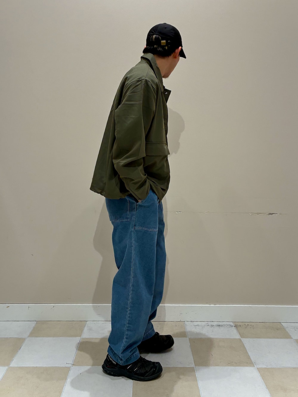 明るい色使いやキャップのカジュアルさで春に着たいシティスタイルに仕上げました。ジャケットのもつ無骨さで大人ぽさも演出しています。