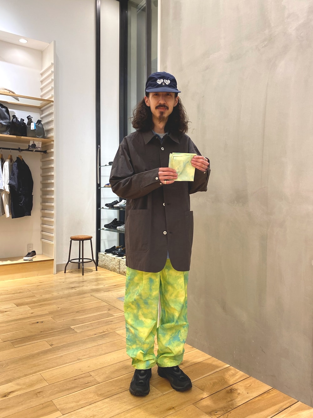 本日は一際目を引くEKALのナイロンタッサートラウザーをメインにコーディネートしております。