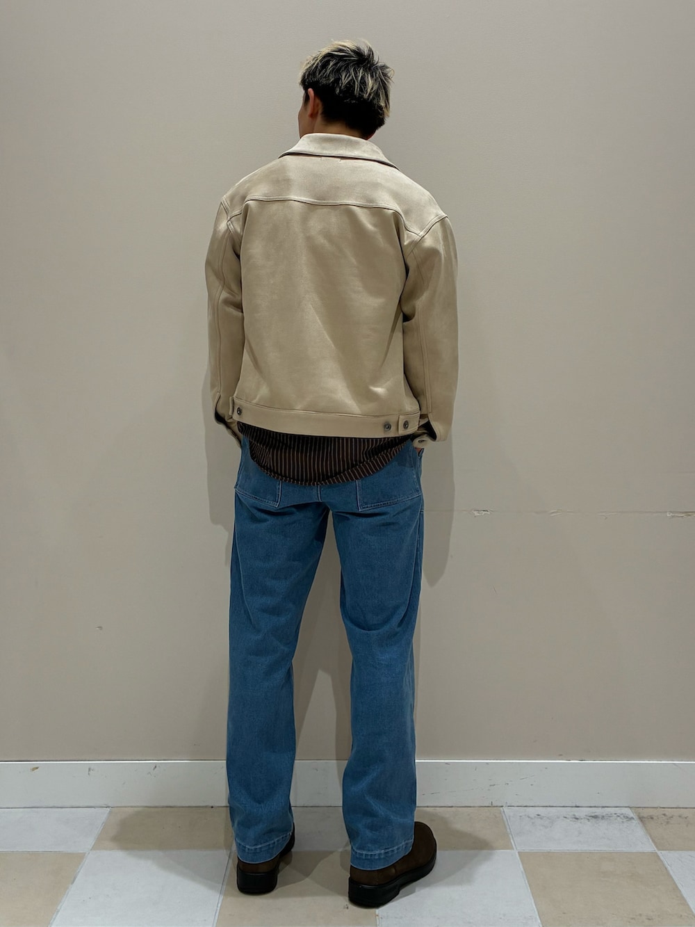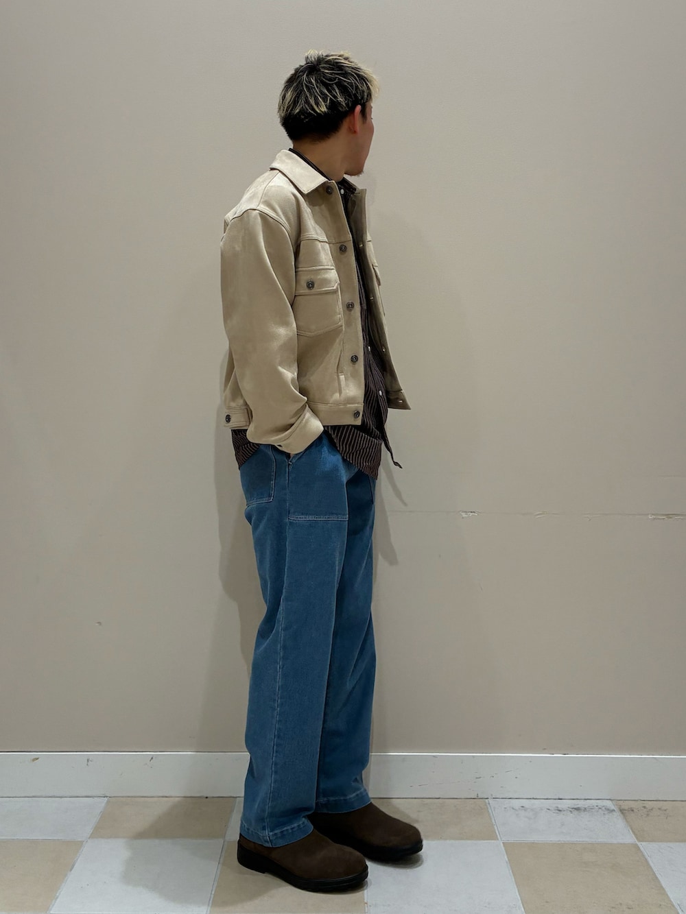 明るいアウターとパンツで春らしい雰囲気を演出。髪色とジャケット、シャツとブーツで色をひろいまとまりあるコーデに仕上げました。