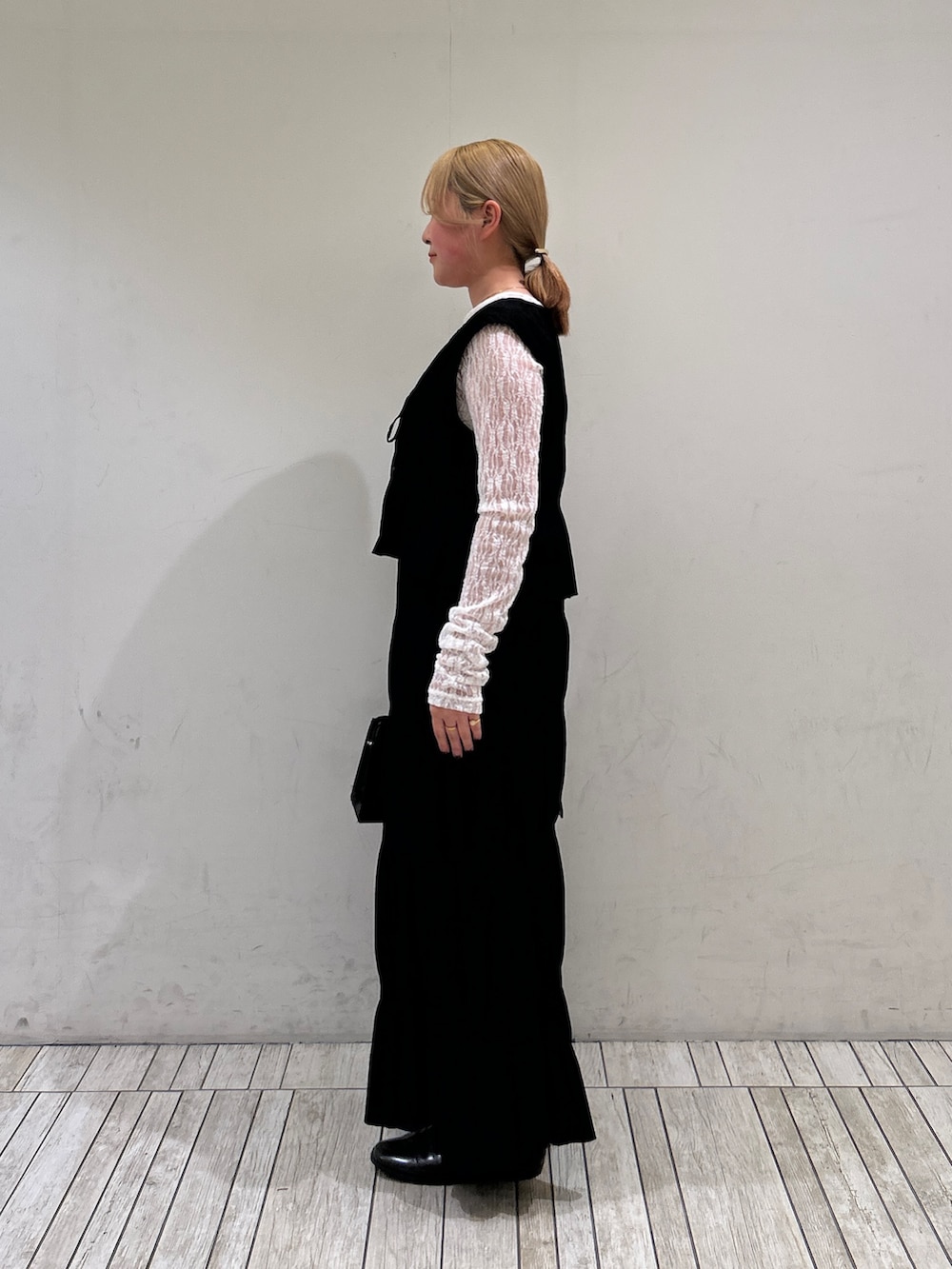 スカートはウエストが全部ゴムで着用しててすごく楽チンなのと、腰回りが張らずスッキリ見せてくれるのがポイントです❗️