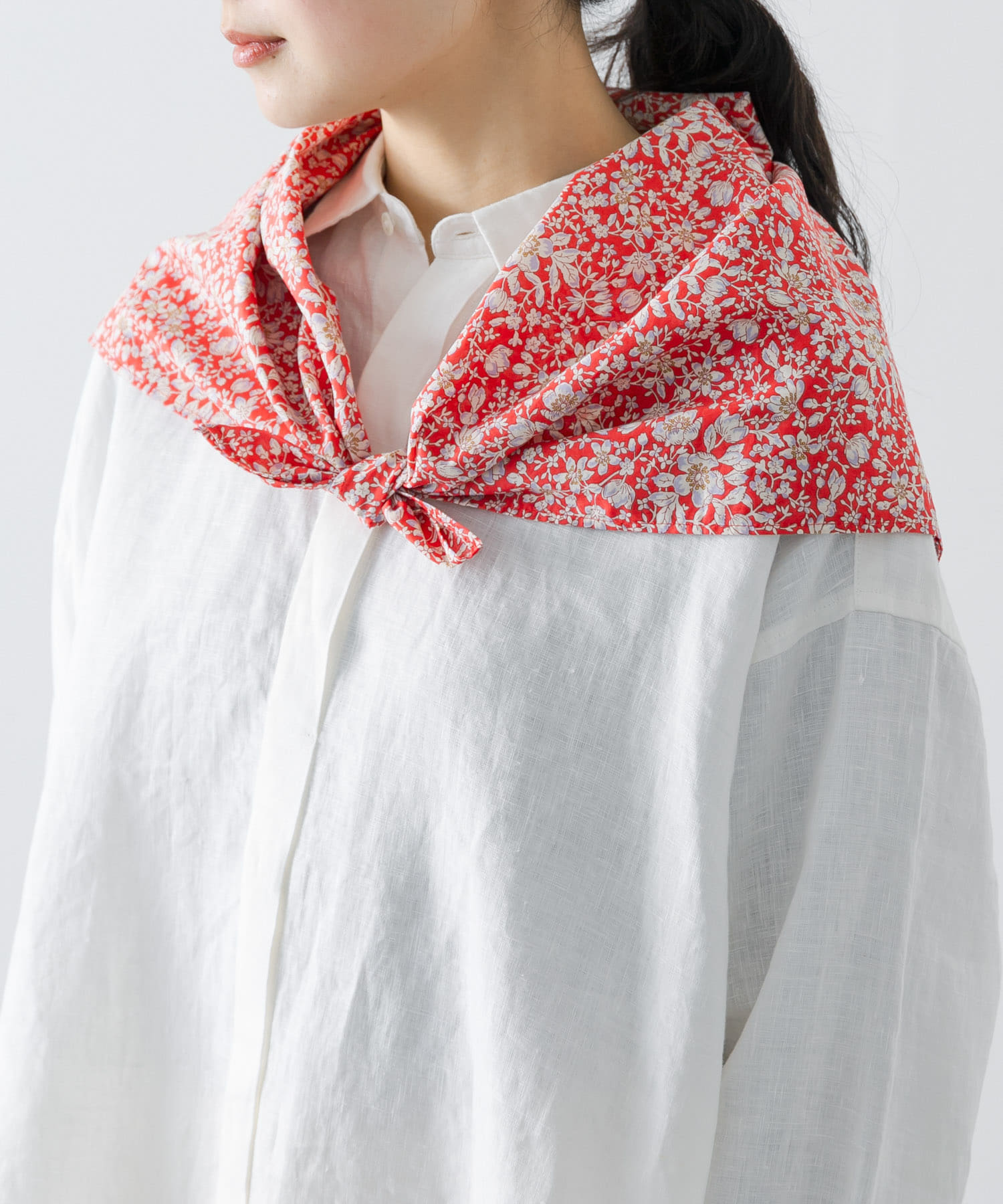 コーディネートに取り入れると一気に華やかになるリバティ生地のスカーフです。