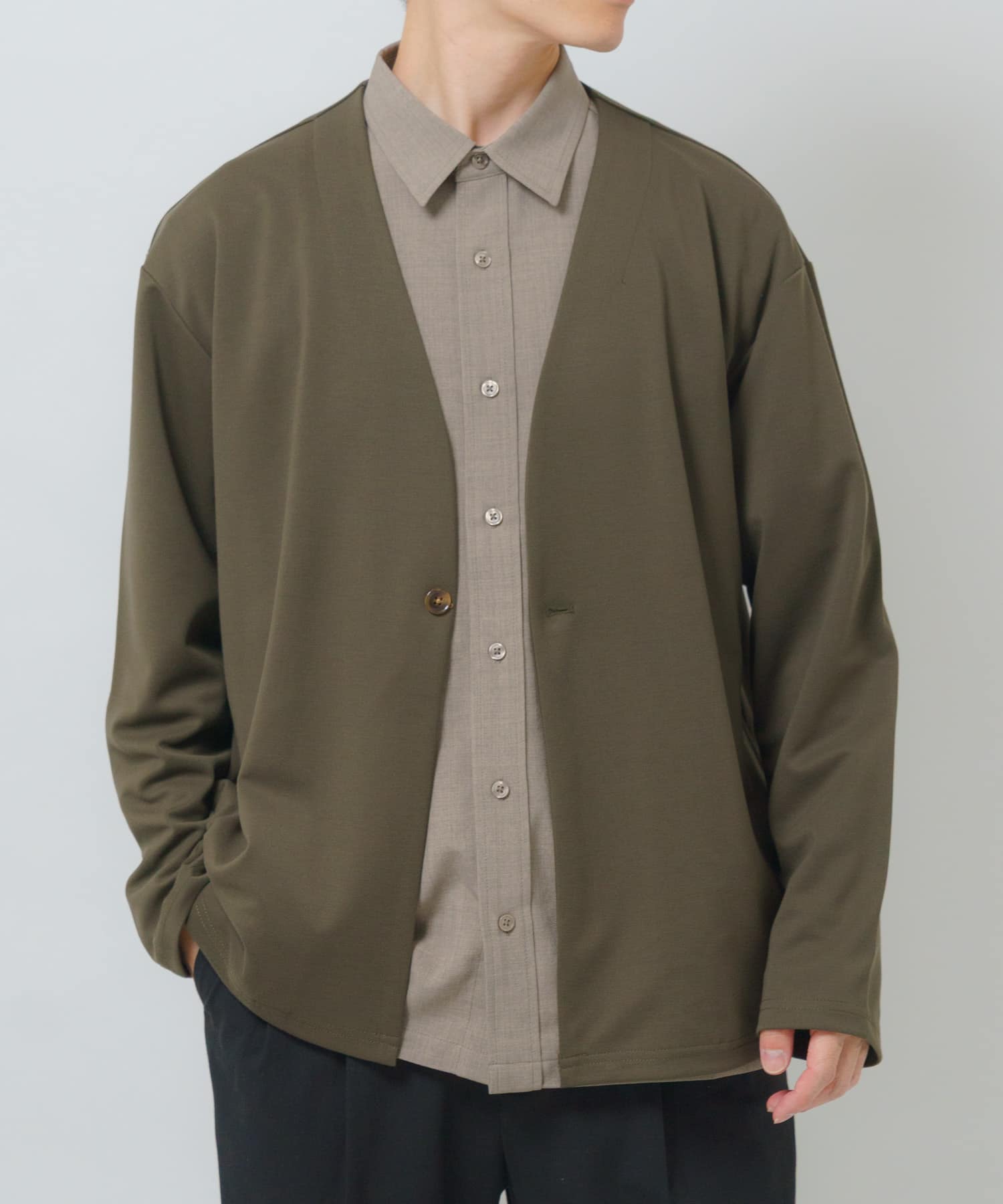 アウターは襟が付いていないノーラペルジャケットを使用しました。キレイめですが、抜け感を出すことができ、おすすめの商品です。SMART-airを使用しており、熱を吸収・放出することで長い期間快適な着心地を実現しております。