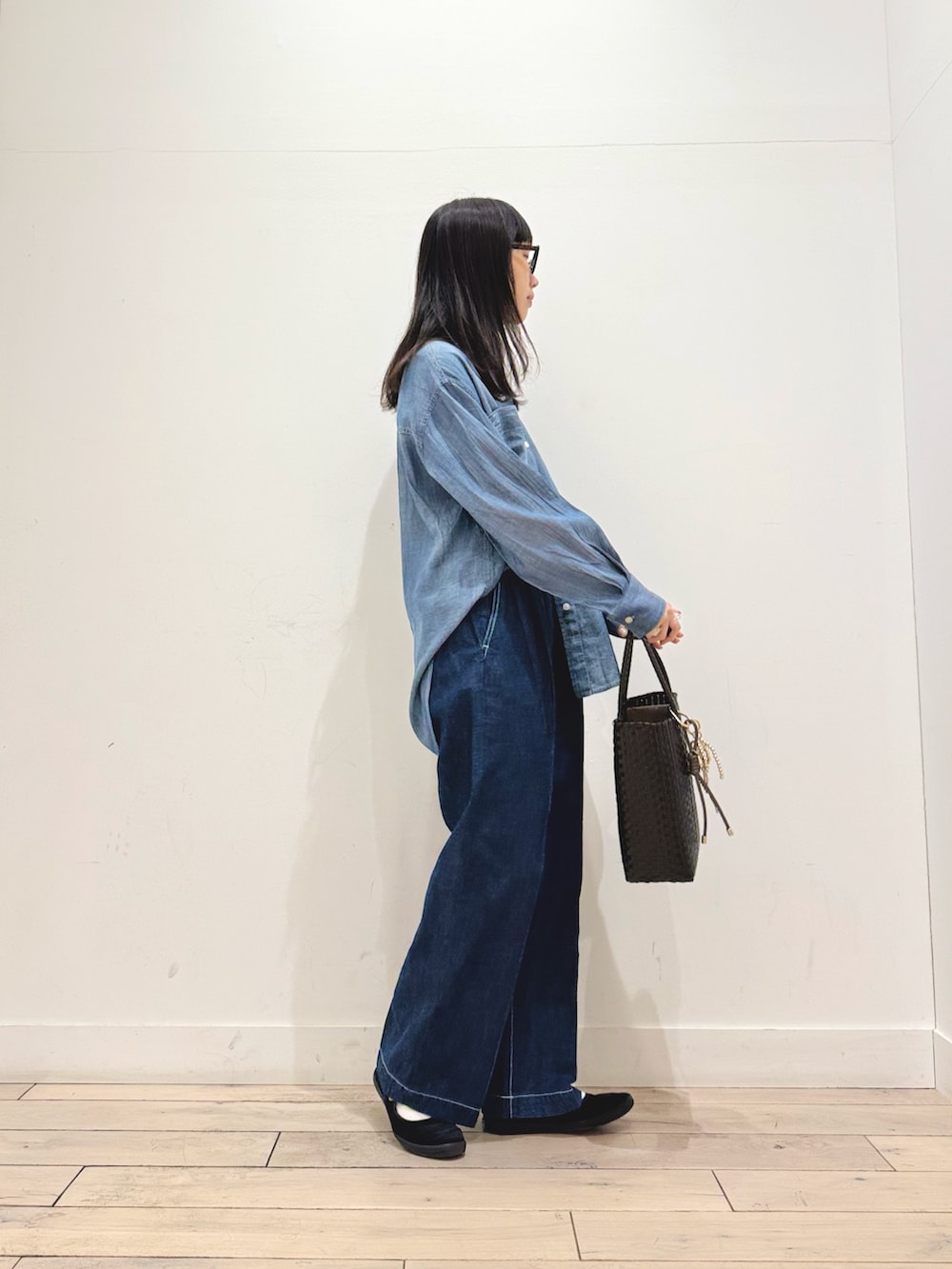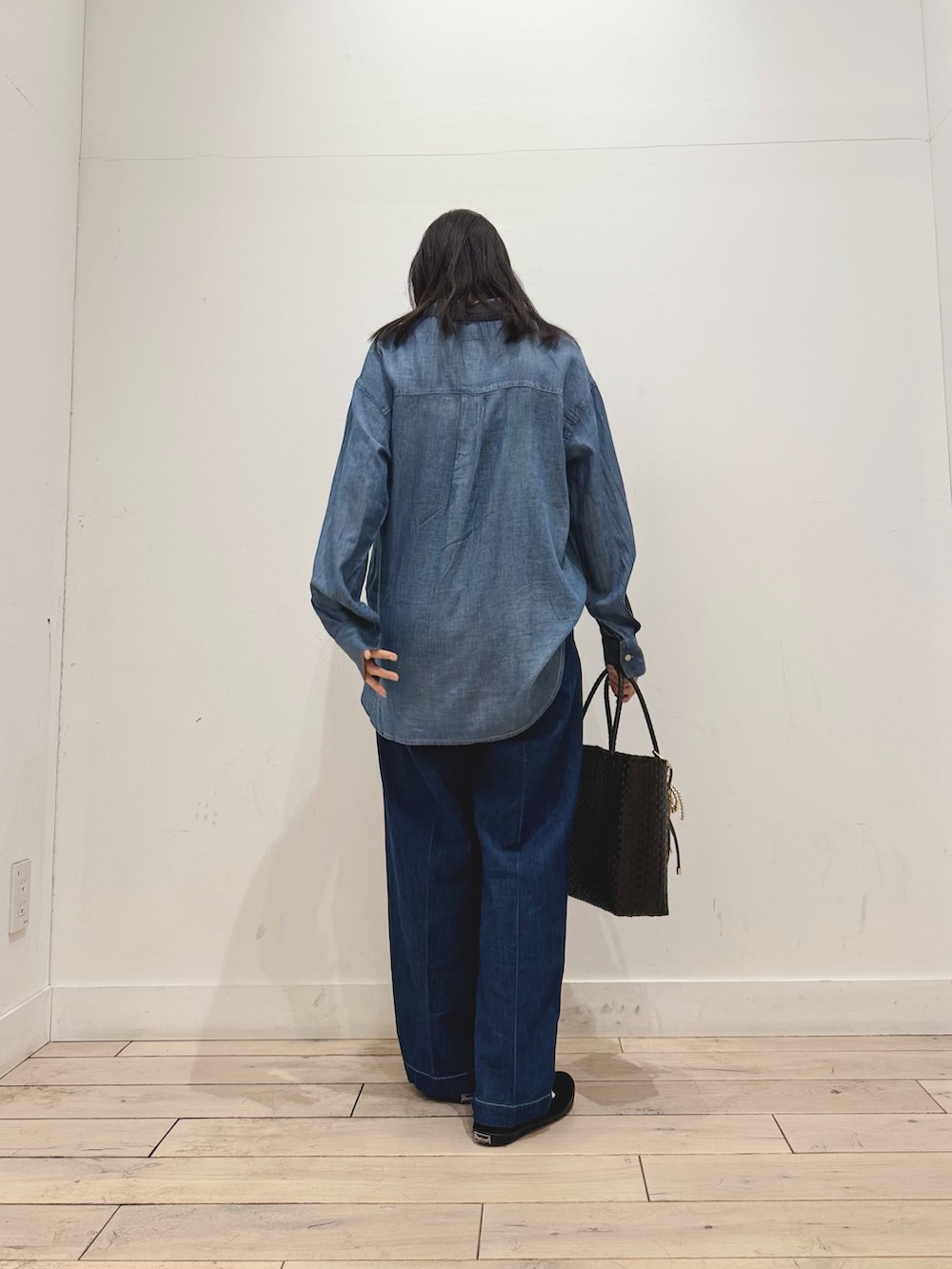 デニムonデニムですが、シャツはシアーシャツで程よい透け感のあるアイテムなのでデニムonデニム感が強くなく合わせられます👖