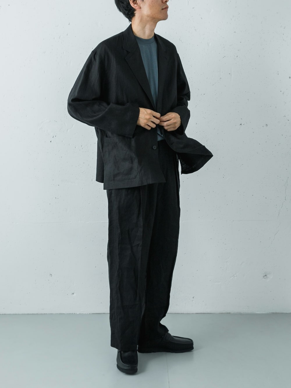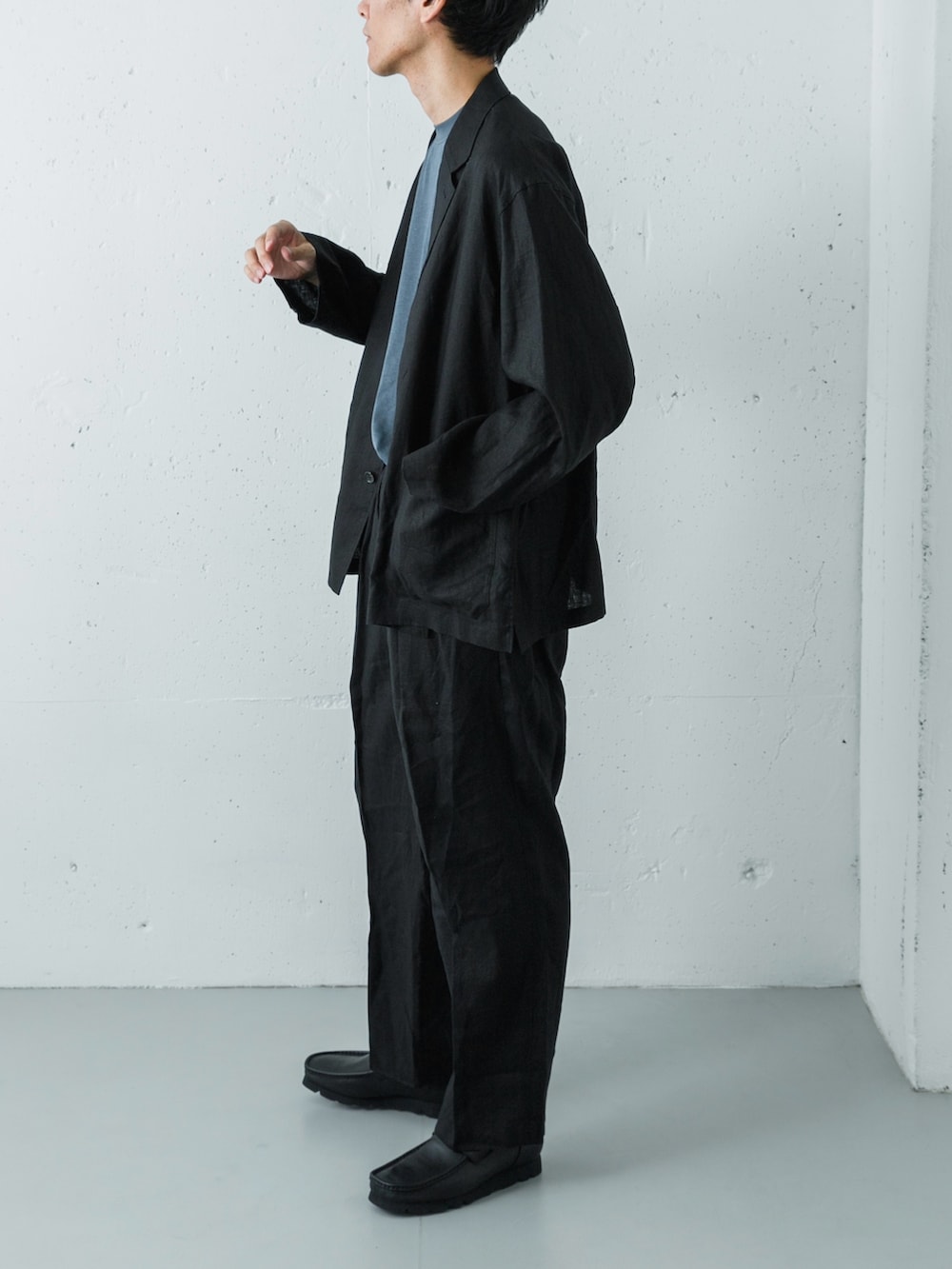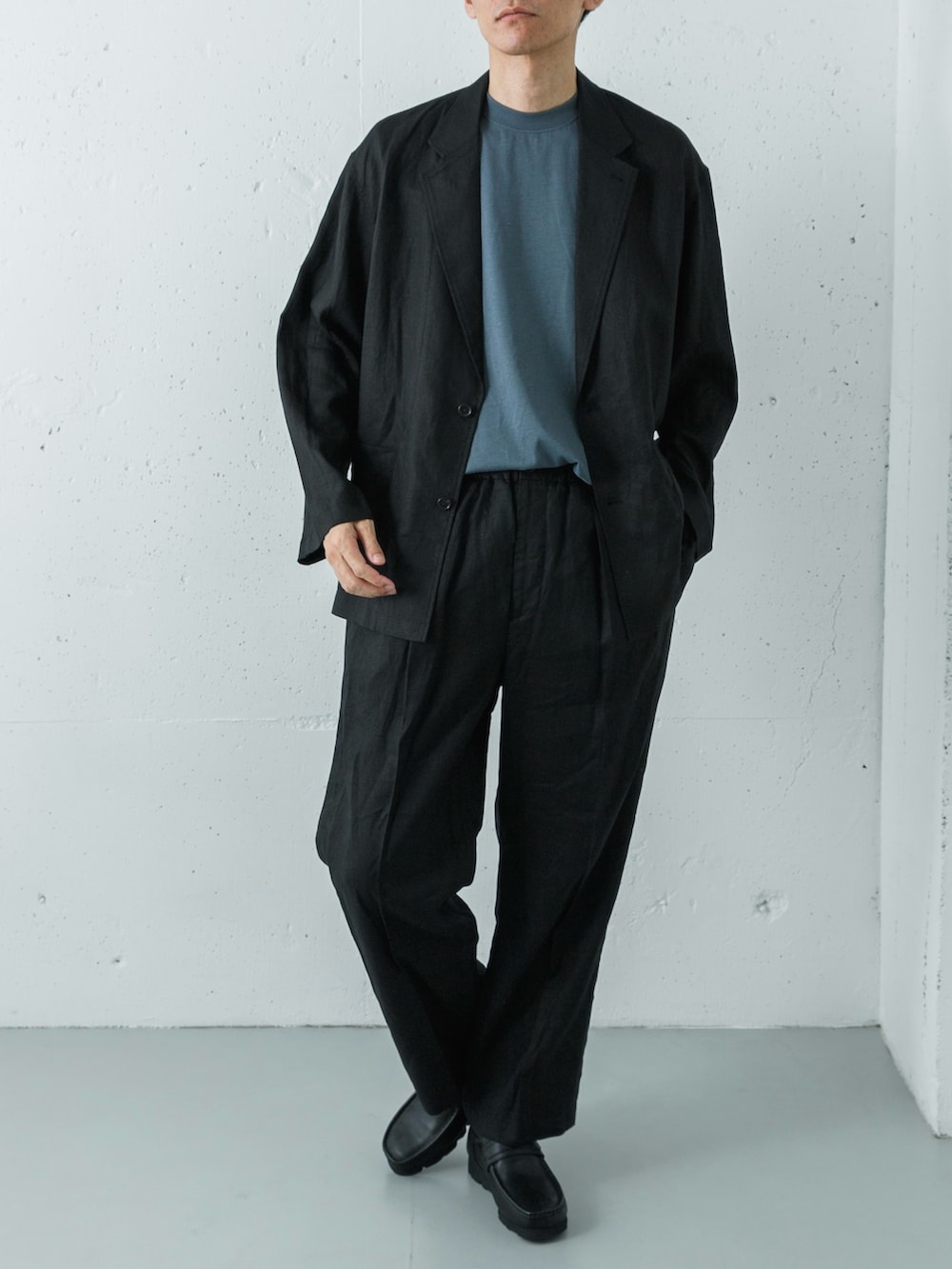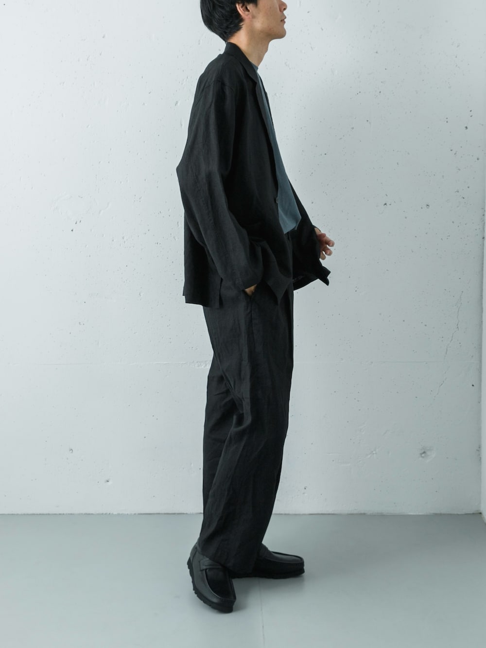 全体をダークトーンでまとめていますが、リネン特有のドライな風合いにより重く見えず、涼しげな抜け感が漂います。インナーには、ナイトグレーのスムージーTシャツをセレクト。接触冷感と防シワ機能を備えており、暑い時期でも快適かつ品のあるルックスをキープできます。