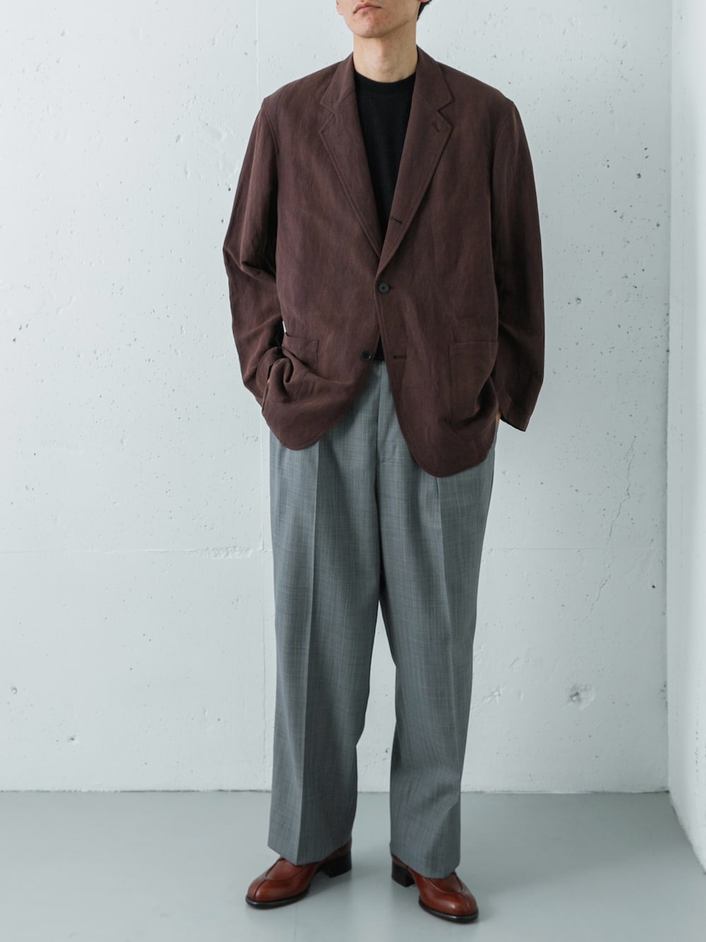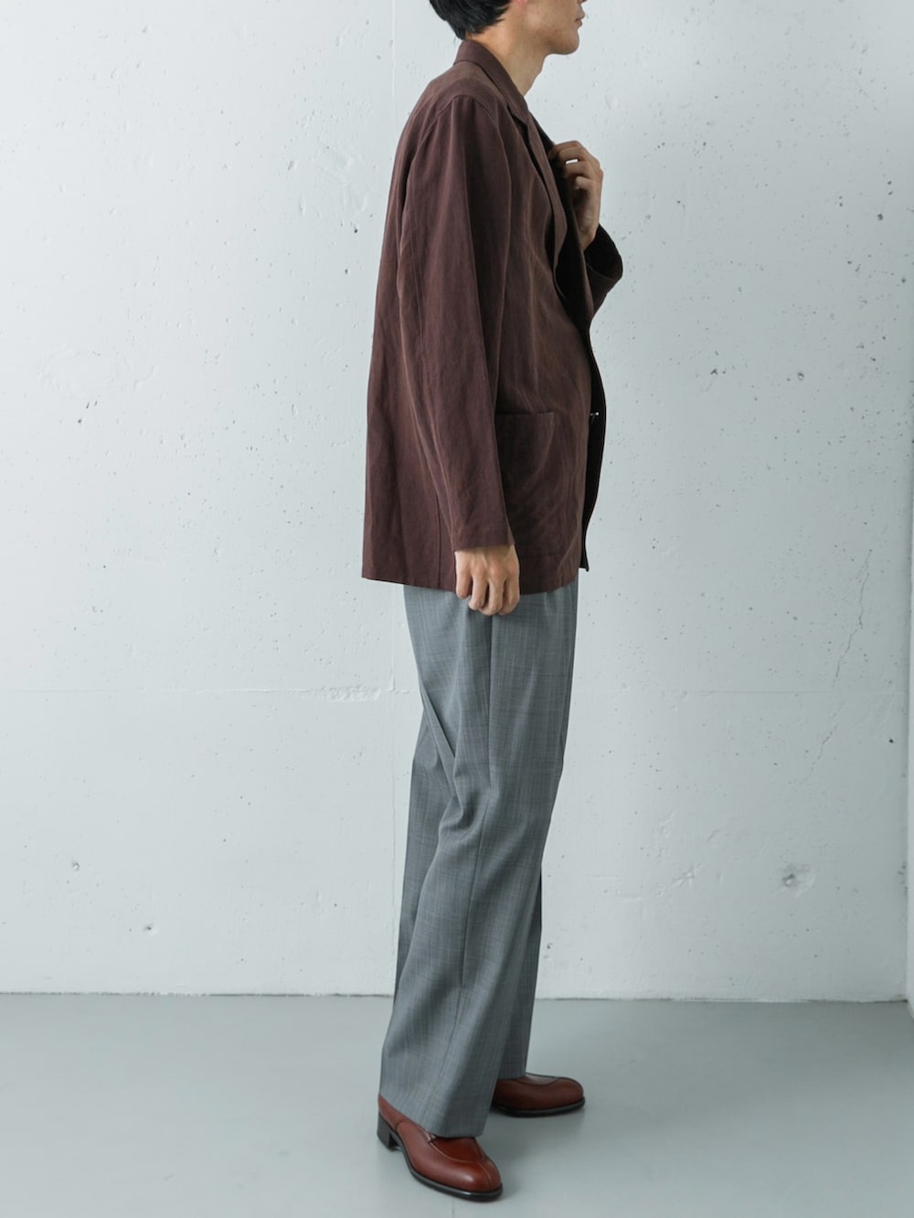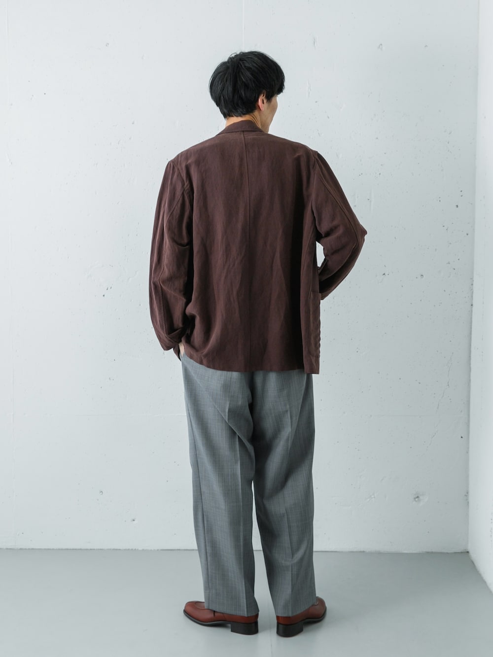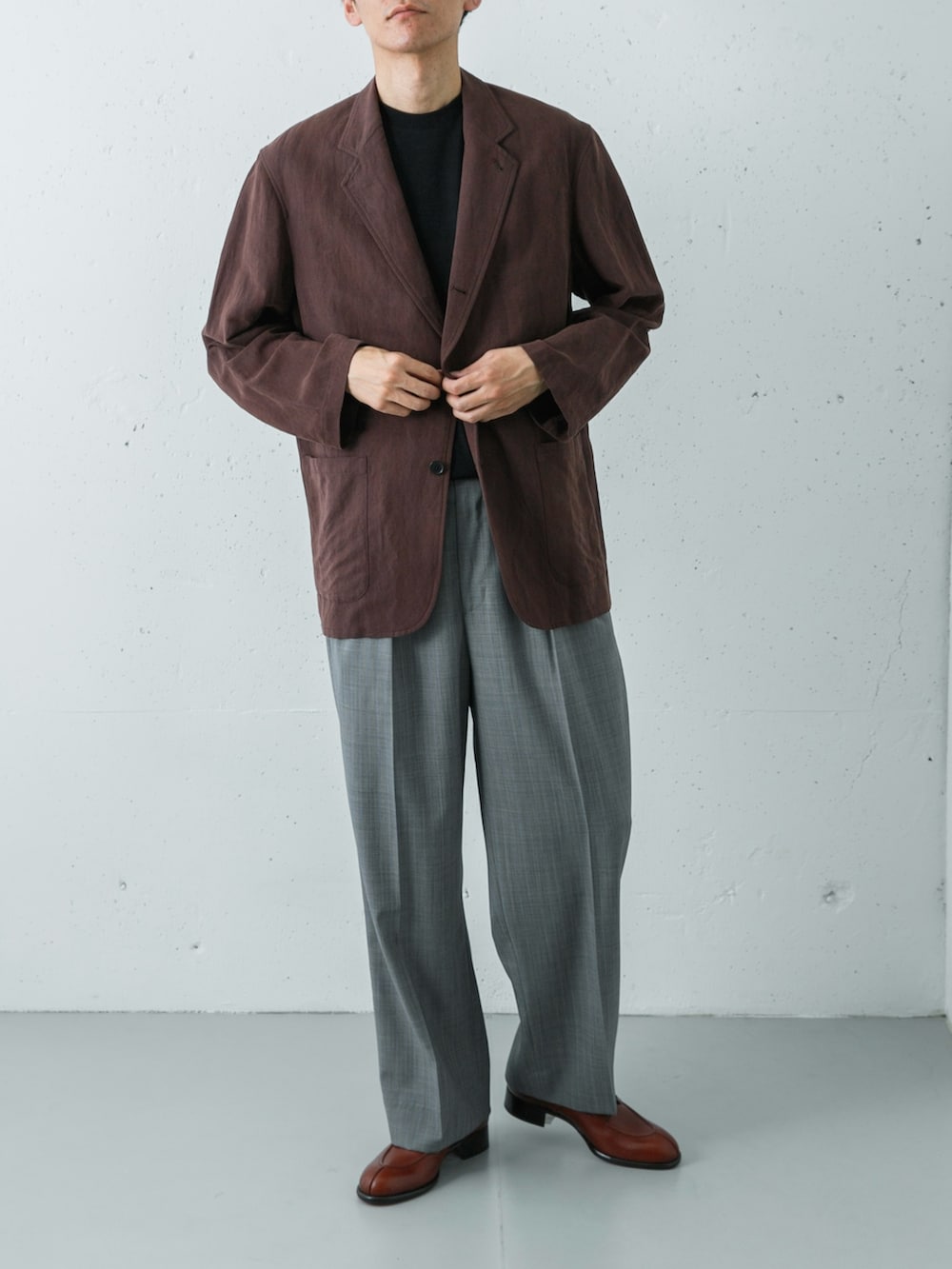 最大の魅力は、シルクの上品な艶とリネンの清涼感を併せ持つアウターの極上なテクスチャー。そこへクラシカルなヘリンボーン柄のグレーパンツを合わせることで、軽快さの中にも知的な落ち着きと品格が生まれます。
